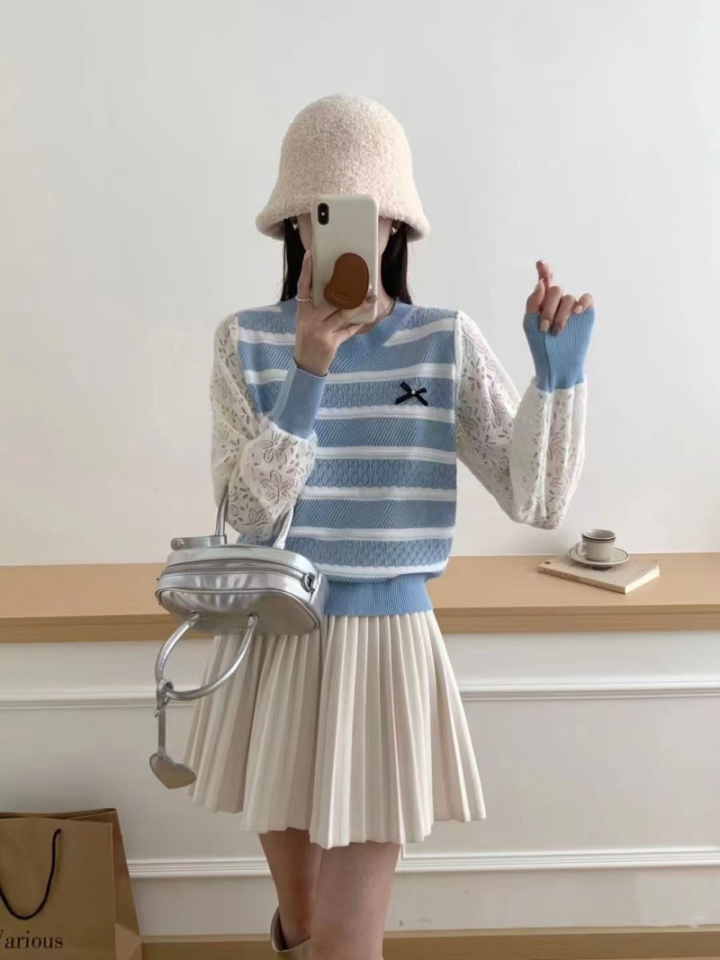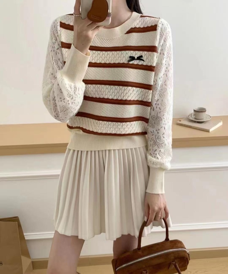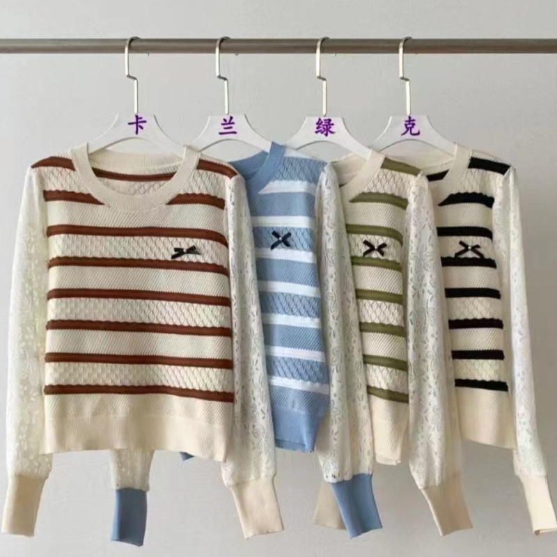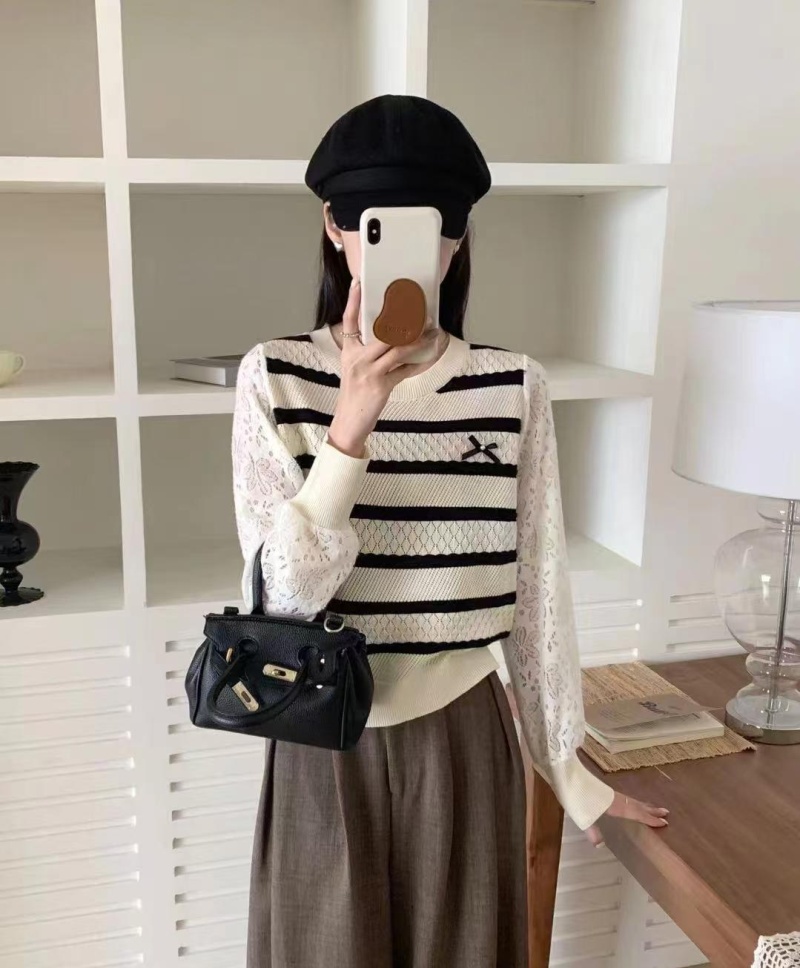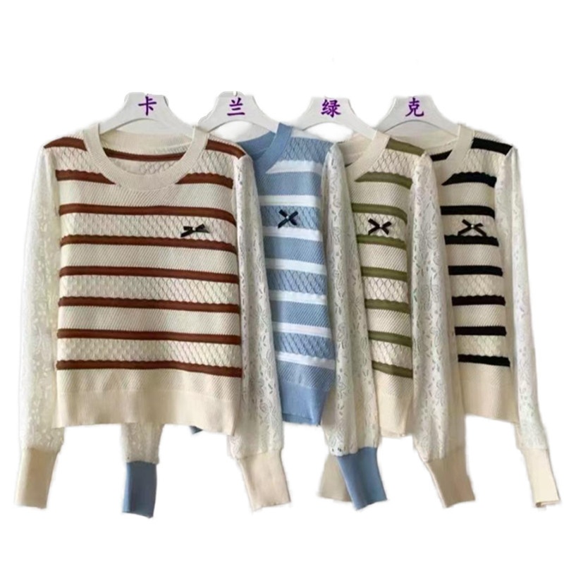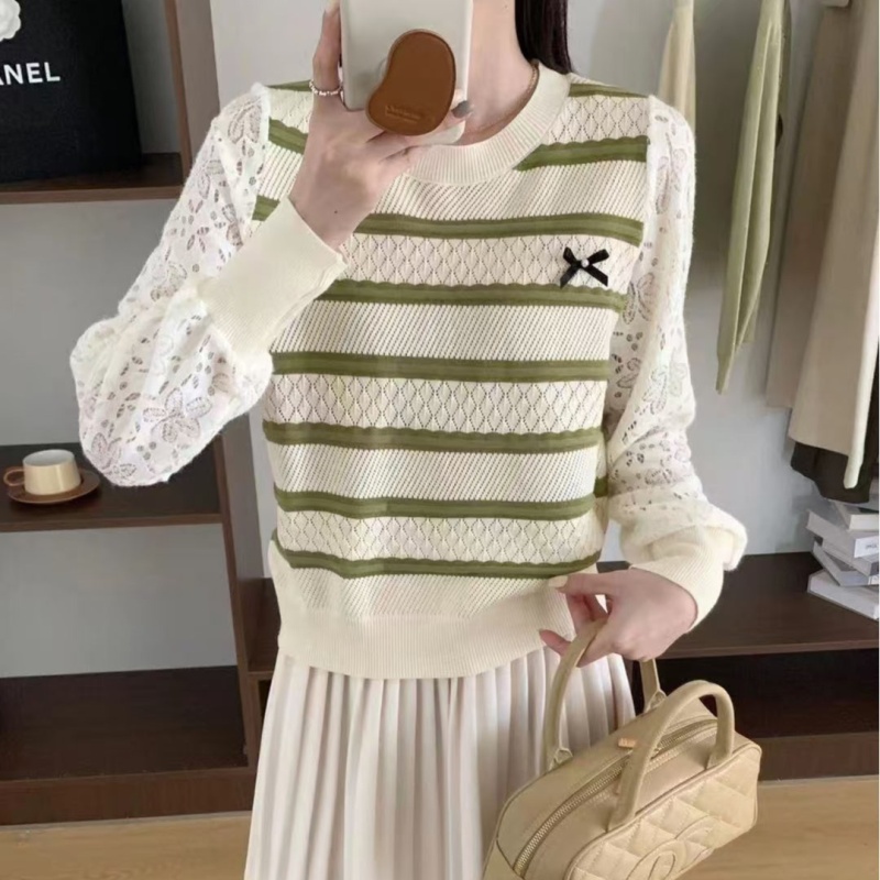 2024秋冬新款时尚圆领条纹拼接针织上衣洋气百搭套头打底短款毛衣