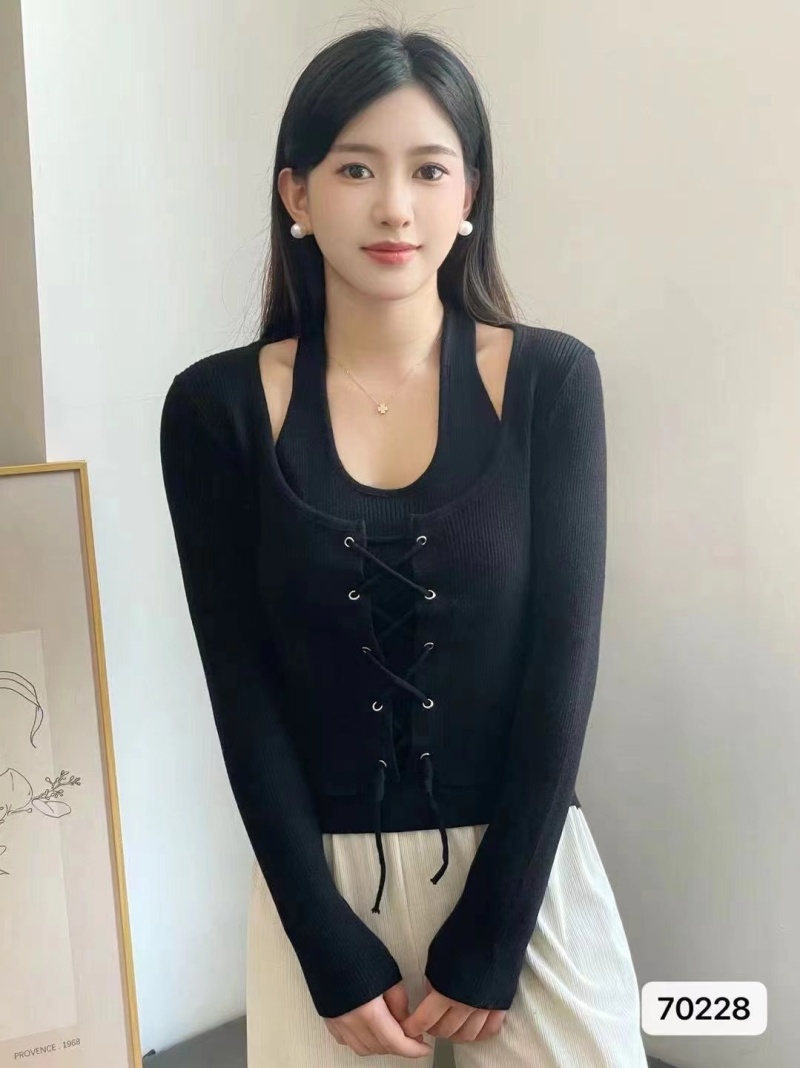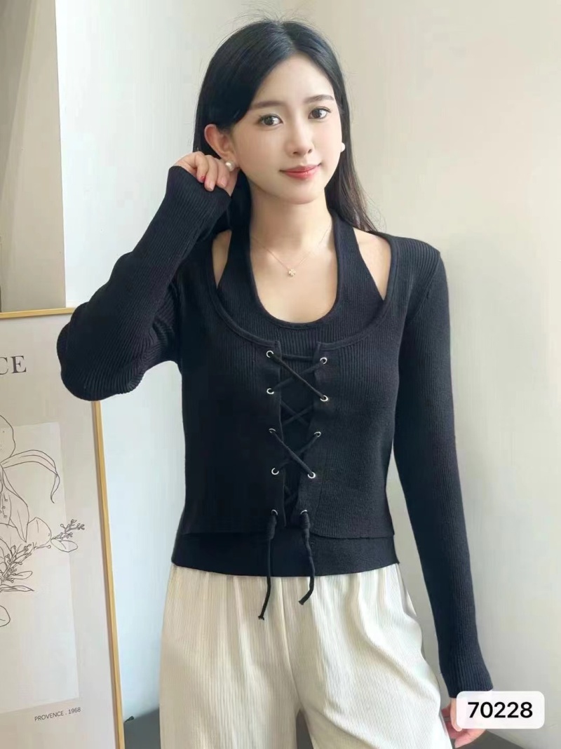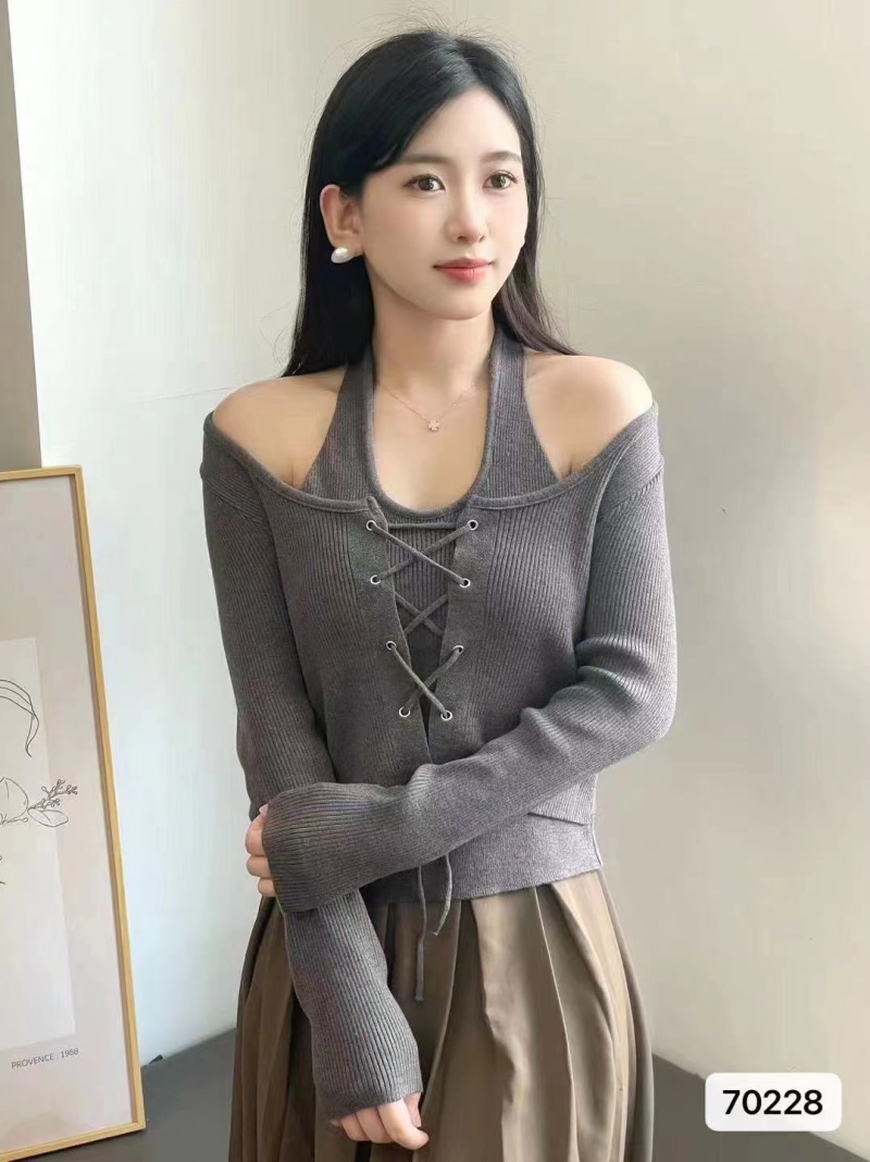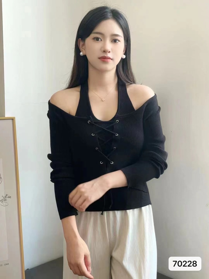 2024秋冬新款韩版百搭挂脖露肩性感气质系带假两件长袖短款上衣女