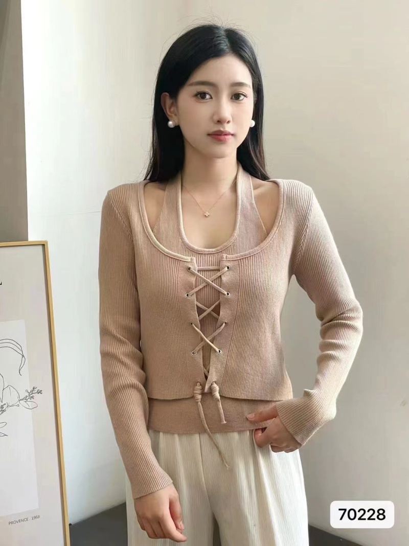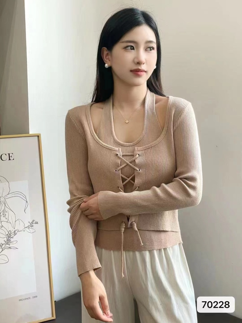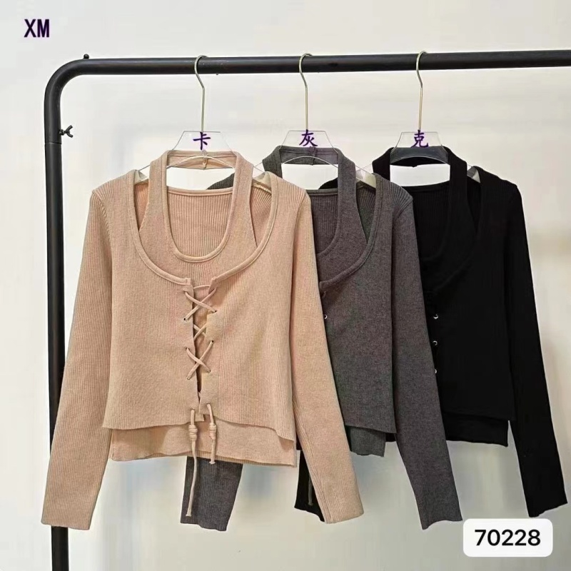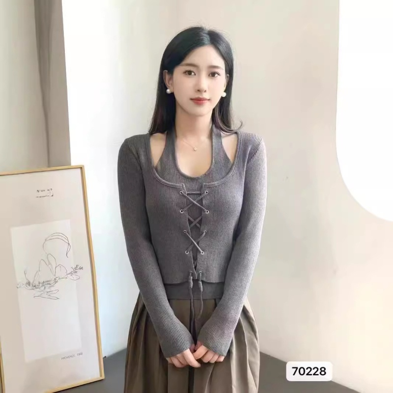 2024秋冬新款韩版百搭挂脖露肩性感气质系带假两件长袖短款上衣女