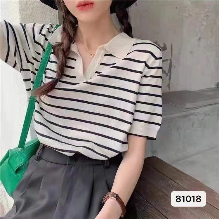 超火复古洋气简约条纹V领百搭短袖冰丝polo衫薄款针织衫上衣女潮