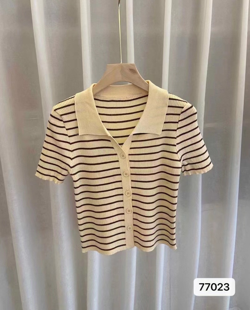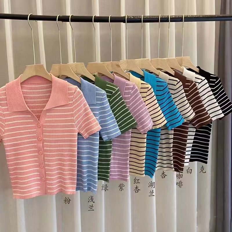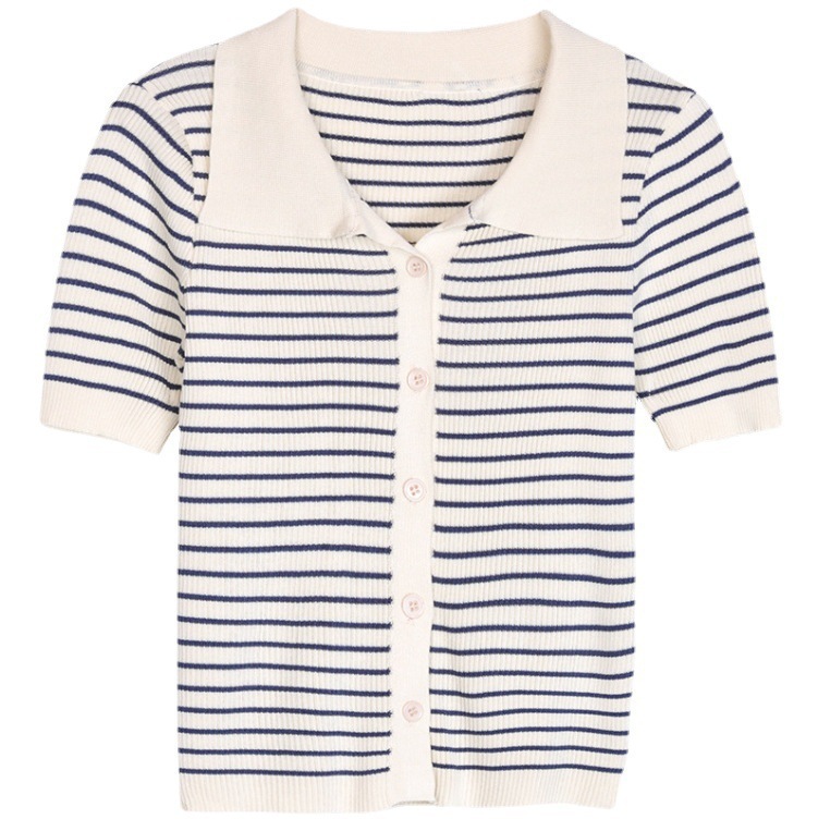 2024年新款设计感小众小个子短袖上衣条纹针织衫女polo领短款乙鸟