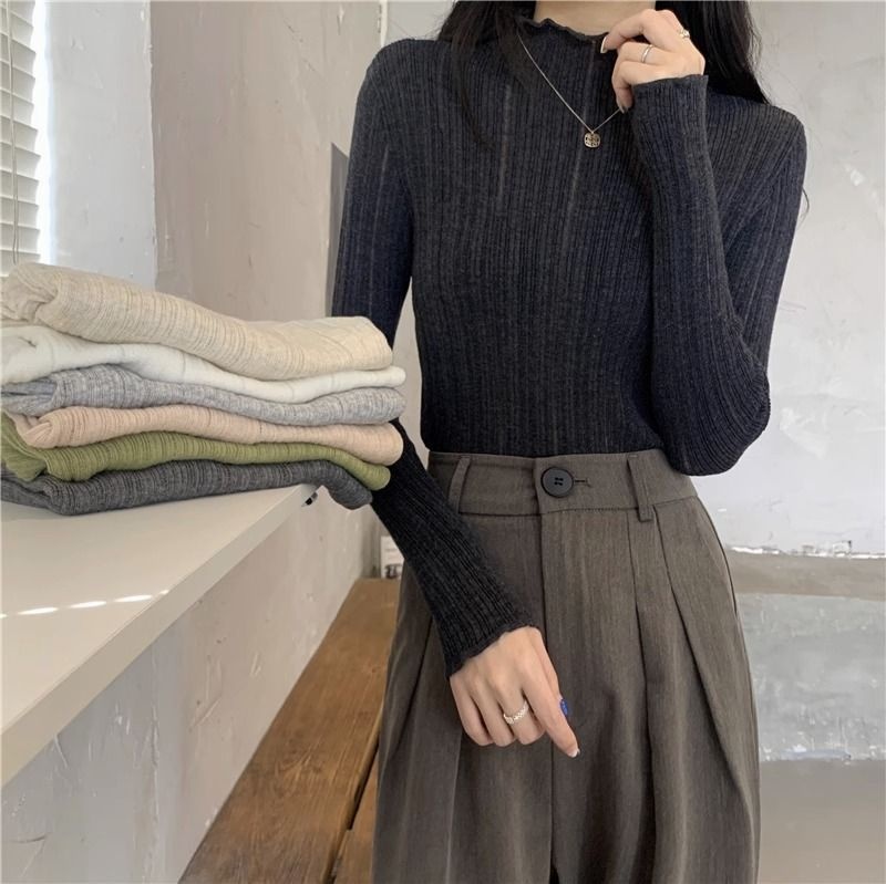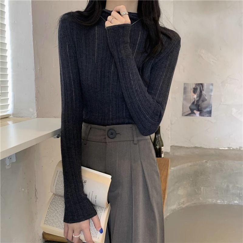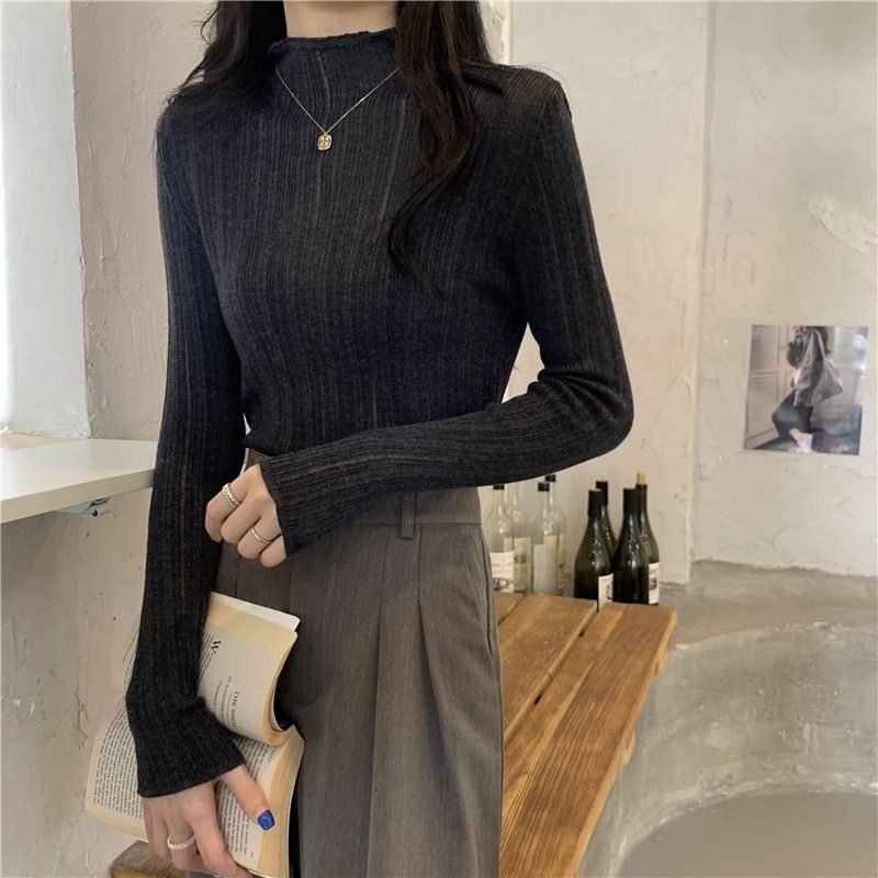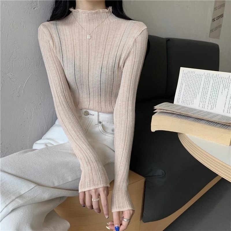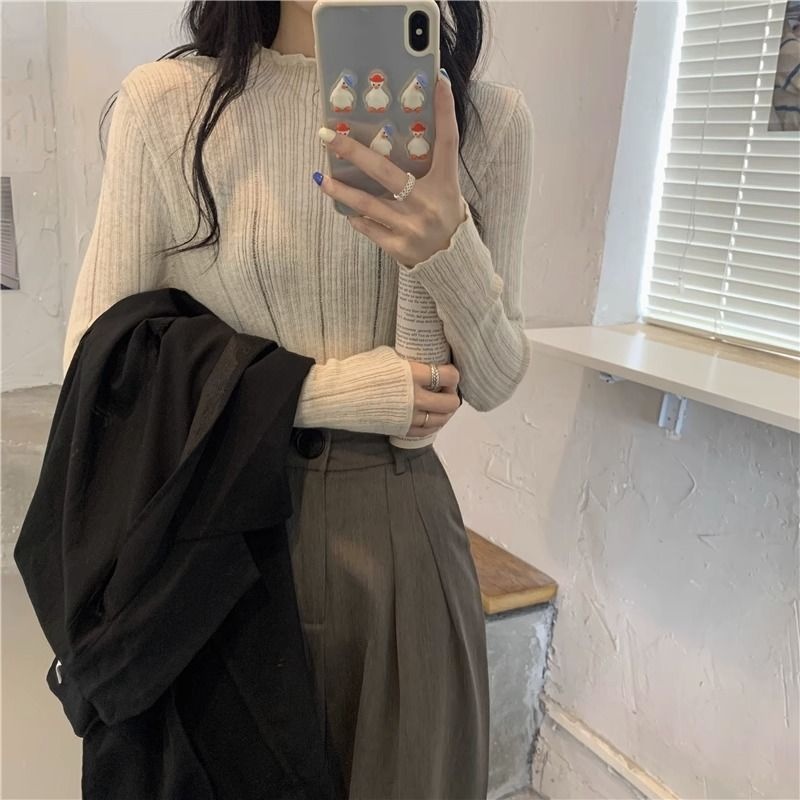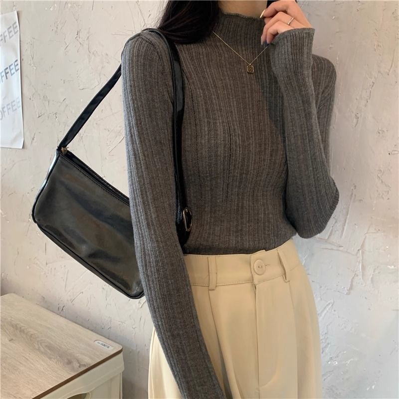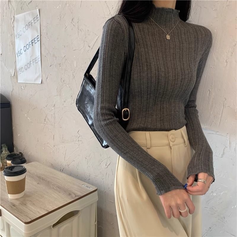秋冬新款气质半高领长袖针织衫女法式复古日系慵懒修身百搭打底衫