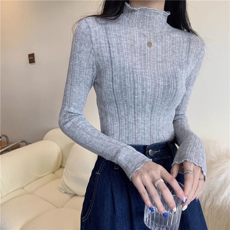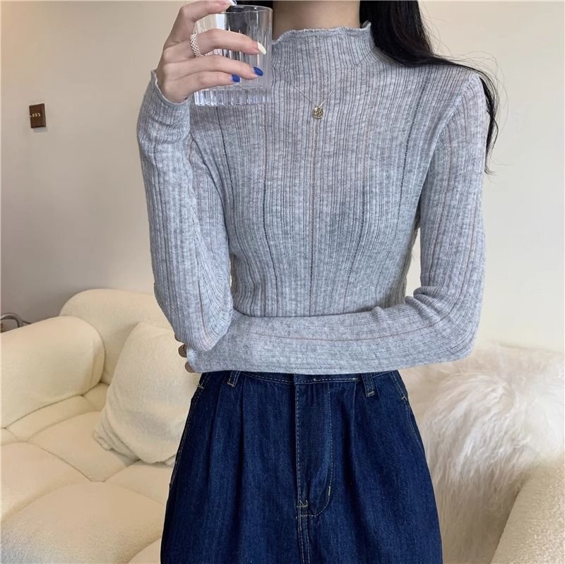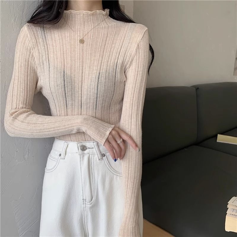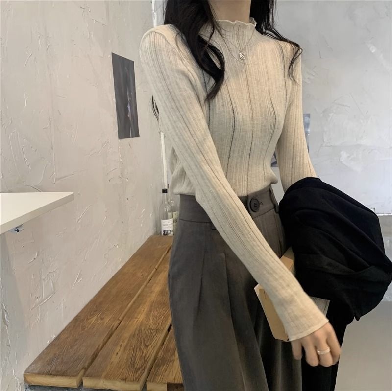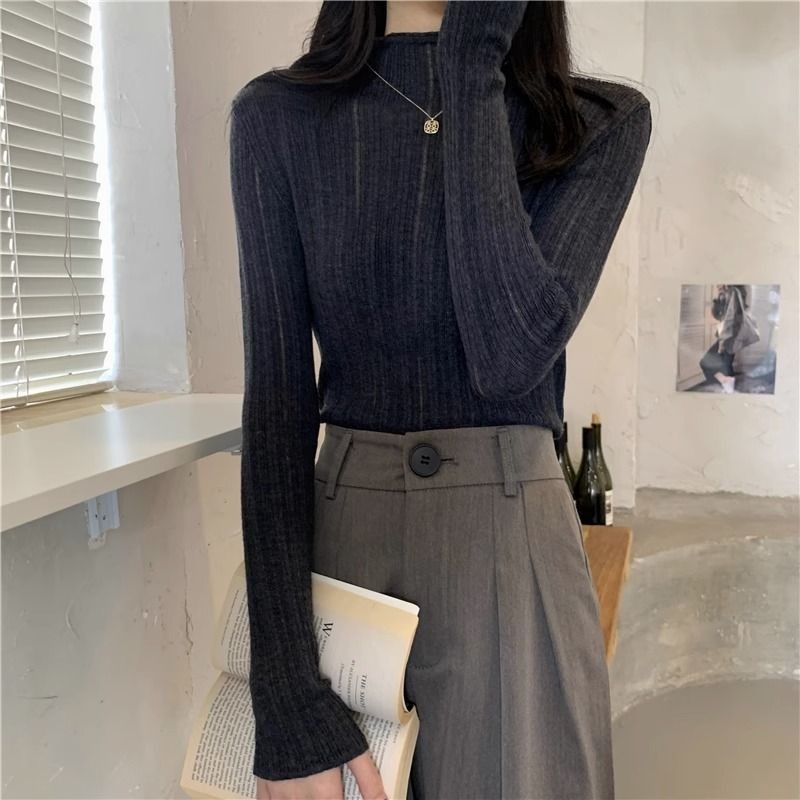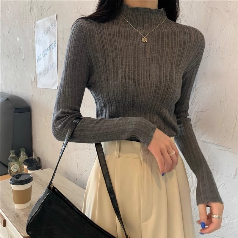秋冬新款气质半高领长袖针织衫女法式复古日系慵懒修身百搭打底衫