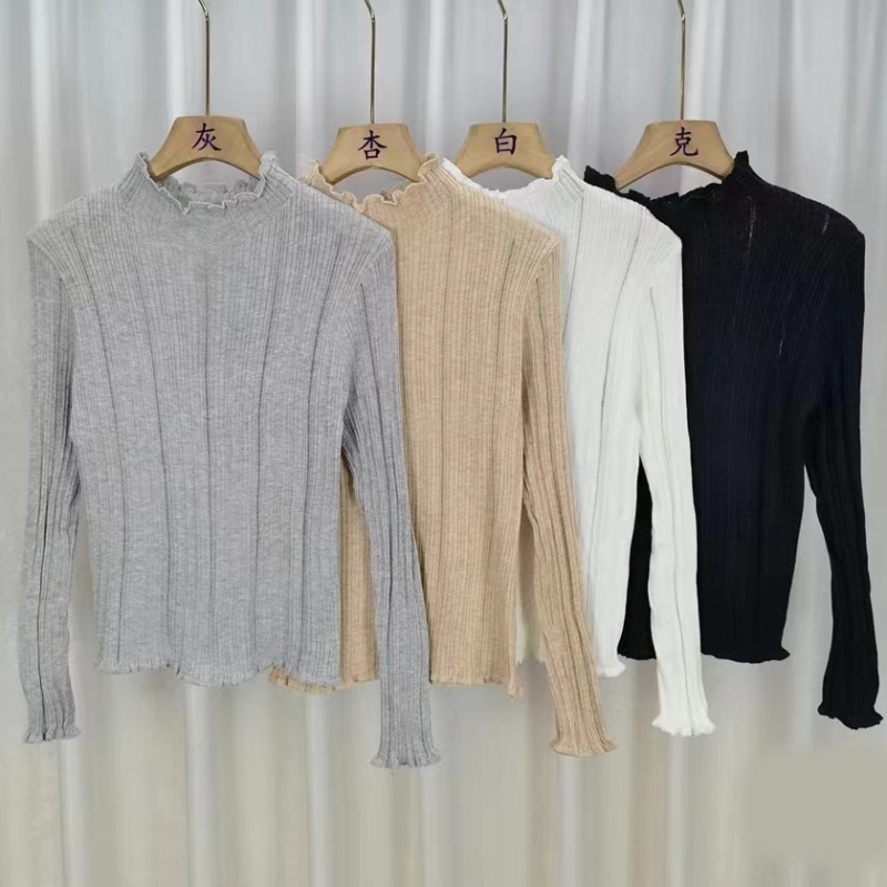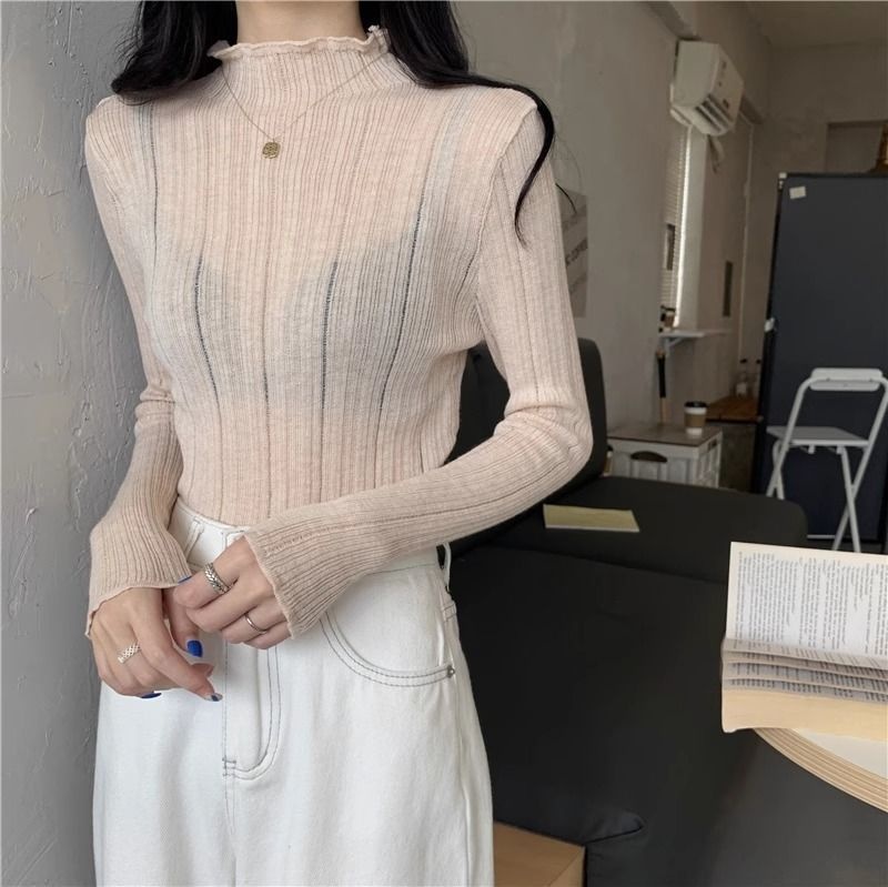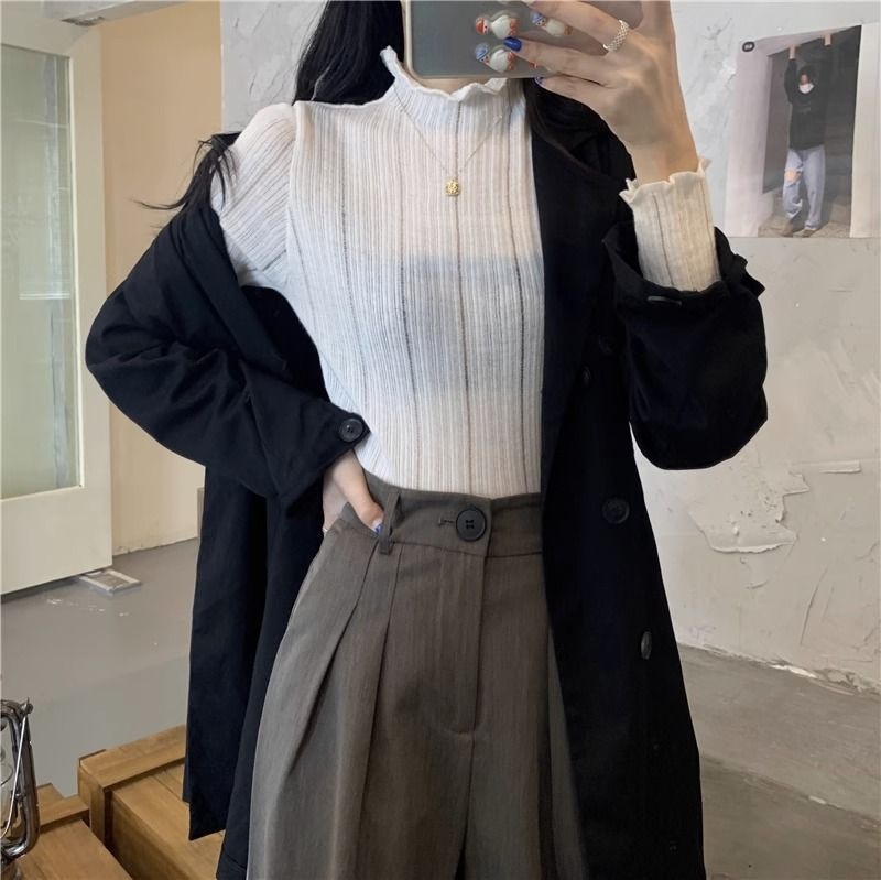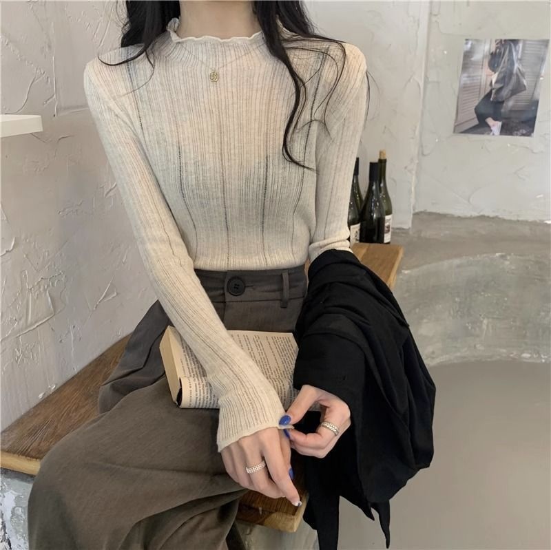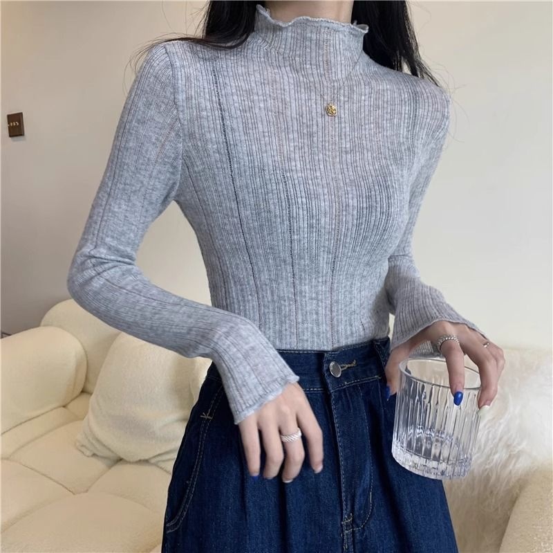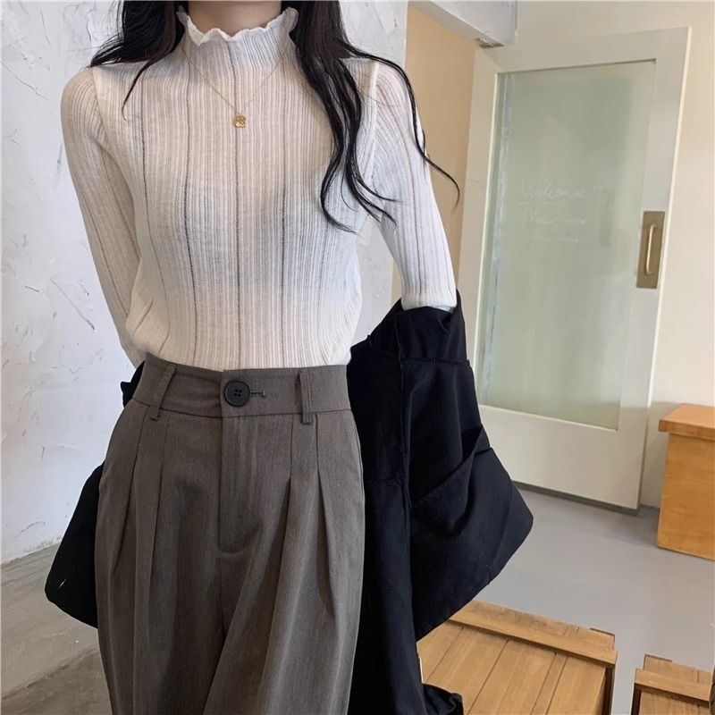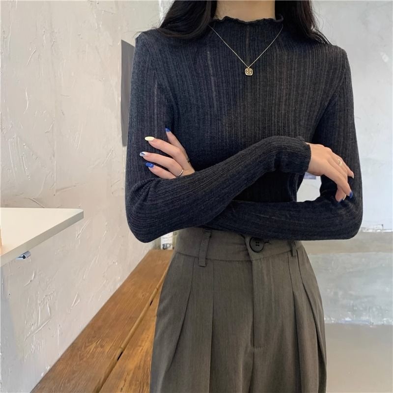 秋冬新款气质半高领长袖针织衫女法式复古日系慵懒修身百搭打底衫