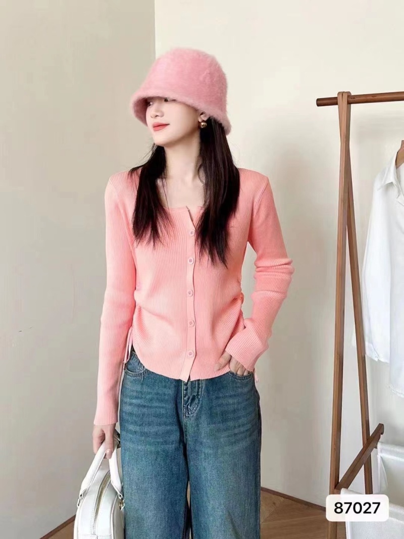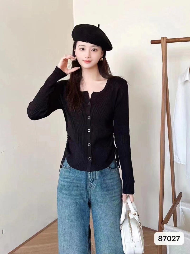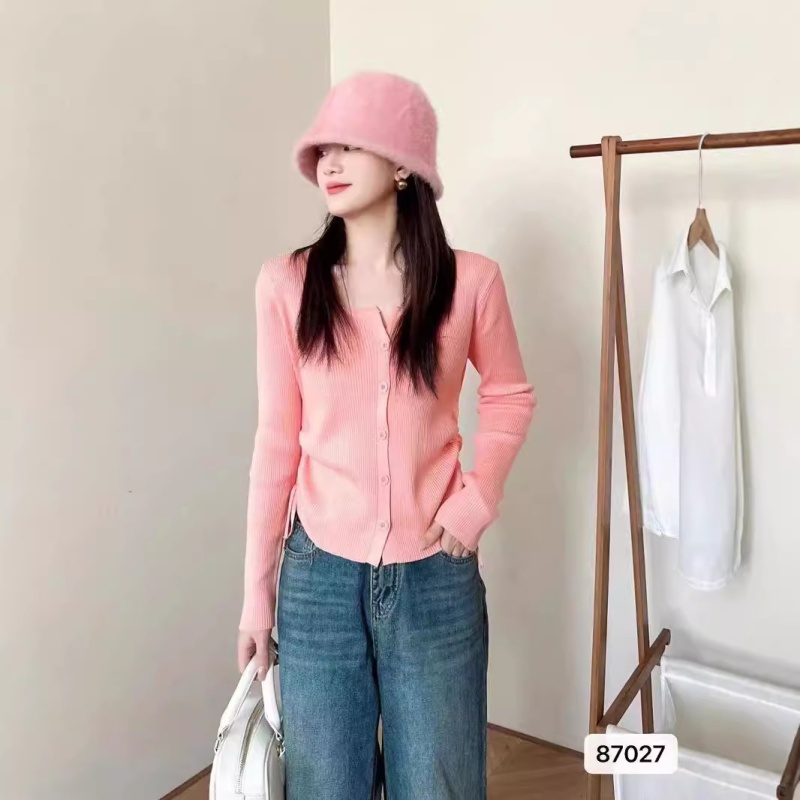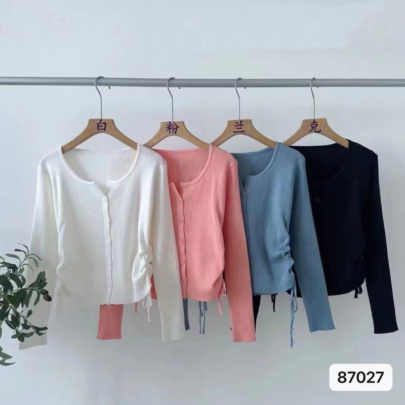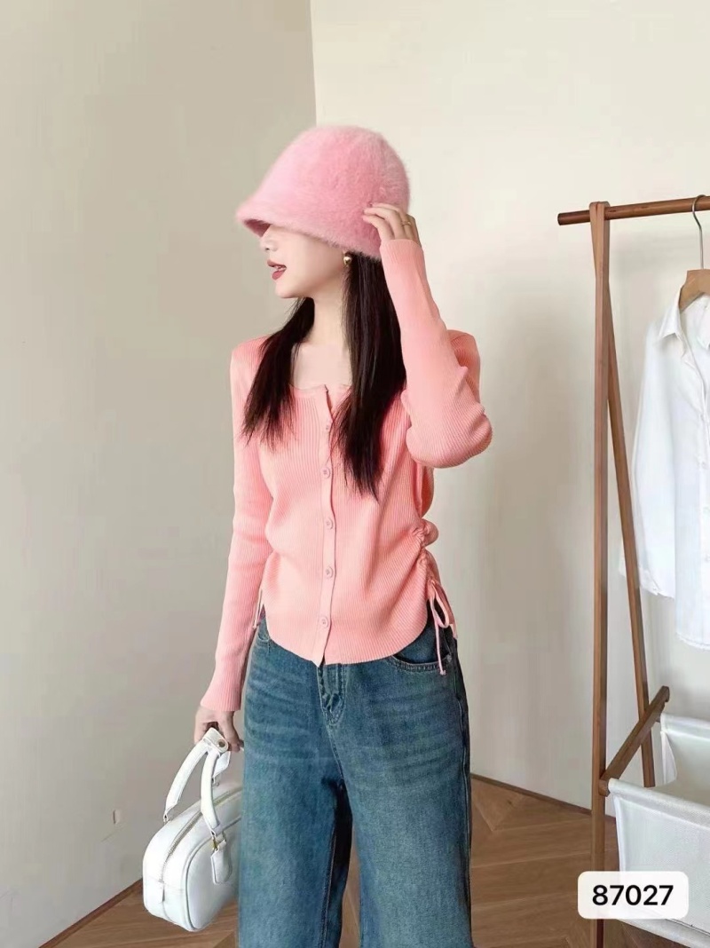 2024秋冬新款百搭韩版简约V领坑条两侧抽绳显瘦长袖开衫上衣女潮