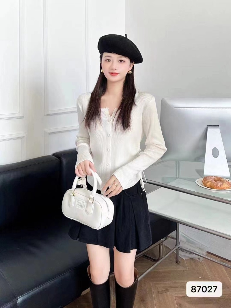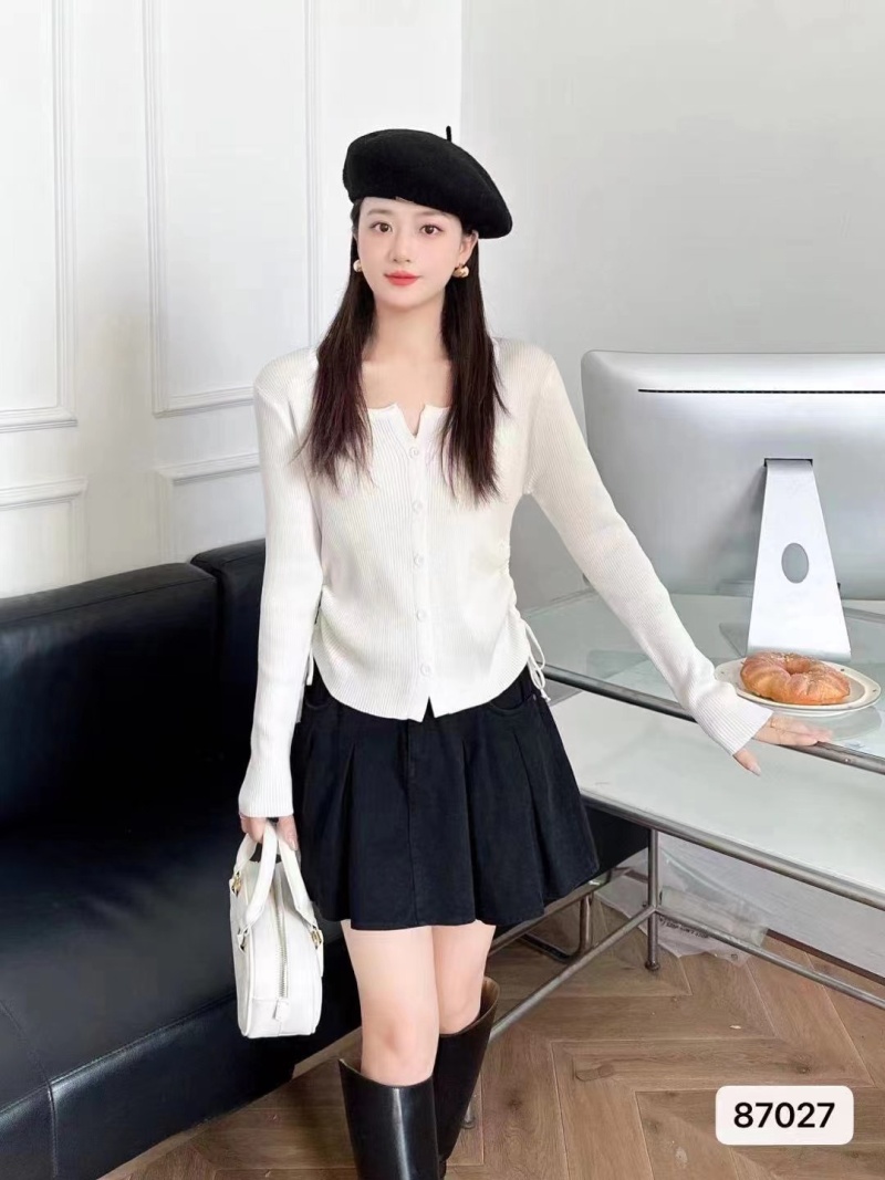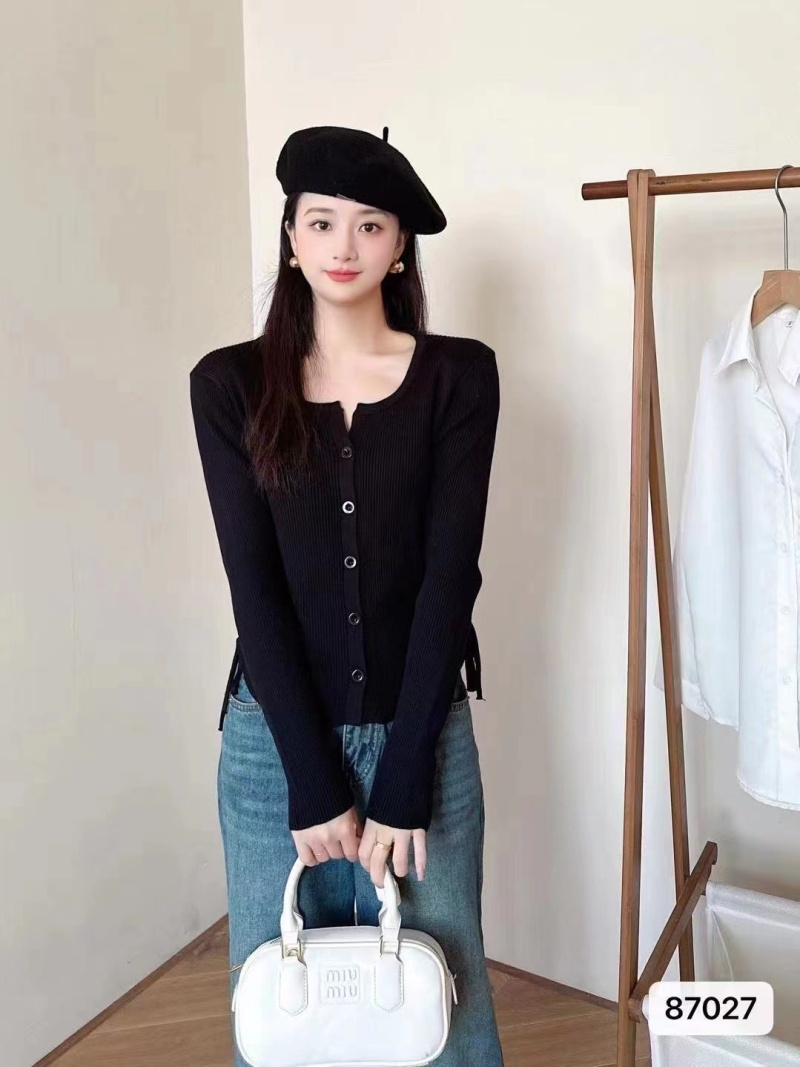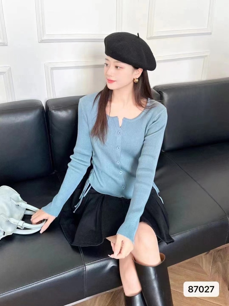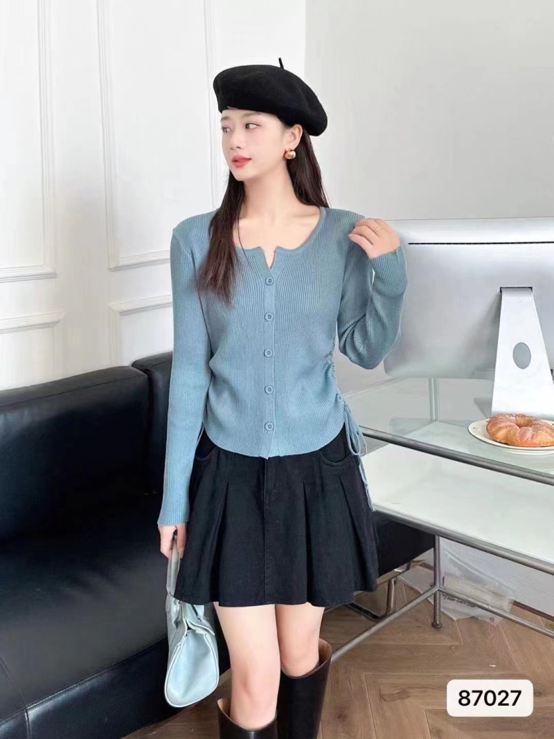 2024秋冬新款百搭韩版简约V领坑条两侧抽绳显瘦长袖开衫上衣女潮
