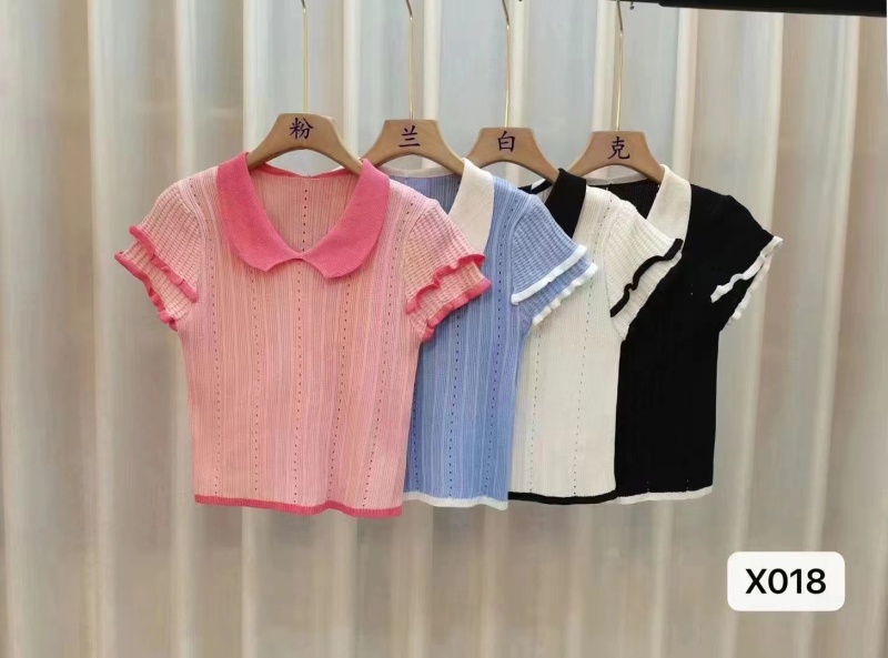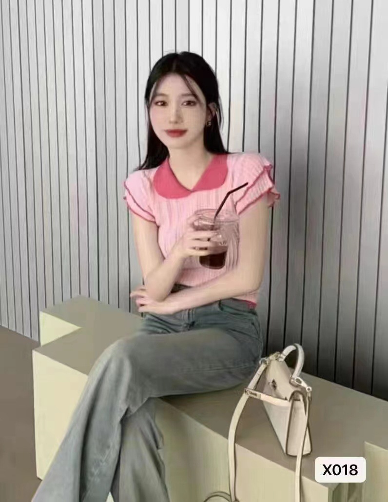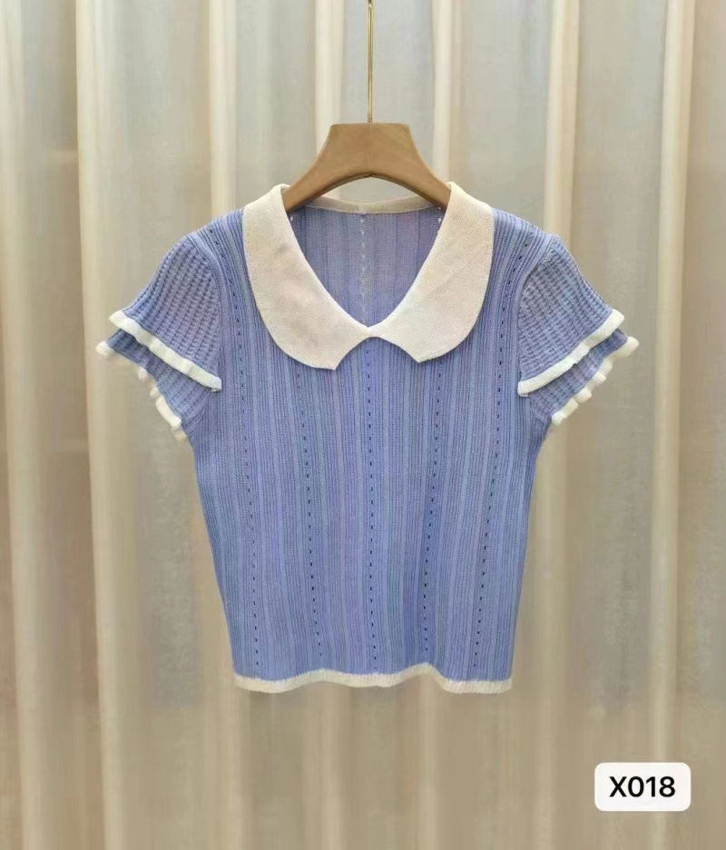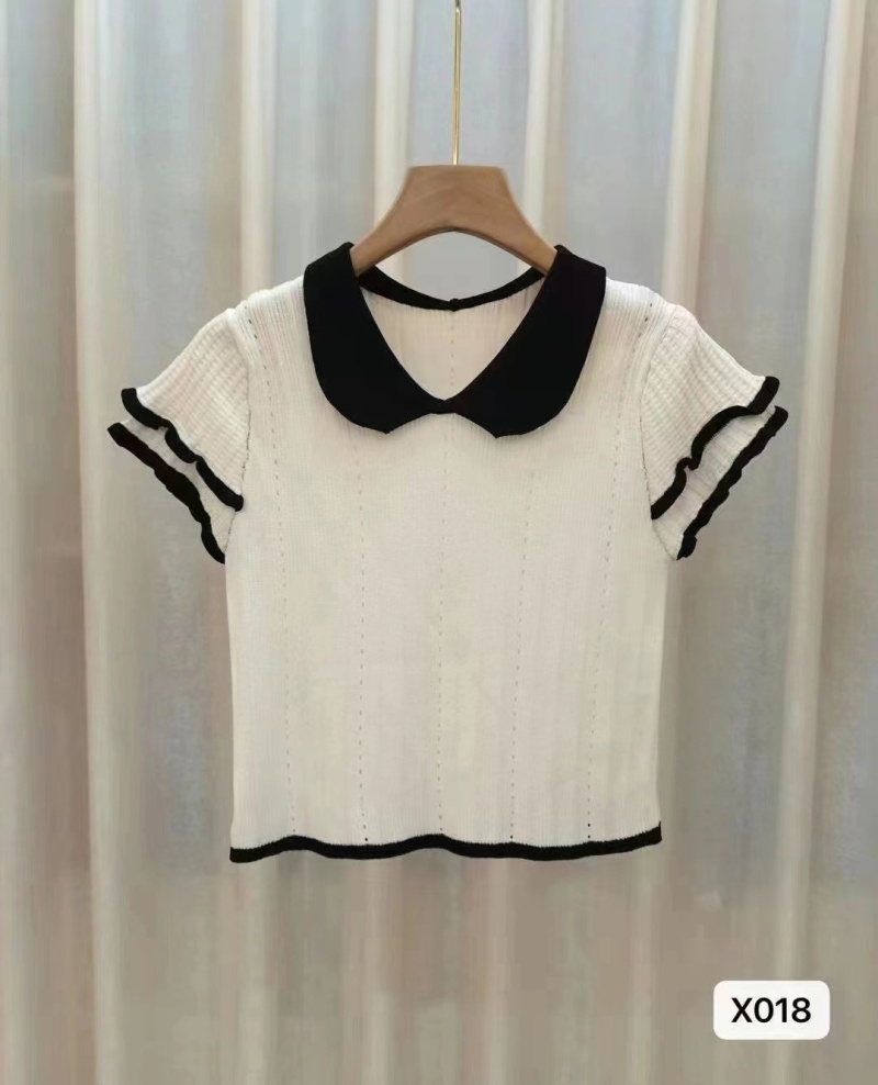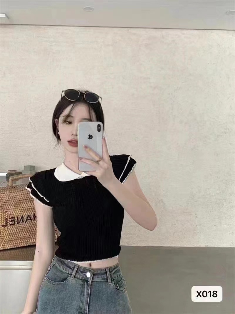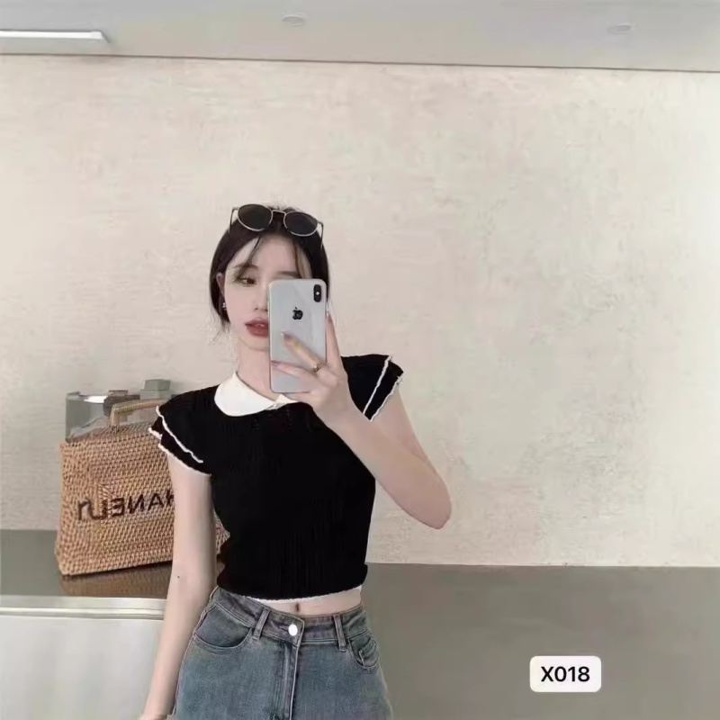 2024夏季新款甜美清新设计感甜酷风翻领撞色双层飞飞袖短款上衣女
