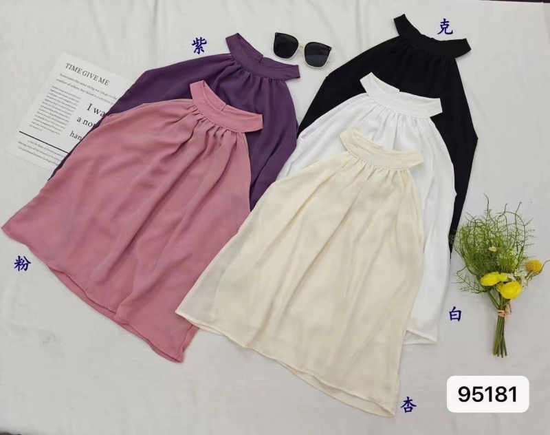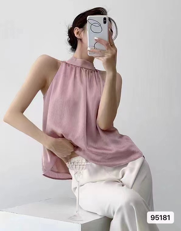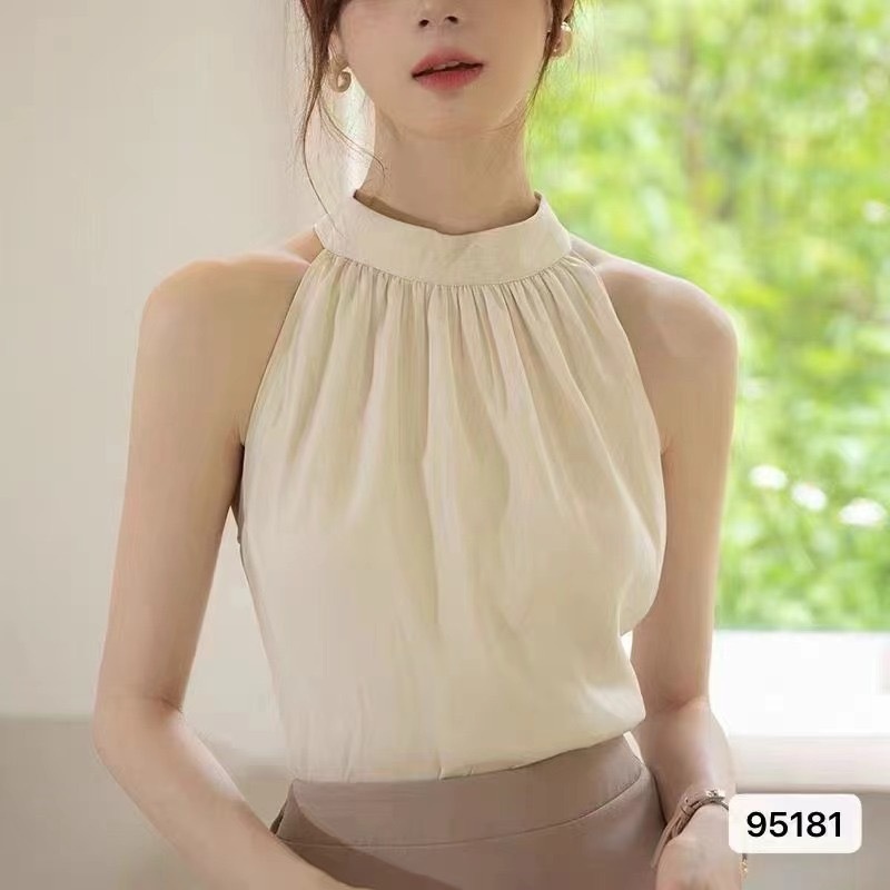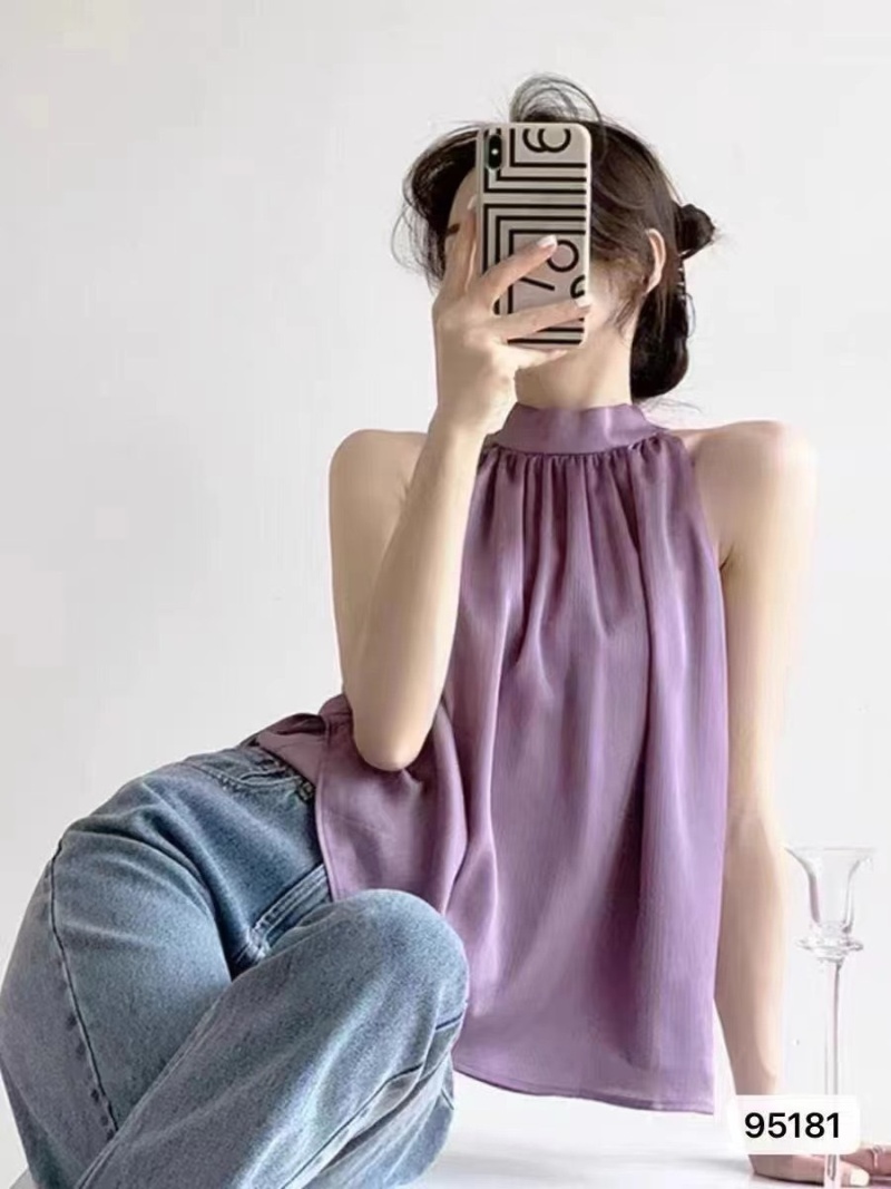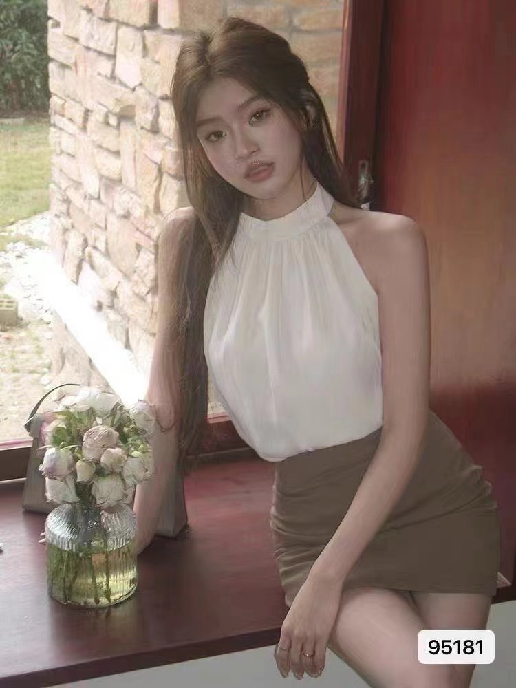 2024夏季新款优雅气质甜美清新挂脖背部镂空纽扣设计背心短款上衣