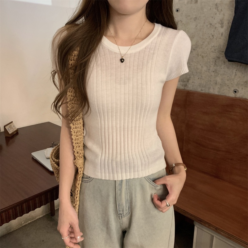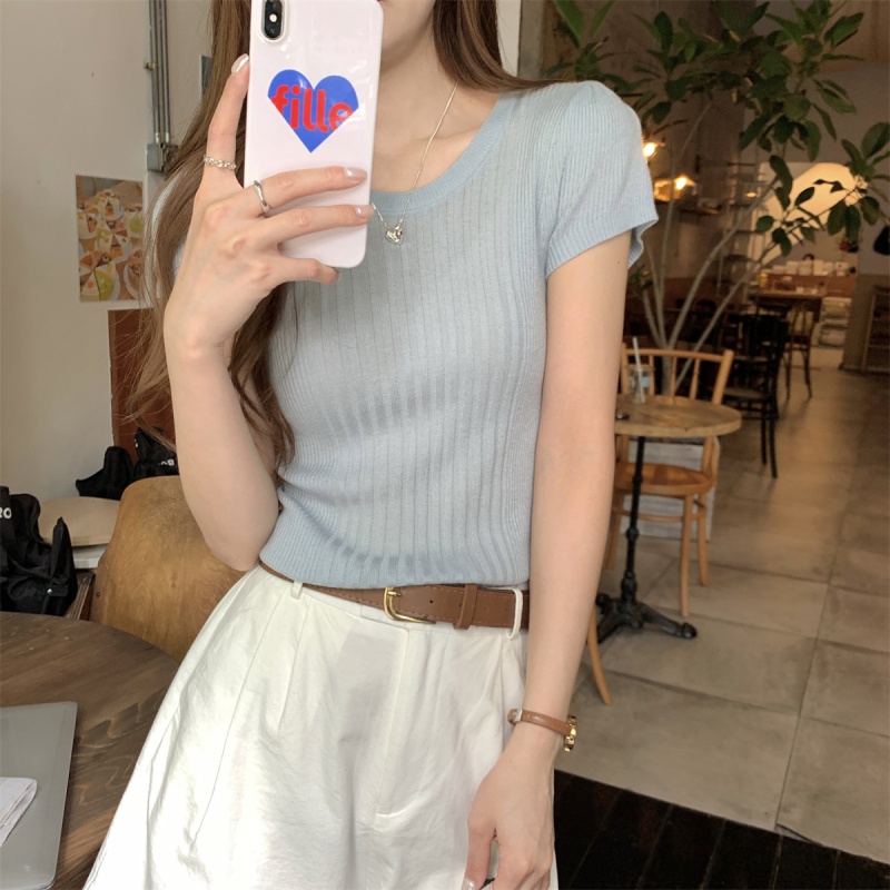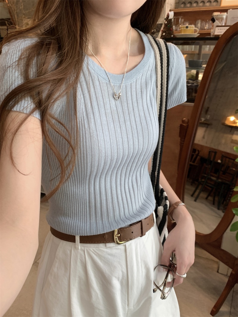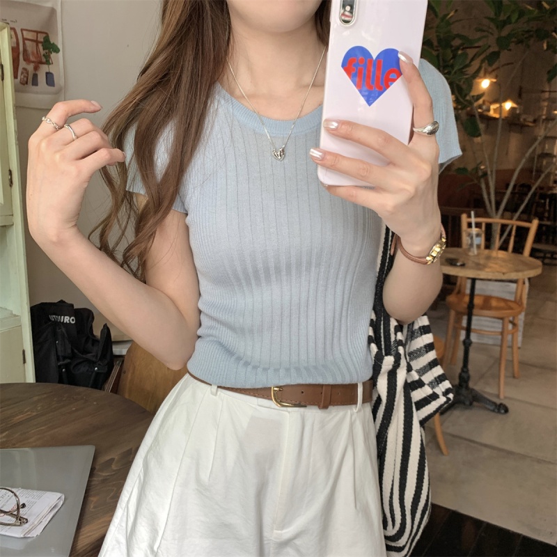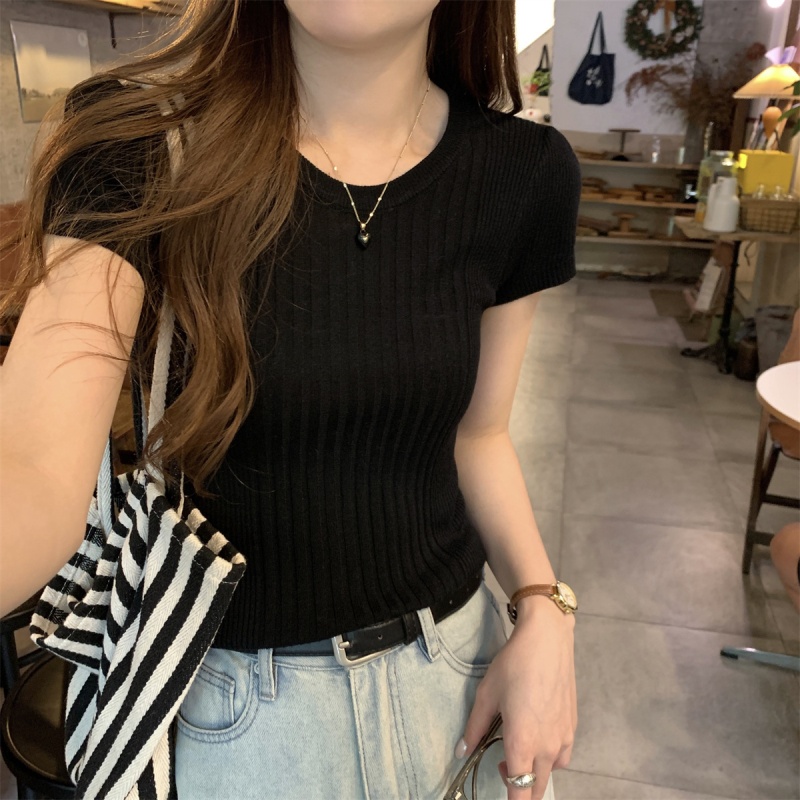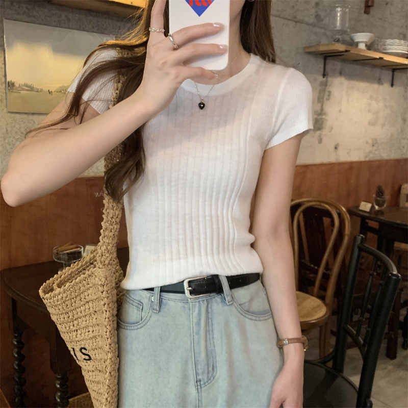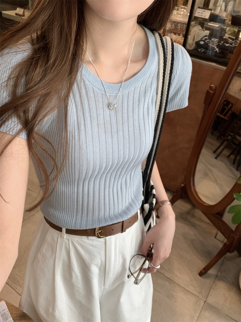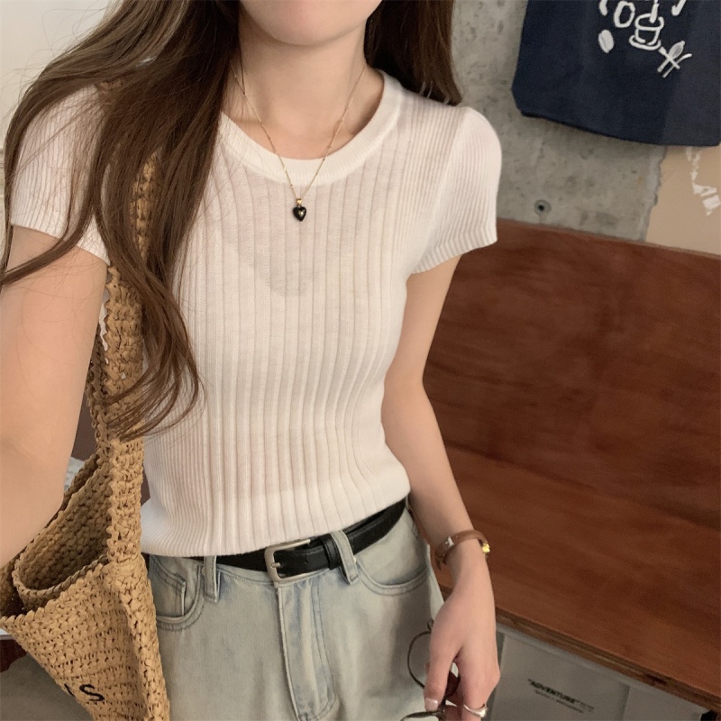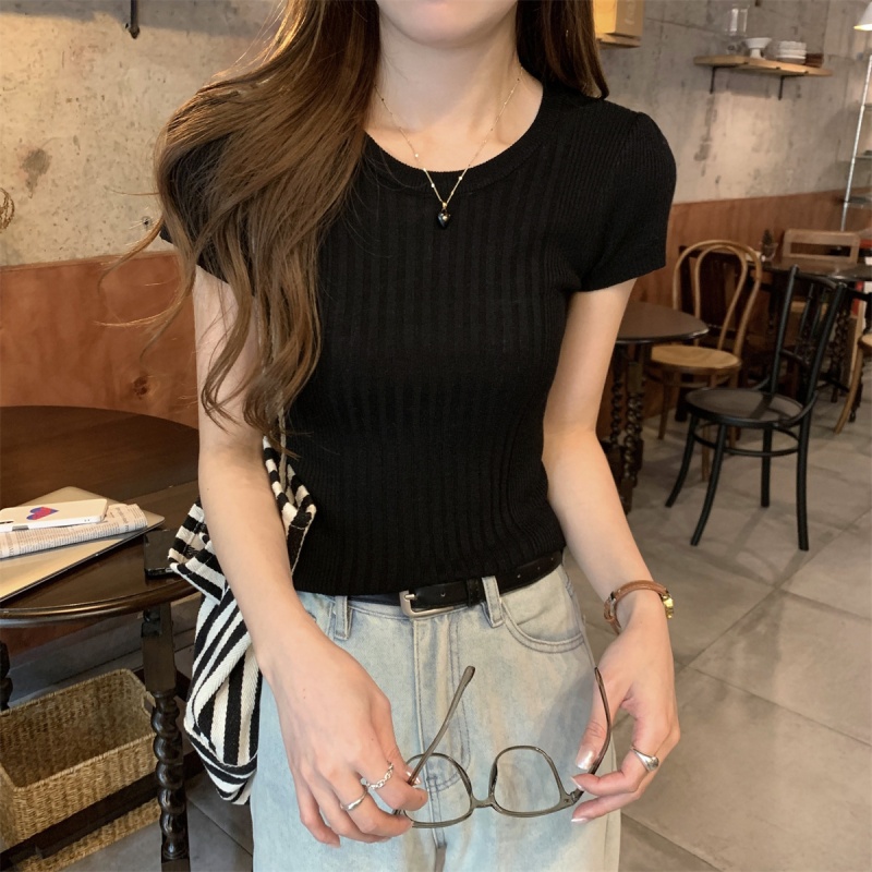 2024夏季新款韩版ins圆领气质坑条百搭显瘦修身轻薄针织短袖上衣