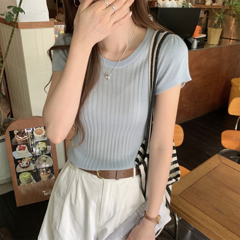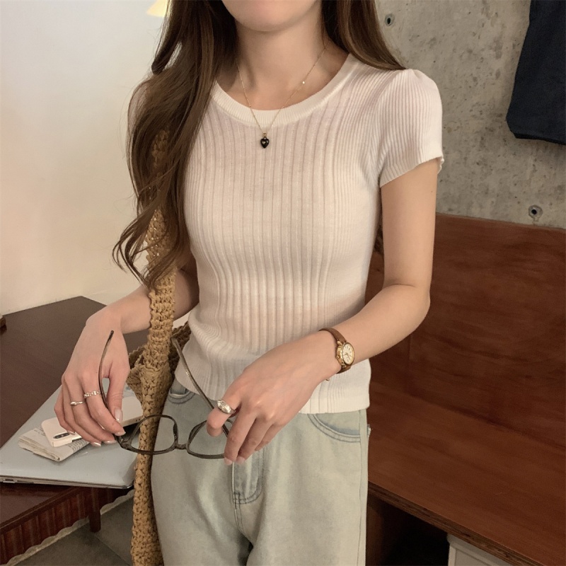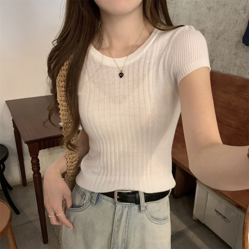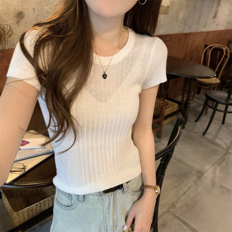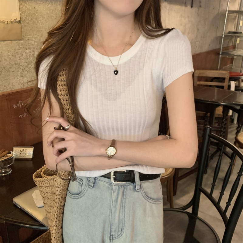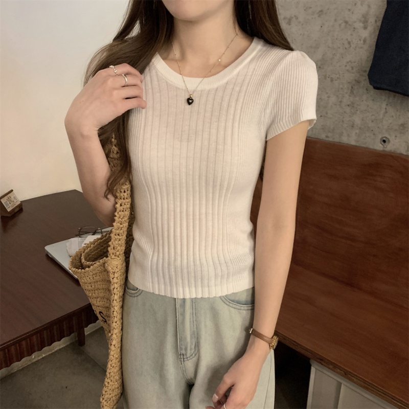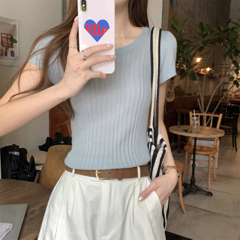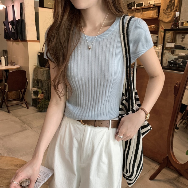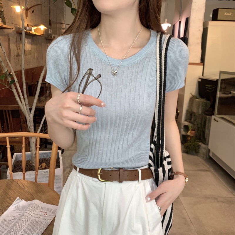 2024夏季新款韩版ins圆领气质坑条百搭显瘦修身轻薄针织短袖上衣