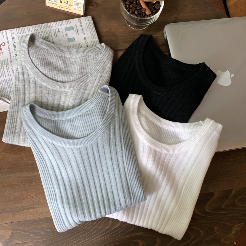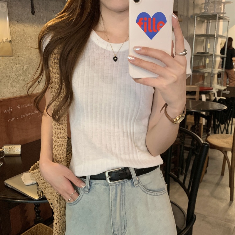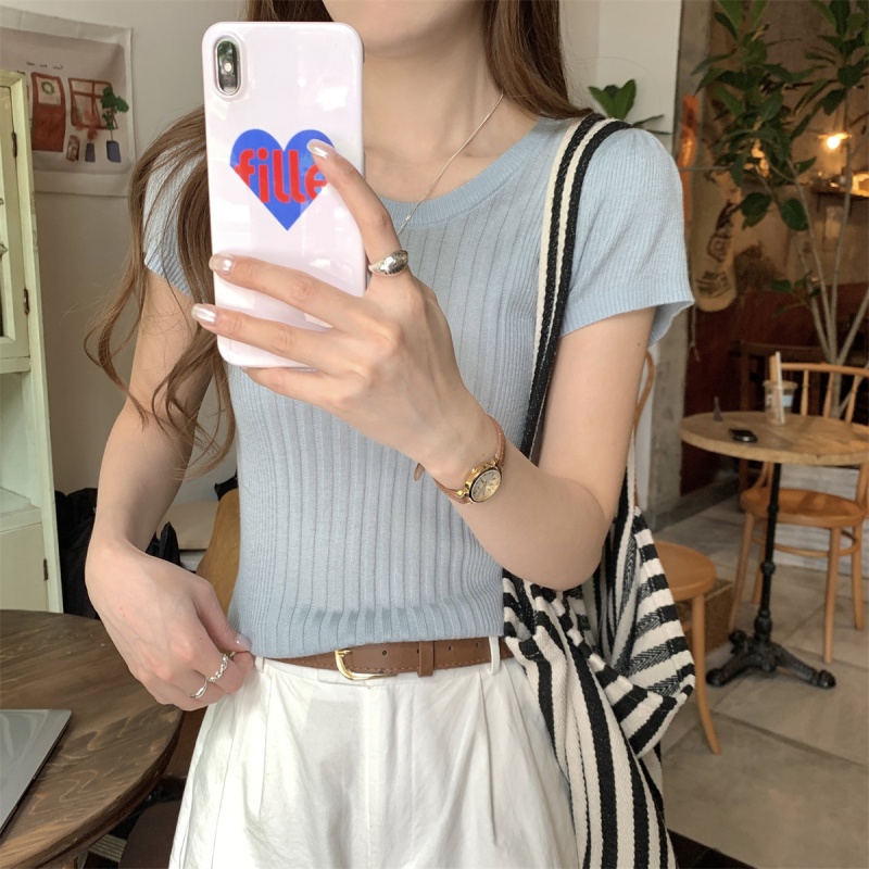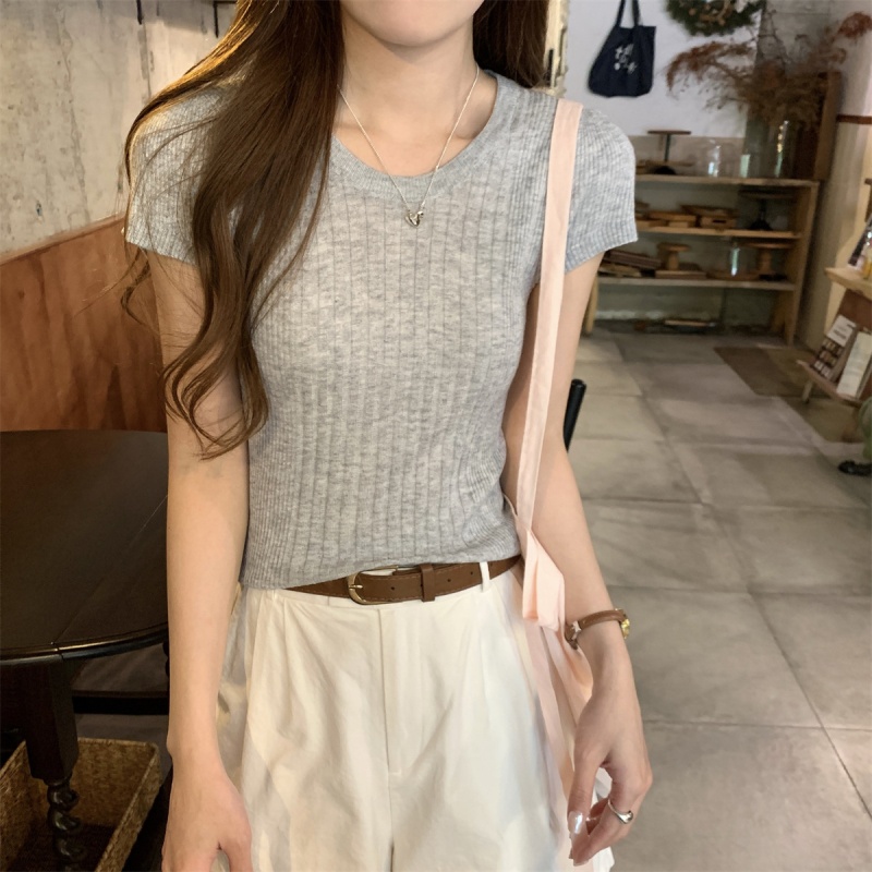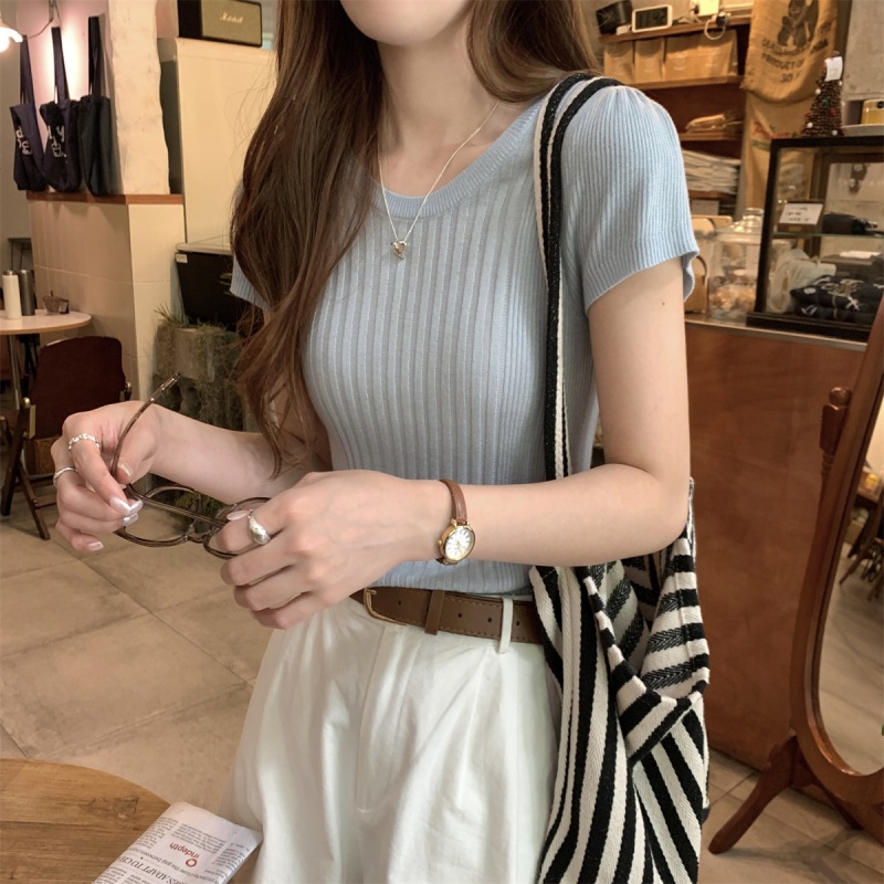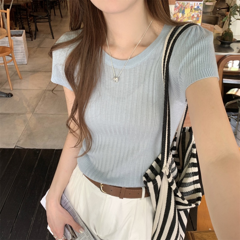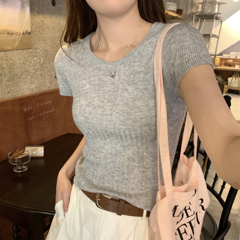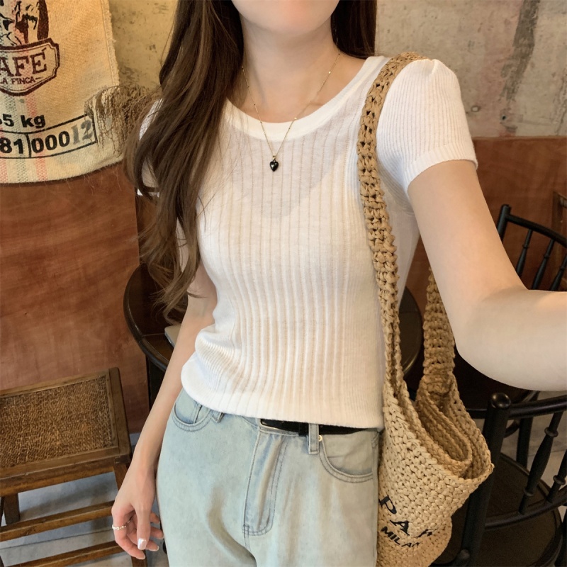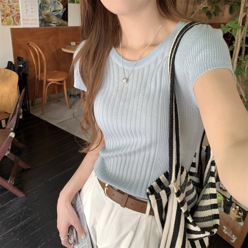 2024夏季新款韩版ins圆领气质坑条百搭显瘦修身轻薄针织短袖上衣