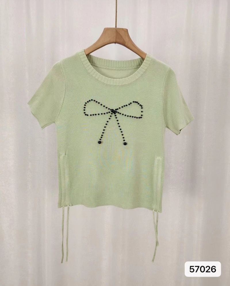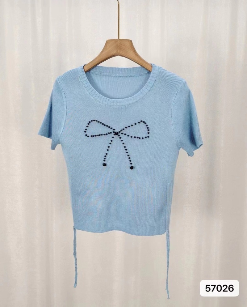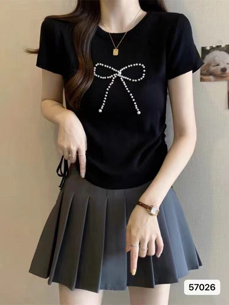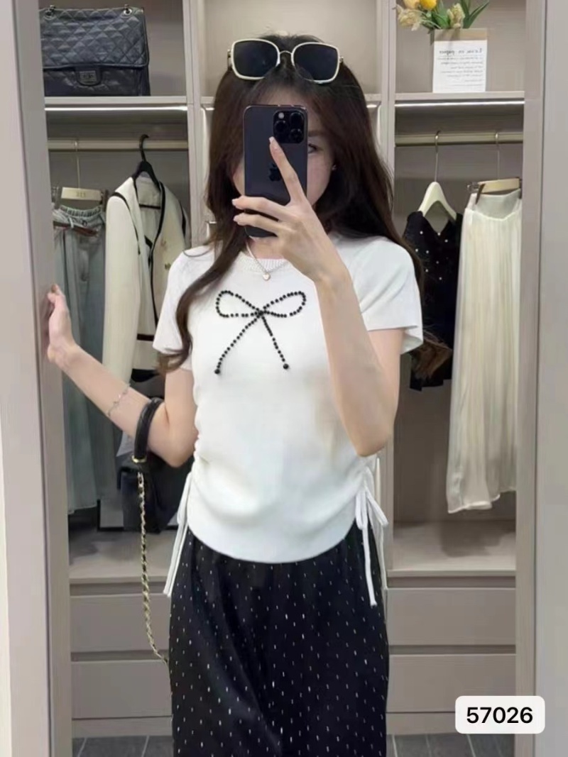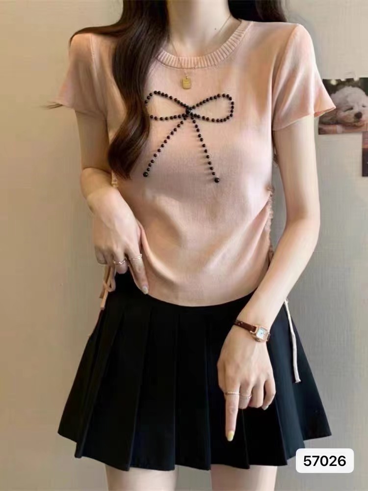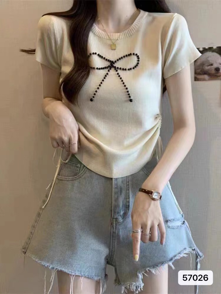 不规则短袖正肩2024夏季新款显瘦抽绳褶皱蝴蝶结冰丝针织百搭上衣
