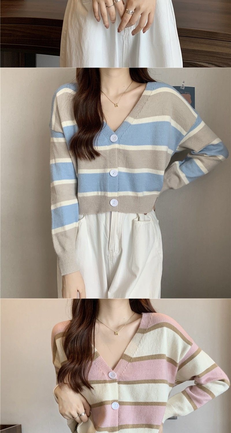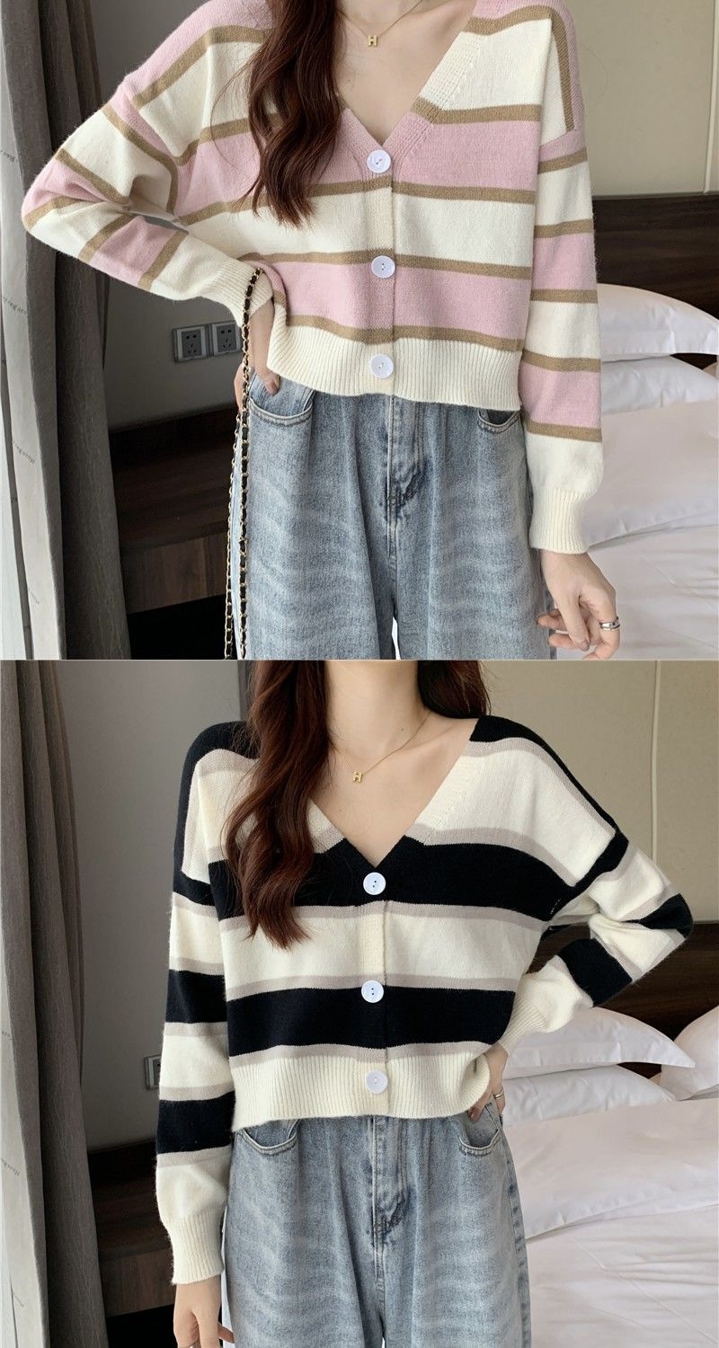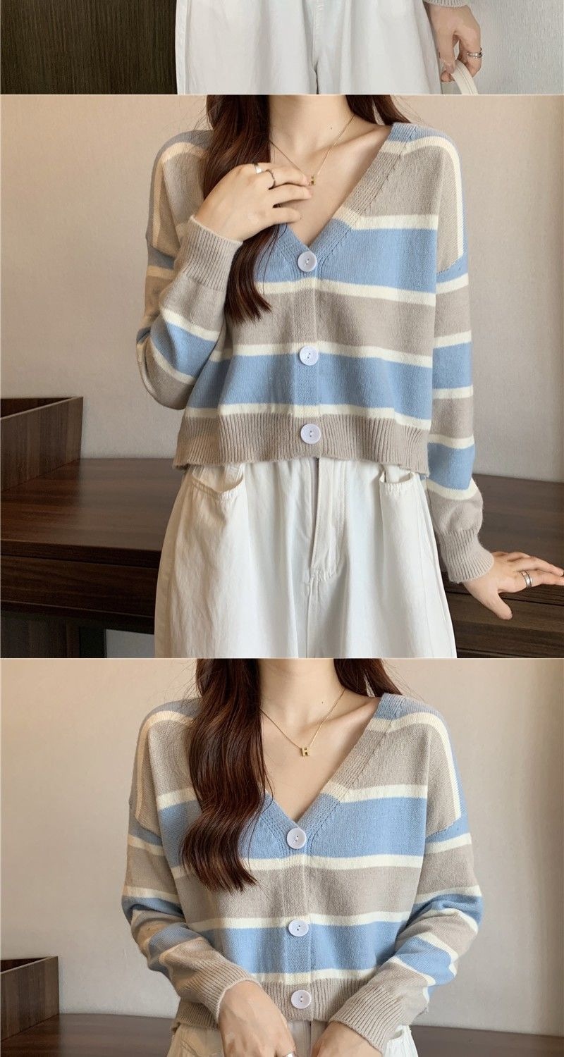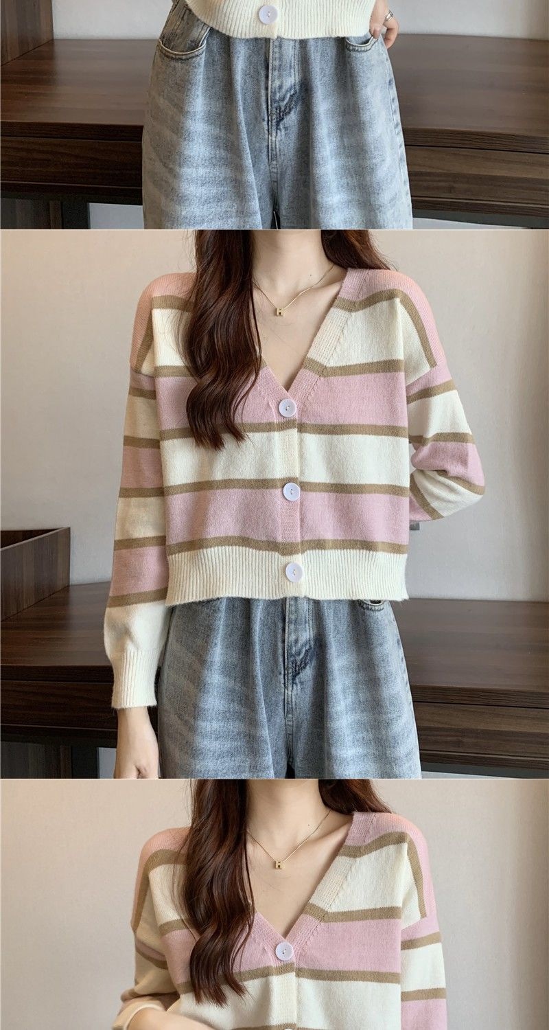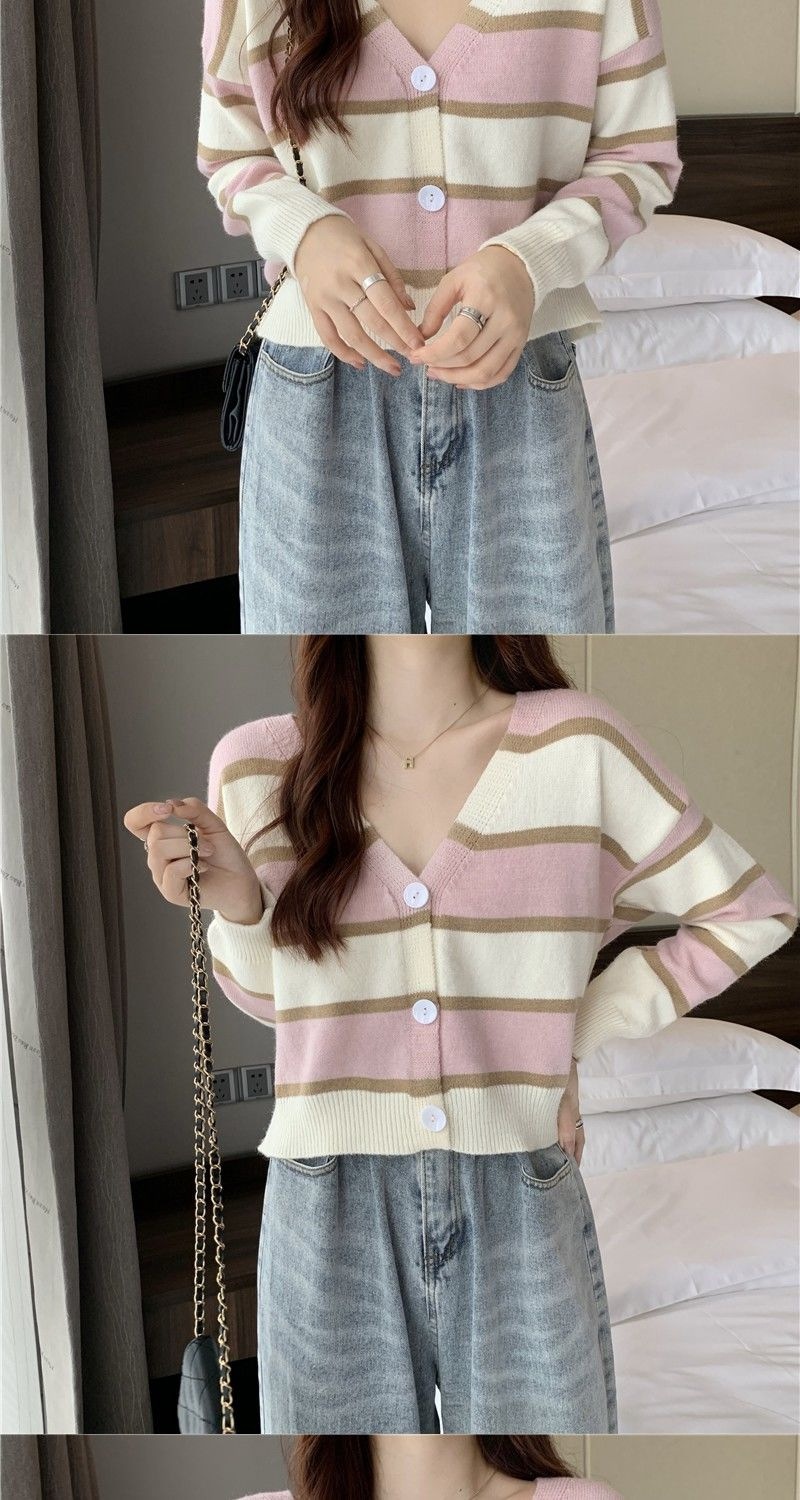 慵懒风毛衣女春秋新款短款宽松条纹甜美清新上衣针织v领开衫长袖