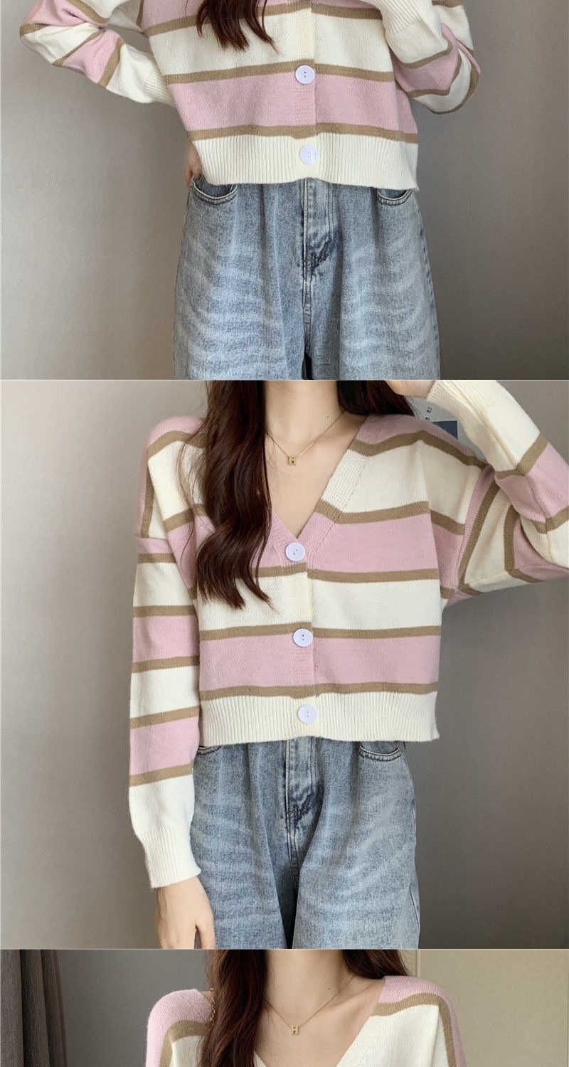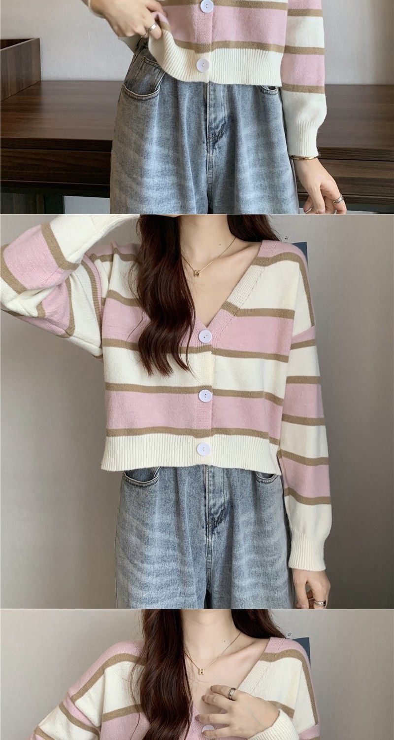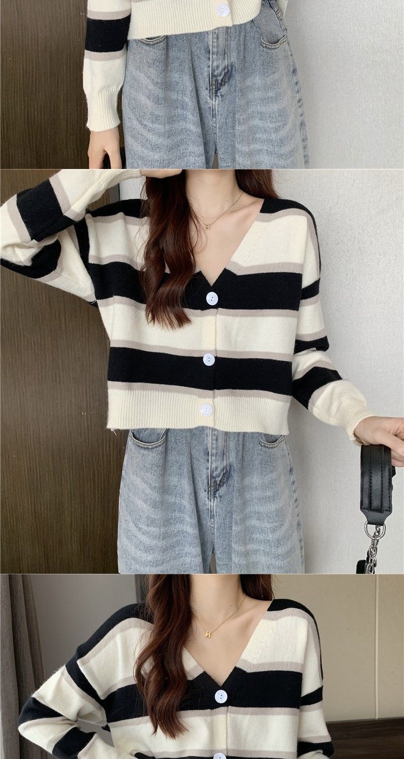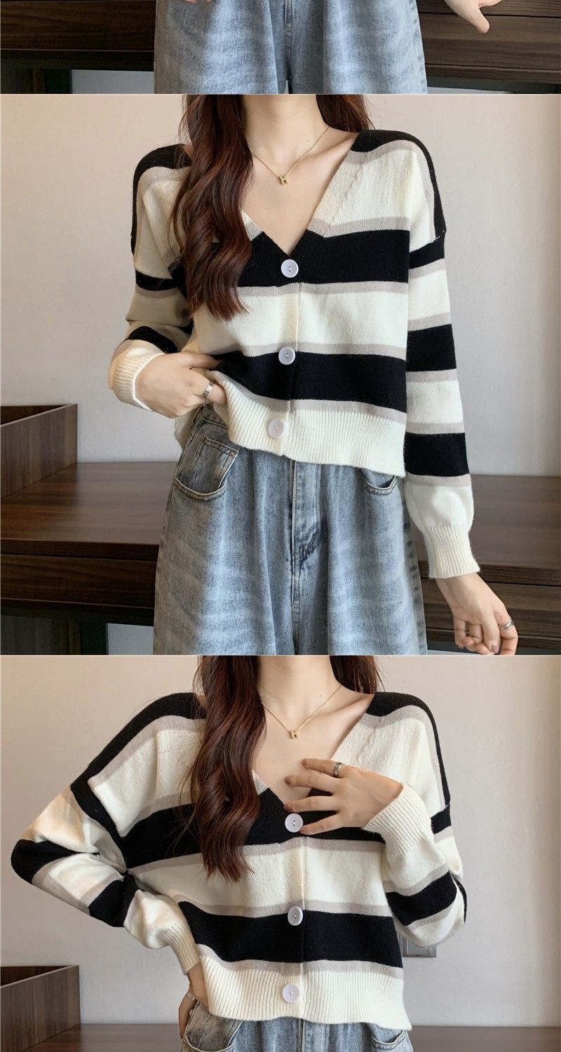慵懒风毛衣女春秋新款短款宽松条纹甜美清新上衣针织v领开衫长袖