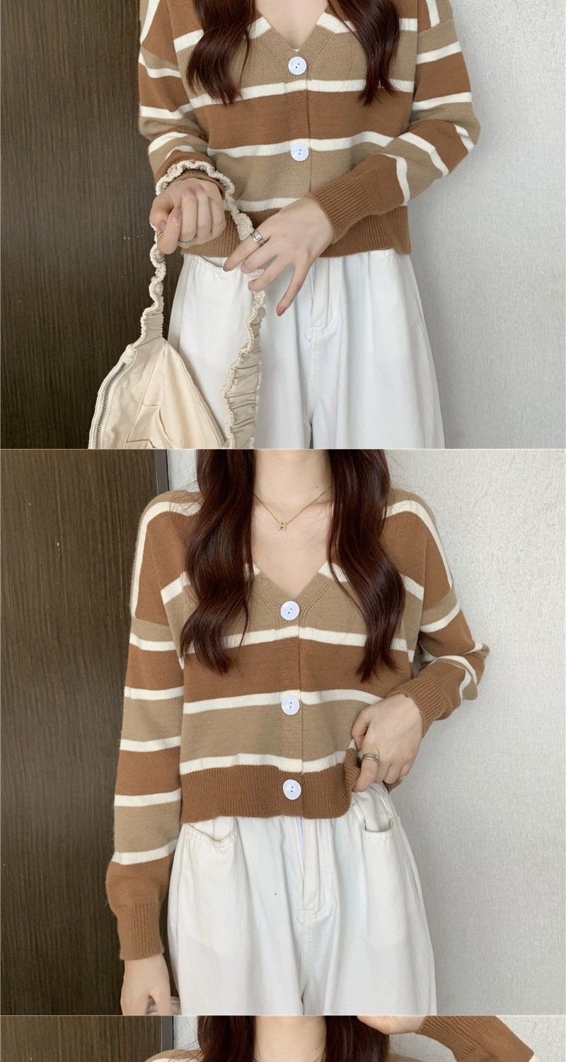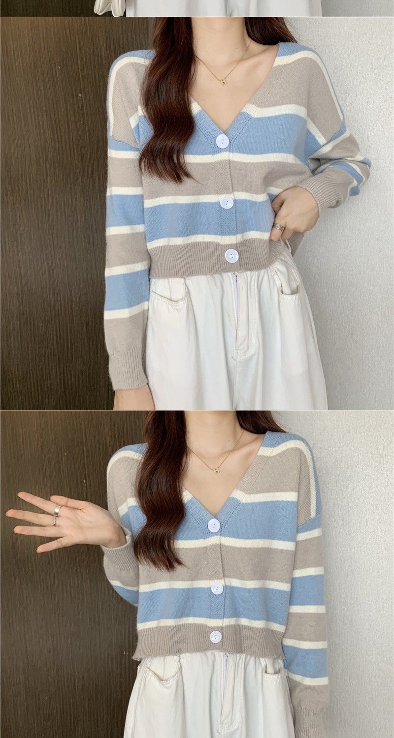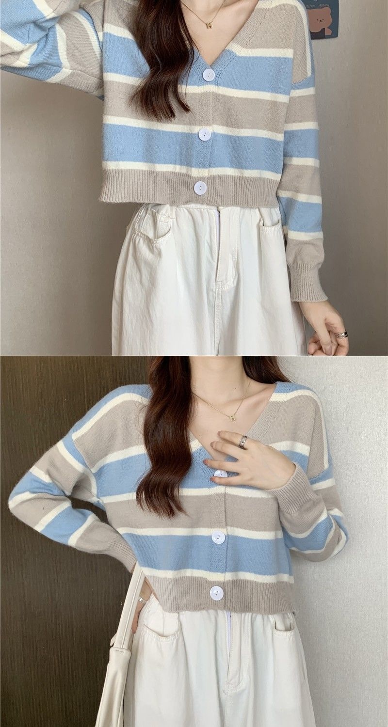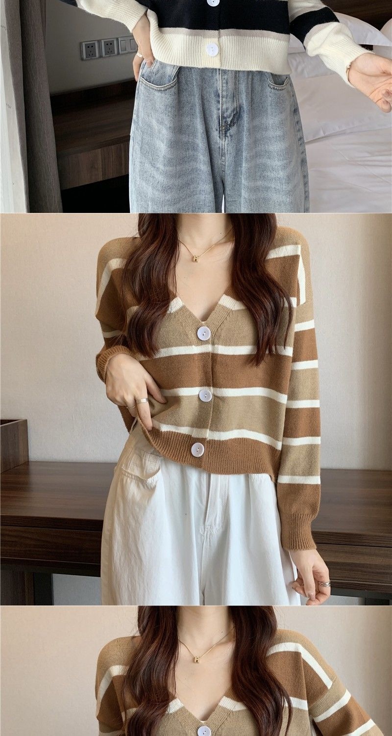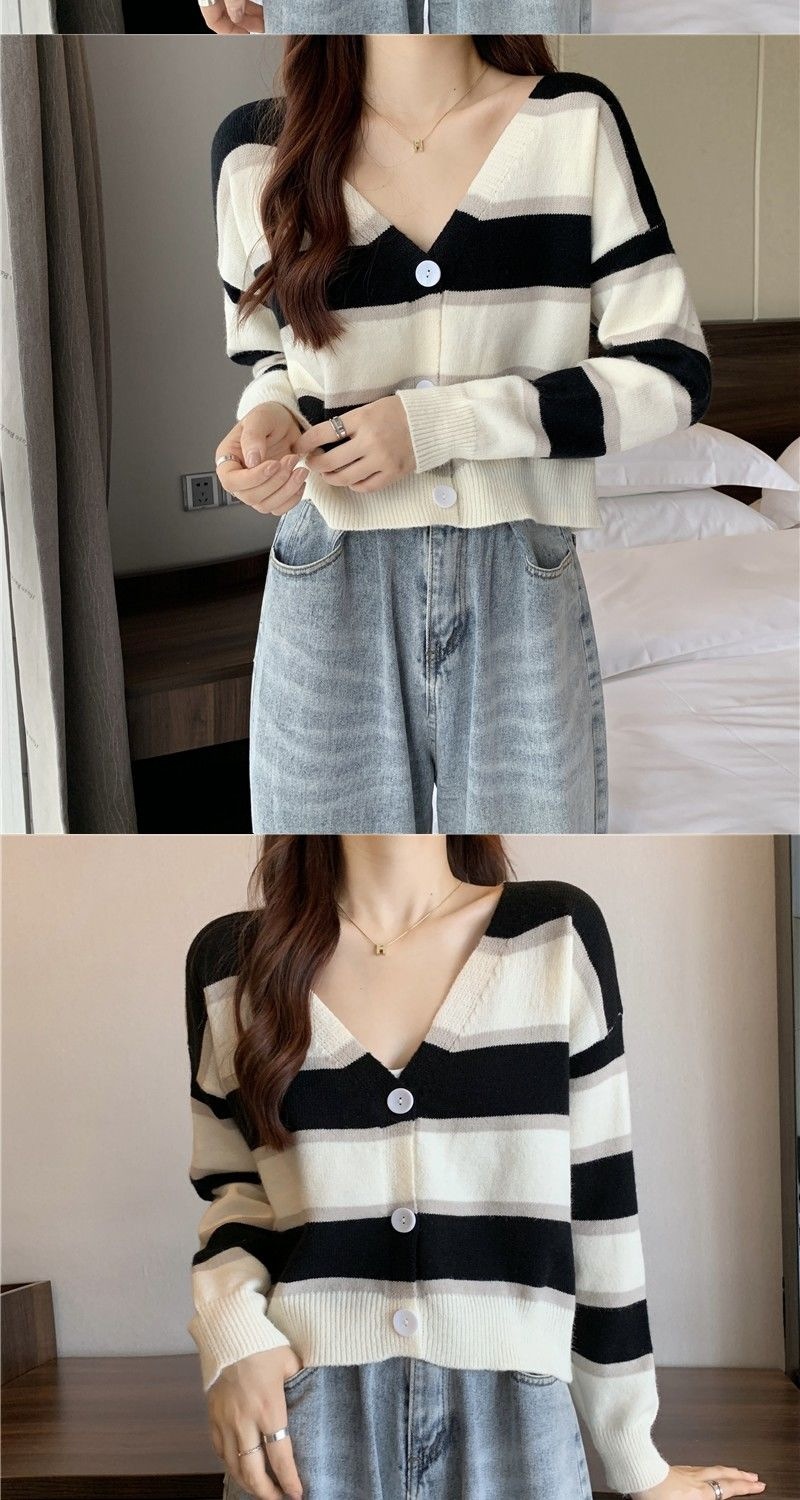 慵懒风毛衣女春秋新款短款宽松条纹甜美清新上衣针织v领开衫长袖
