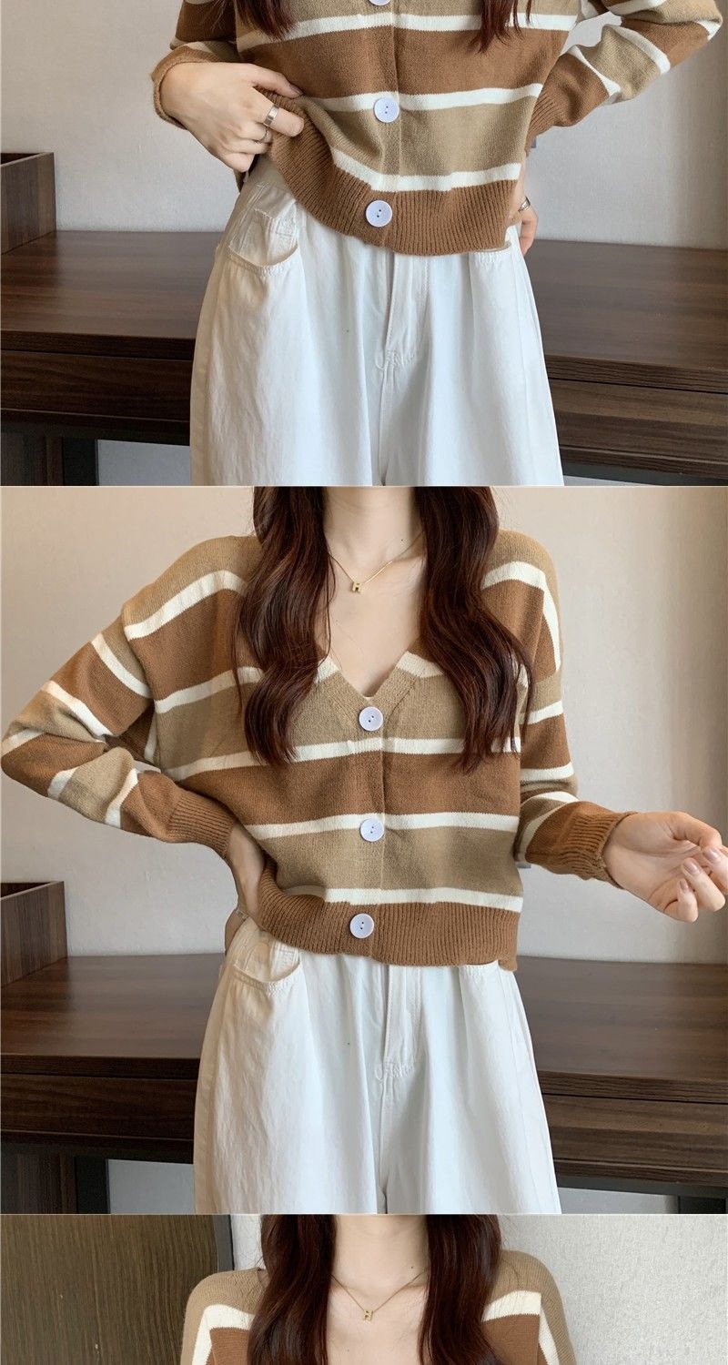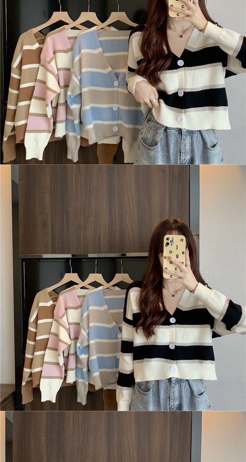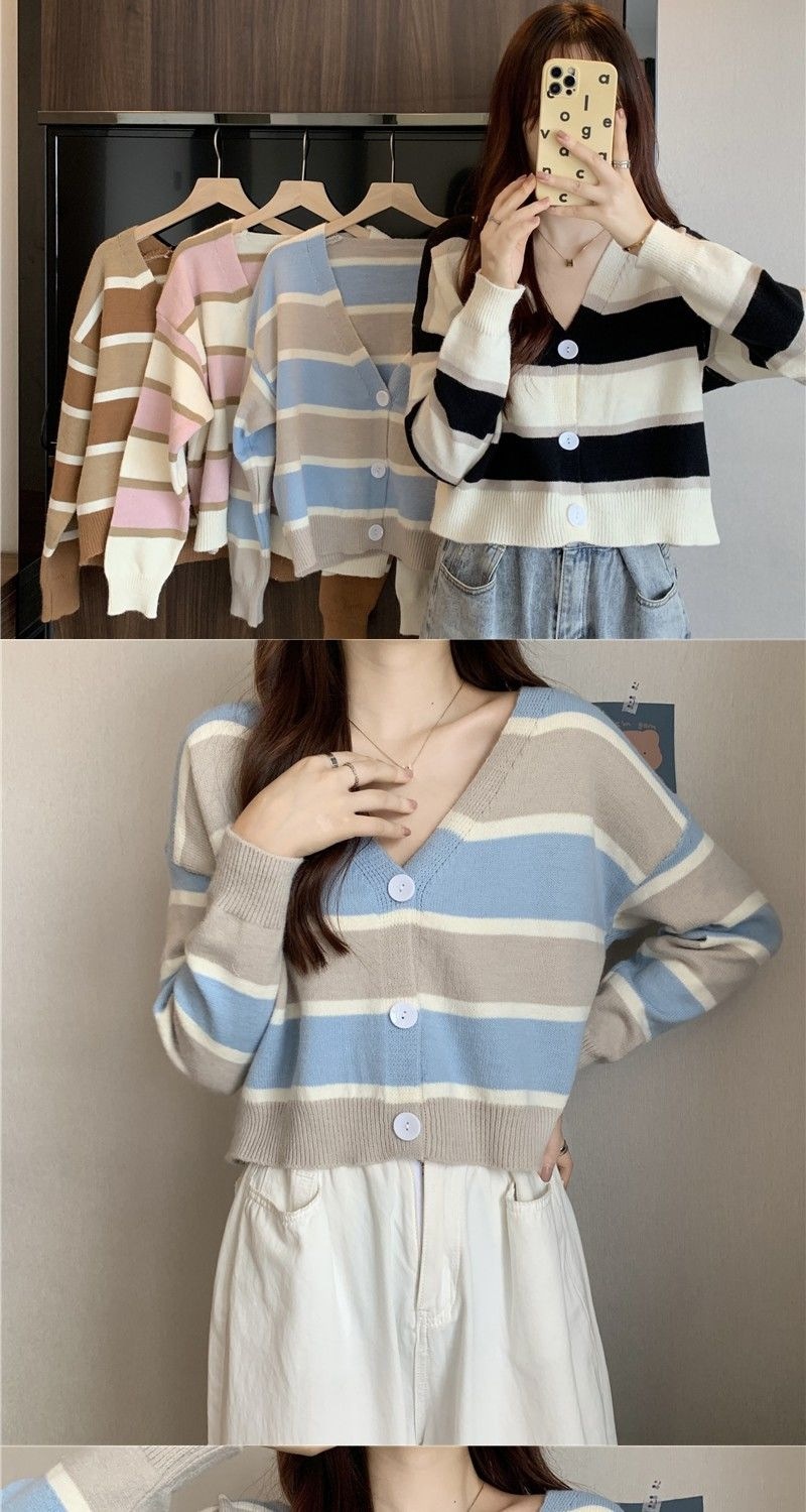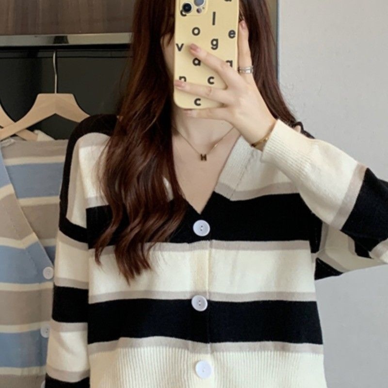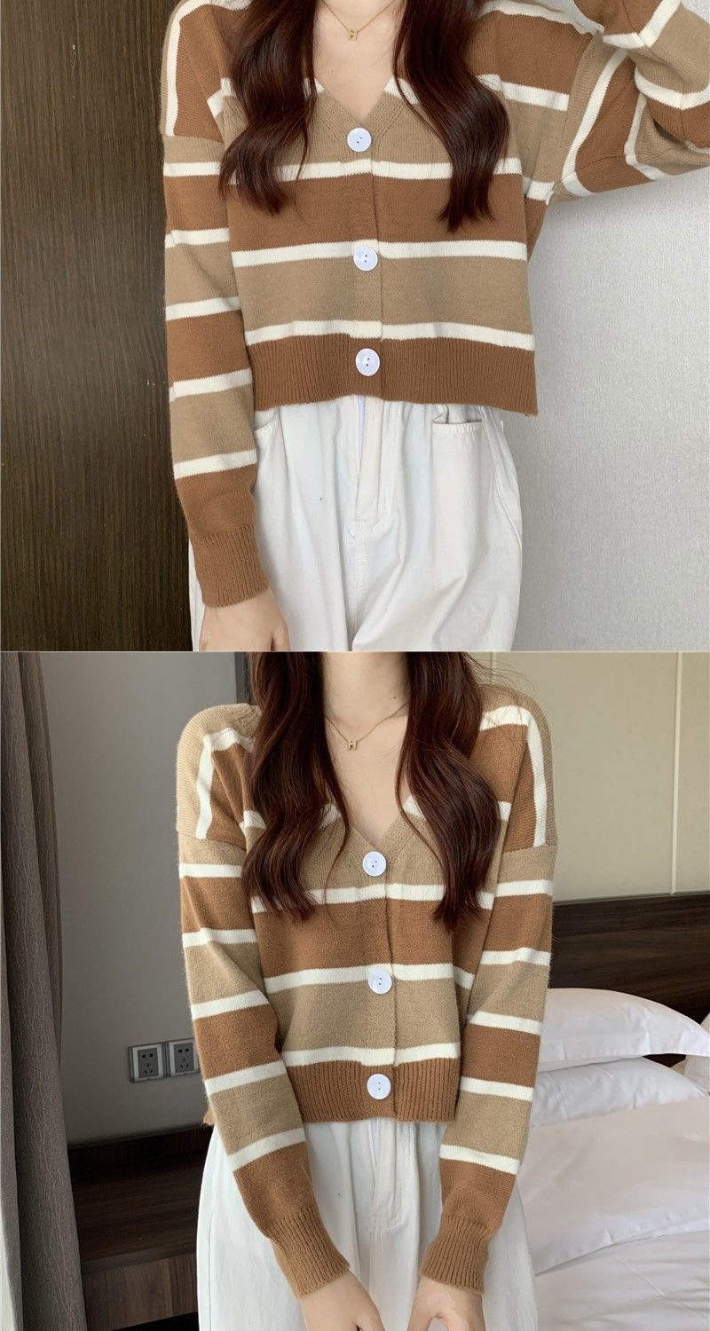 慵懒风毛衣女春秋新款短款宽松条纹甜美清新上衣针织v领开衫长袖