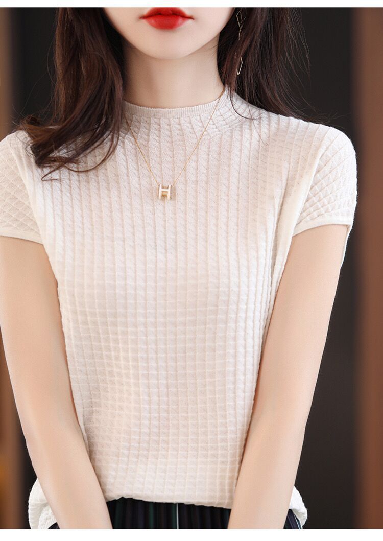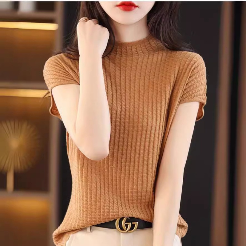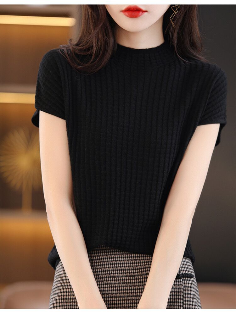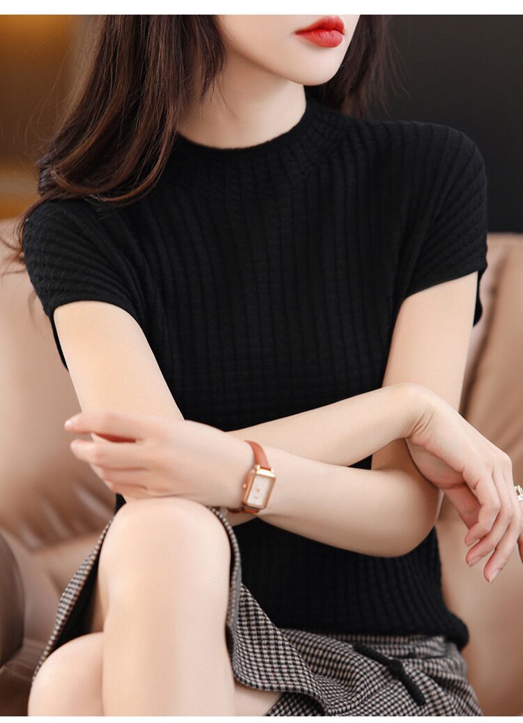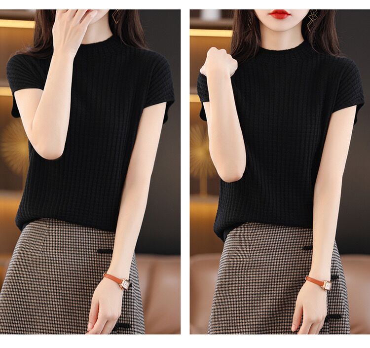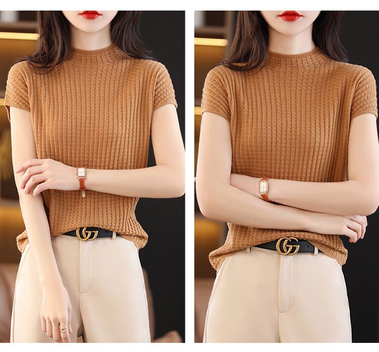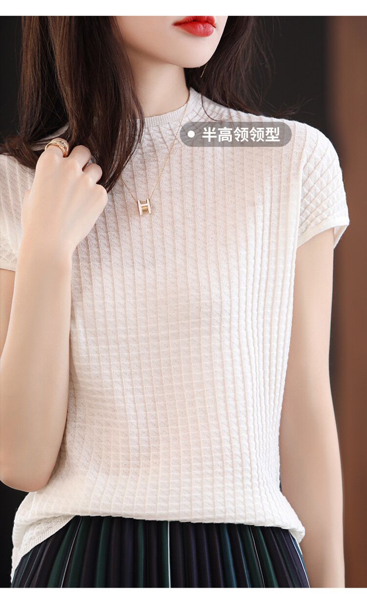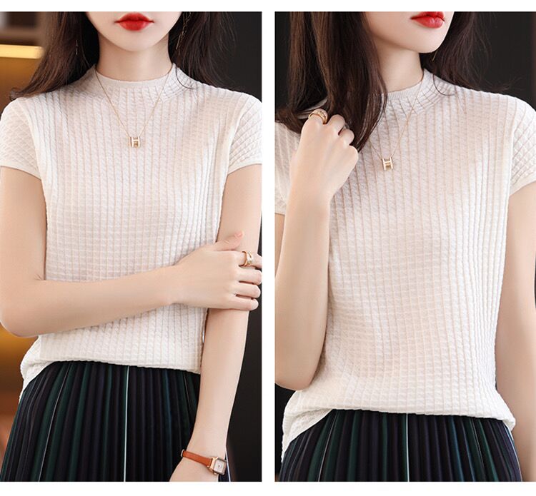 2024夏季新款薄款短袖t恤女针织半高领上衣打底衫百搭显瘦背心女