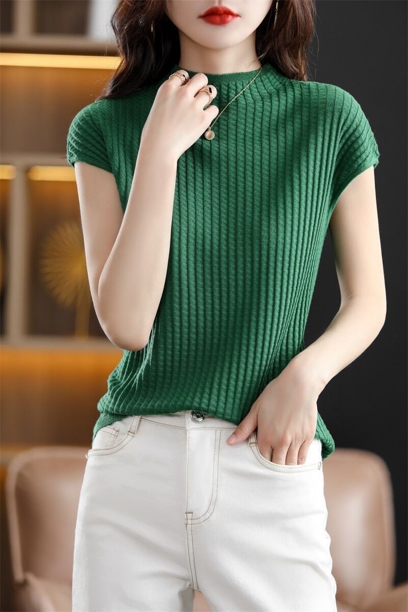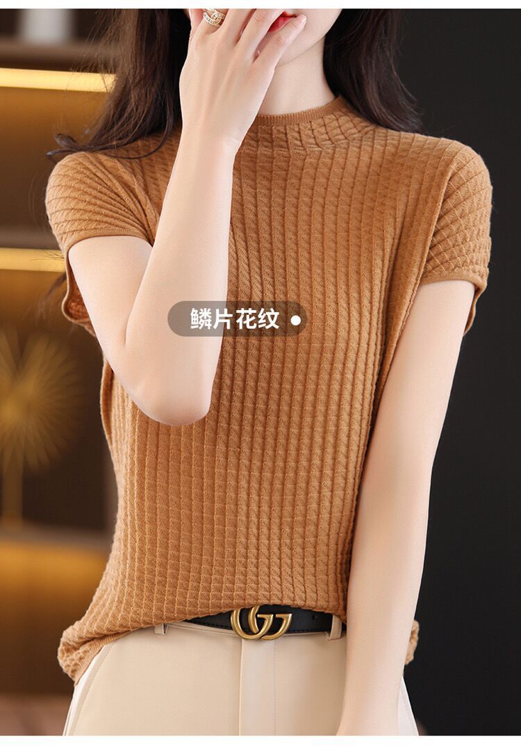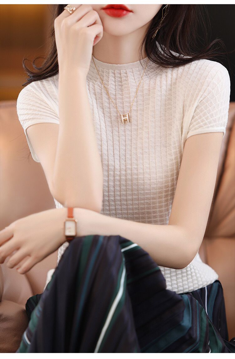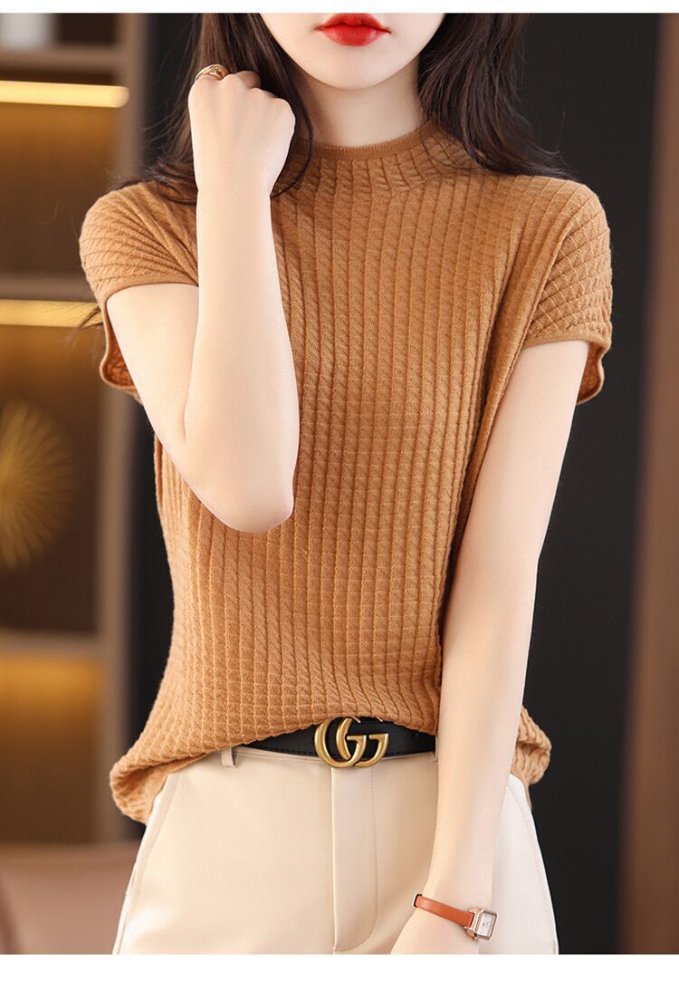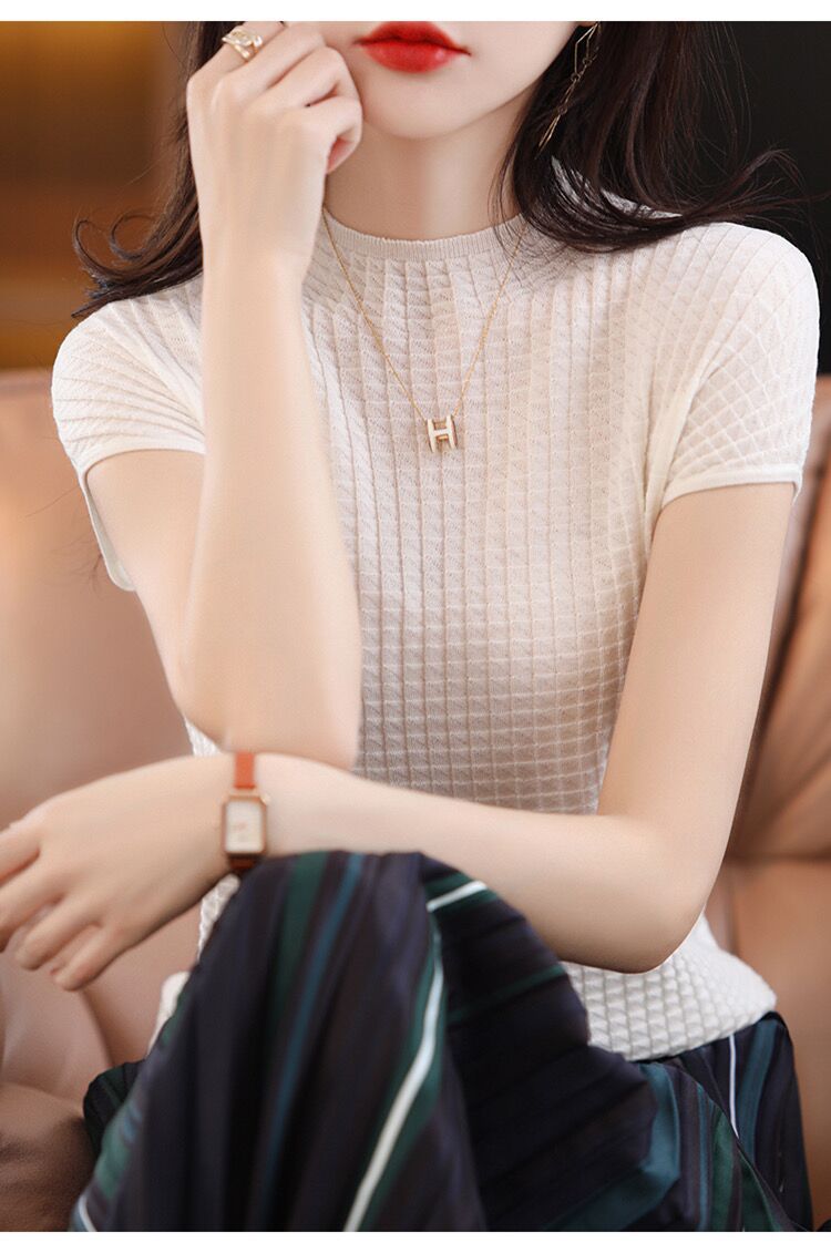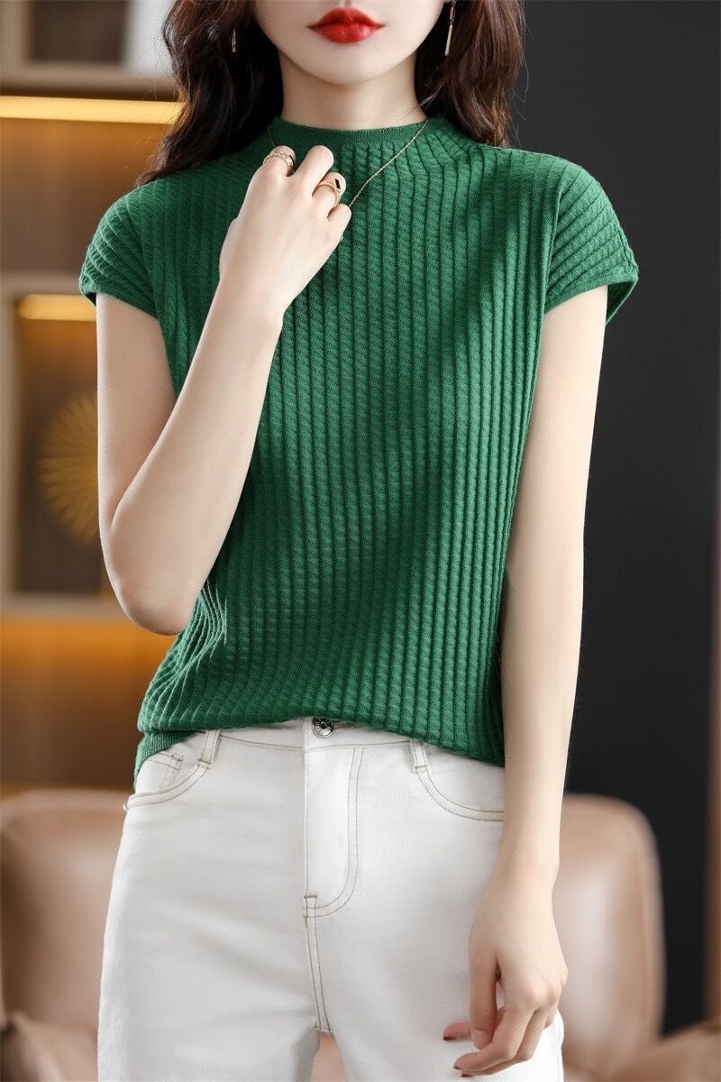 2024夏季新款薄款短袖t恤女针织半高领上衣打底衫百搭显瘦背心女