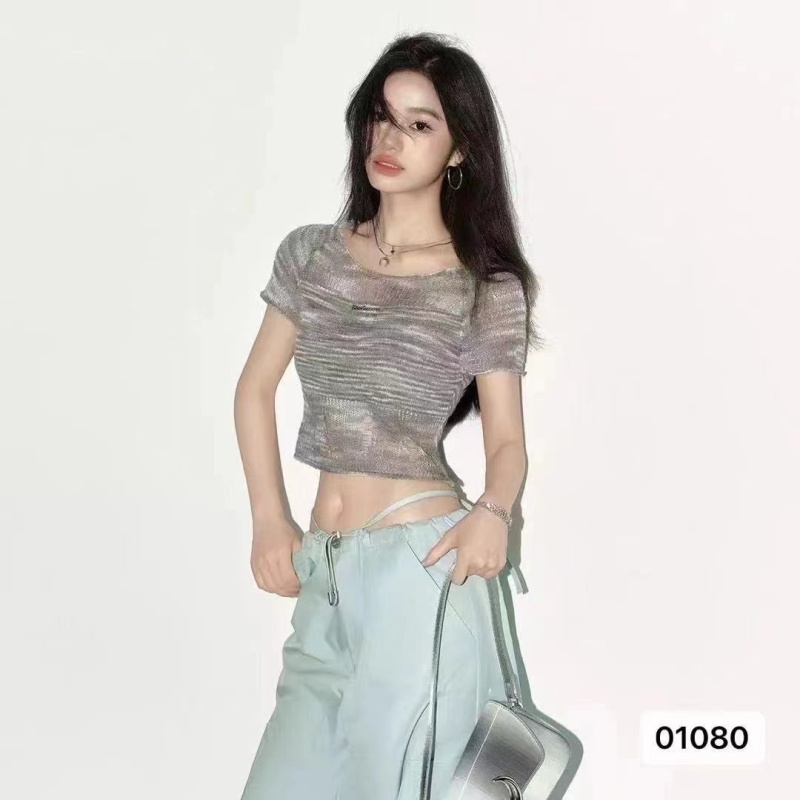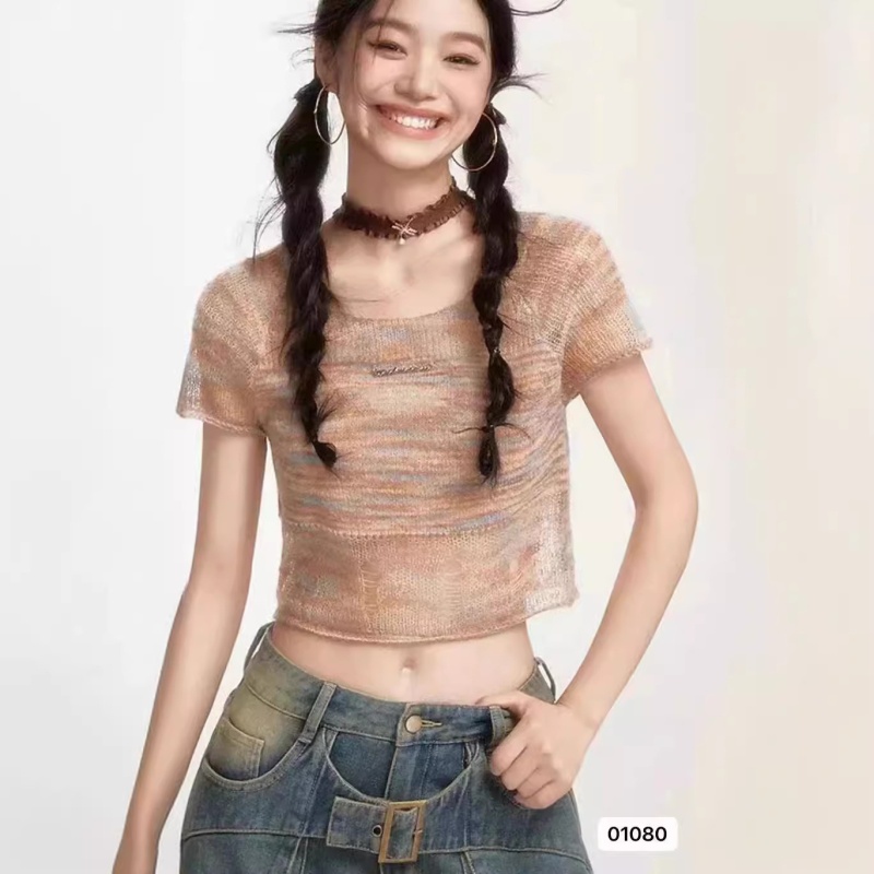 2024夏季新款设计感甜美清新小众纯欲风圆领渐变条纹高腰短袖上衣