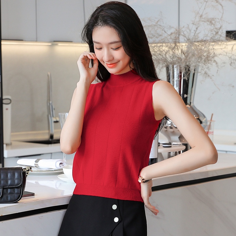 新款复古半高领修身针织衫女无袖百搭打底背心上衣