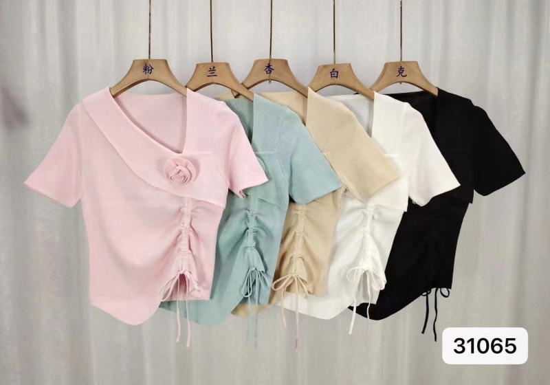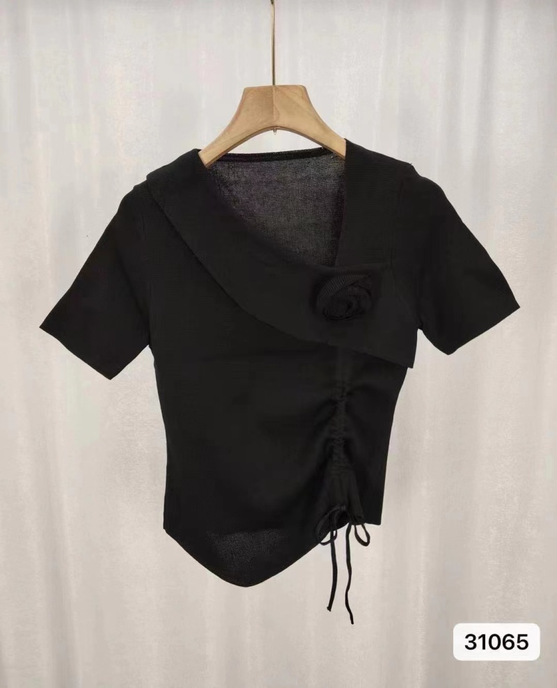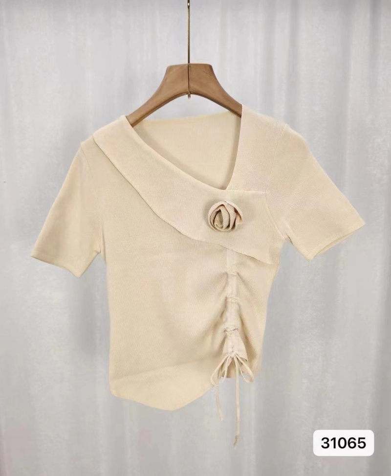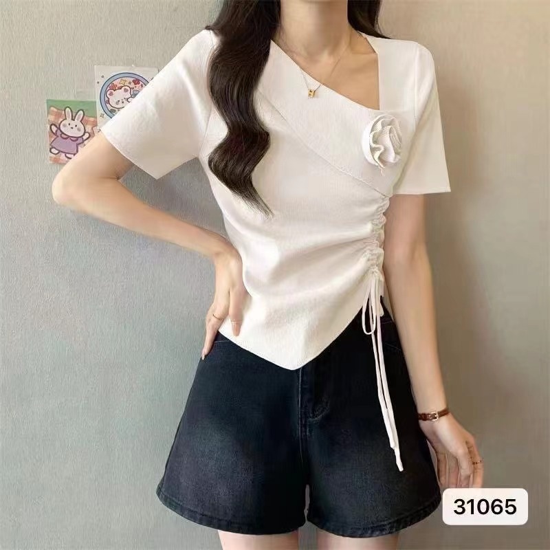 2024夏季新款时尚甜美清新小众斜V领不规则下摆抽绳短袖上衣女潮