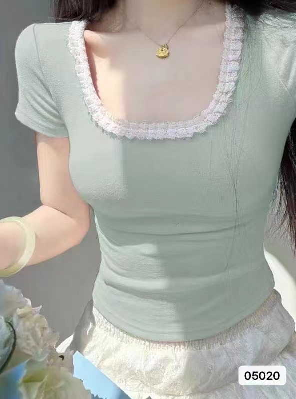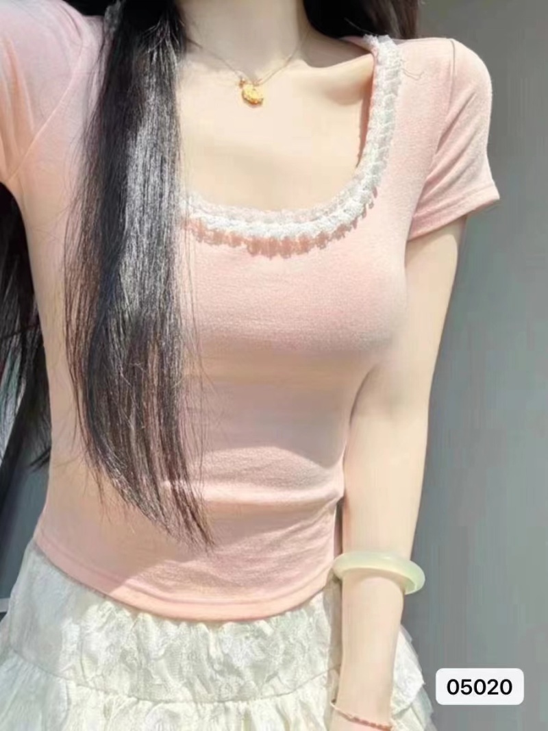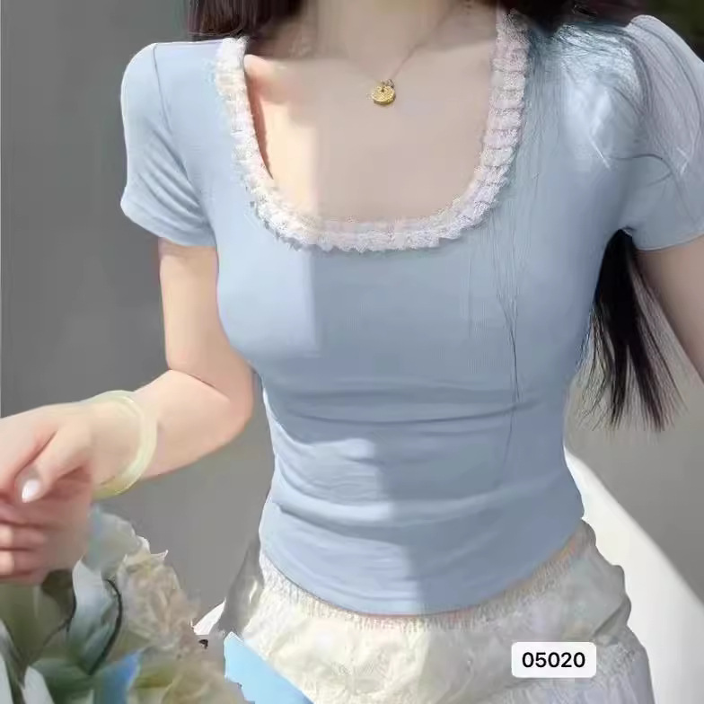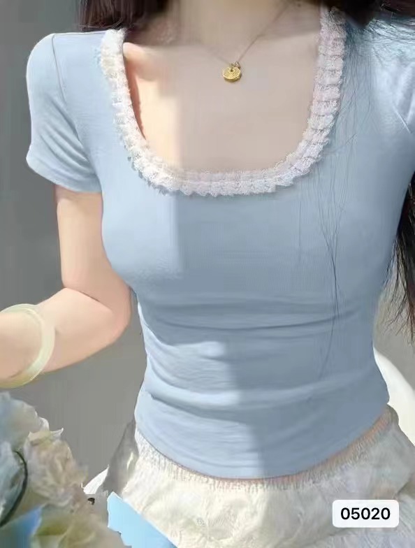 2024夏季新款甜美清新减龄方领性感辣妹蕾丝拼接百搭短袖上衣女潮