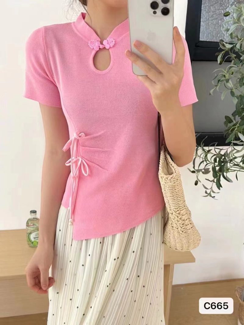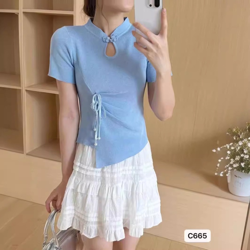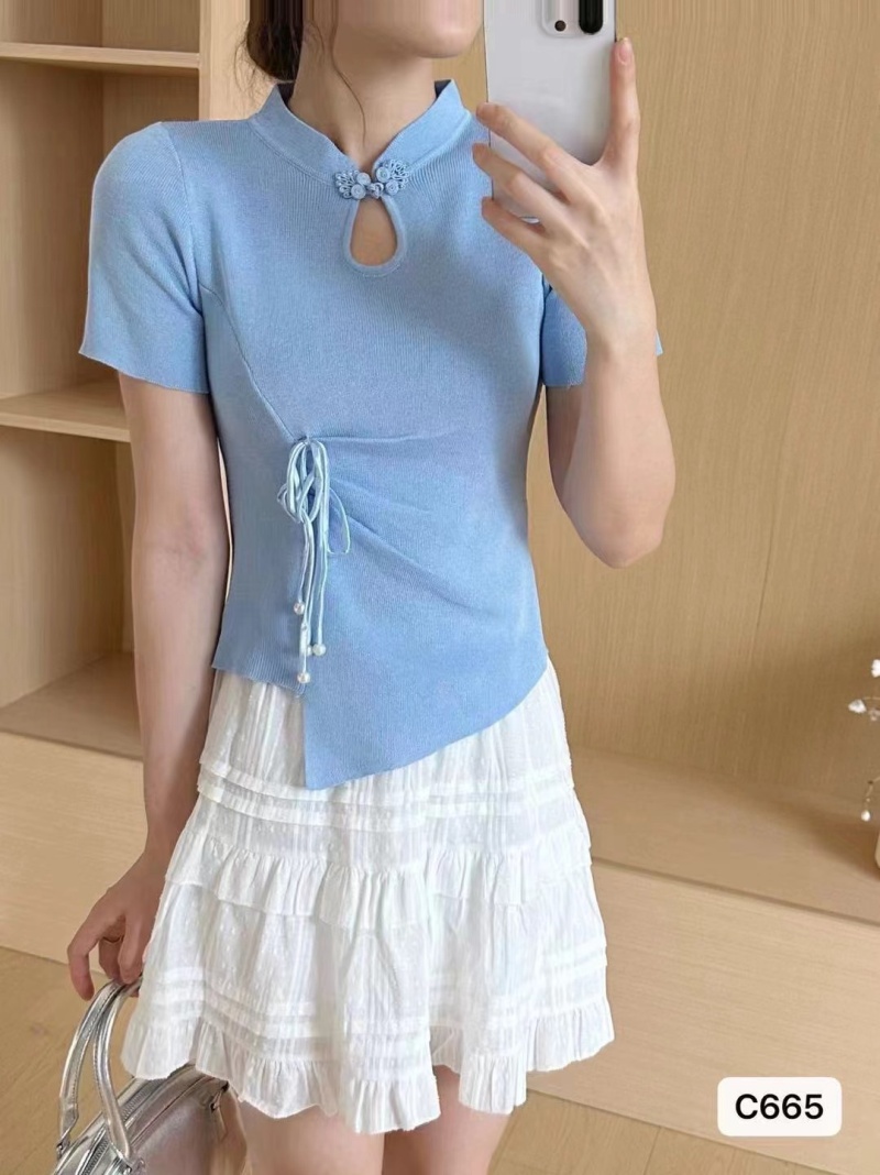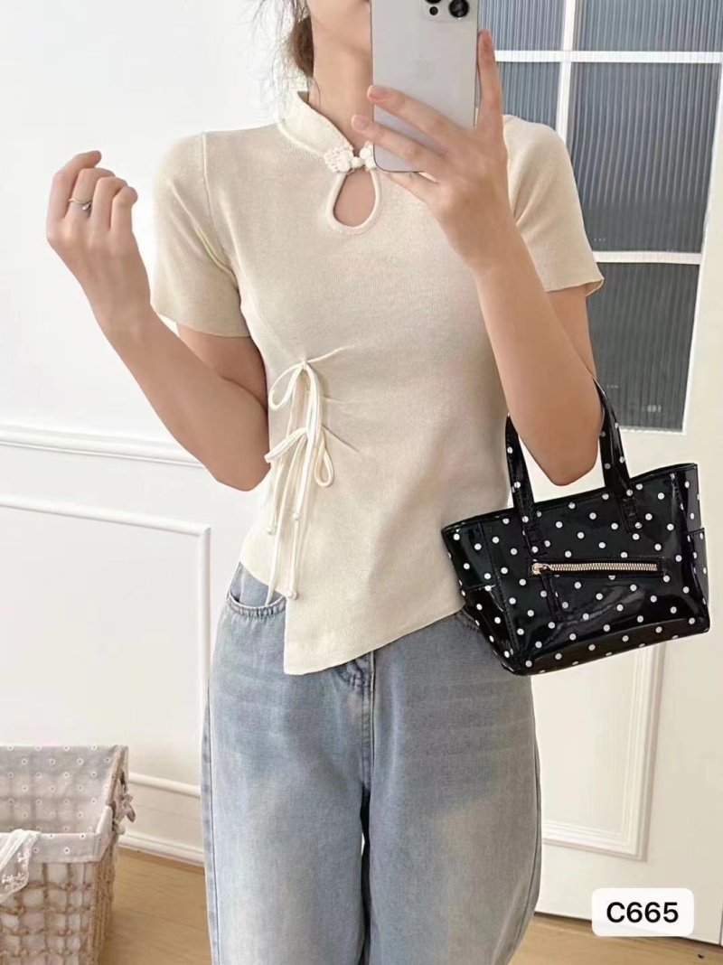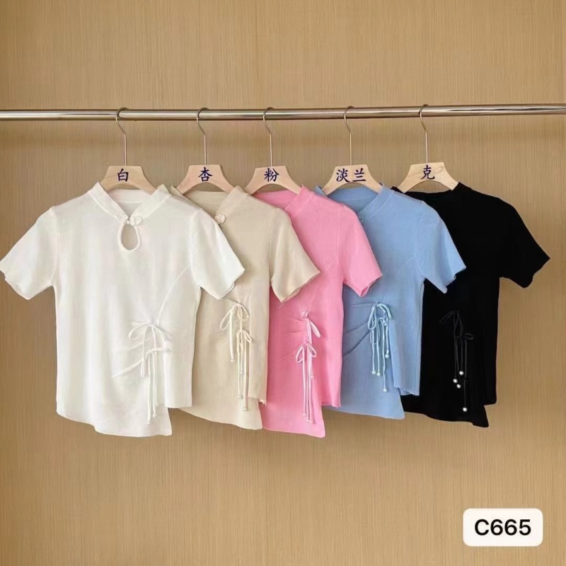 2024夏季新款时尚百搭小众显瘦新中式珍珠盘扣褶皱设计短袖上衣女