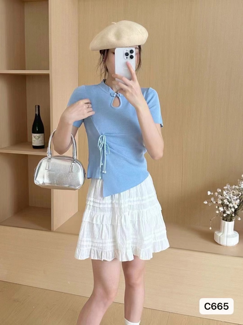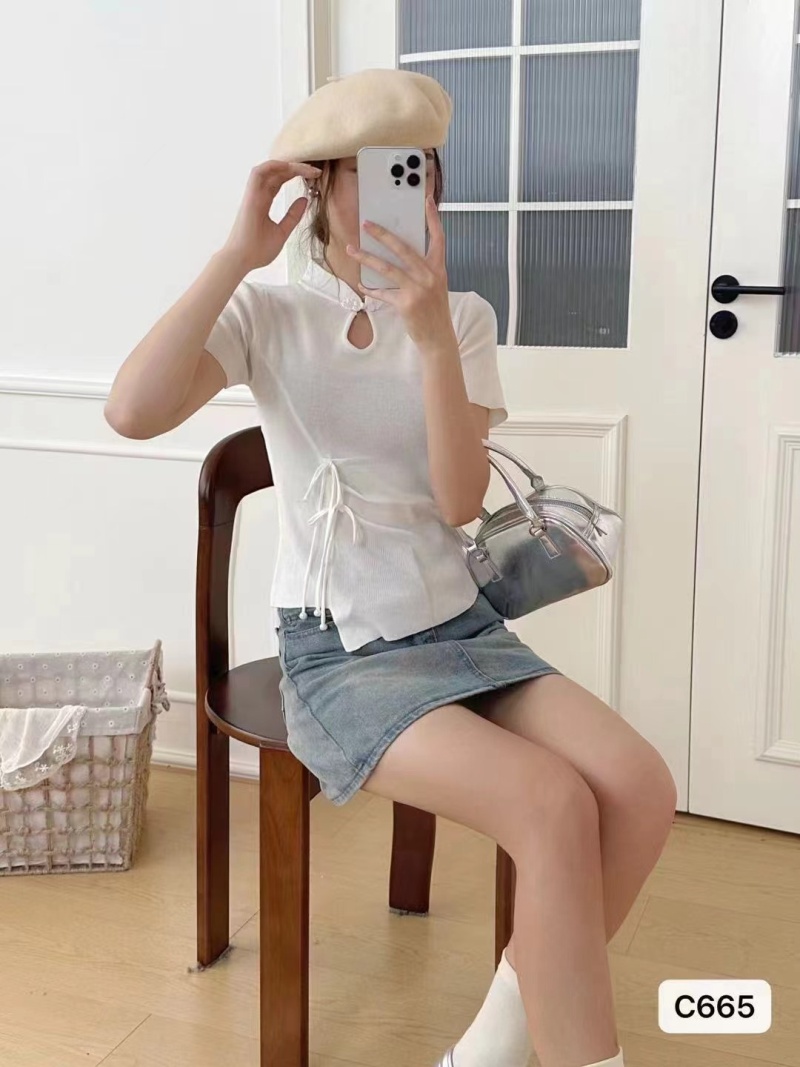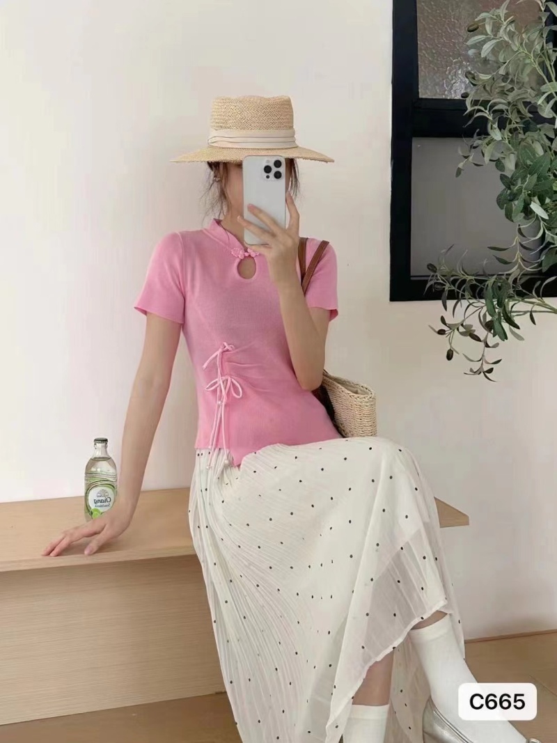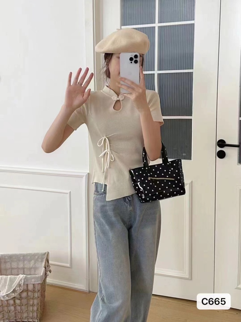 2024夏季新款时尚百搭小众显瘦新中式珍珠盘扣褶皱设计短袖上衣女