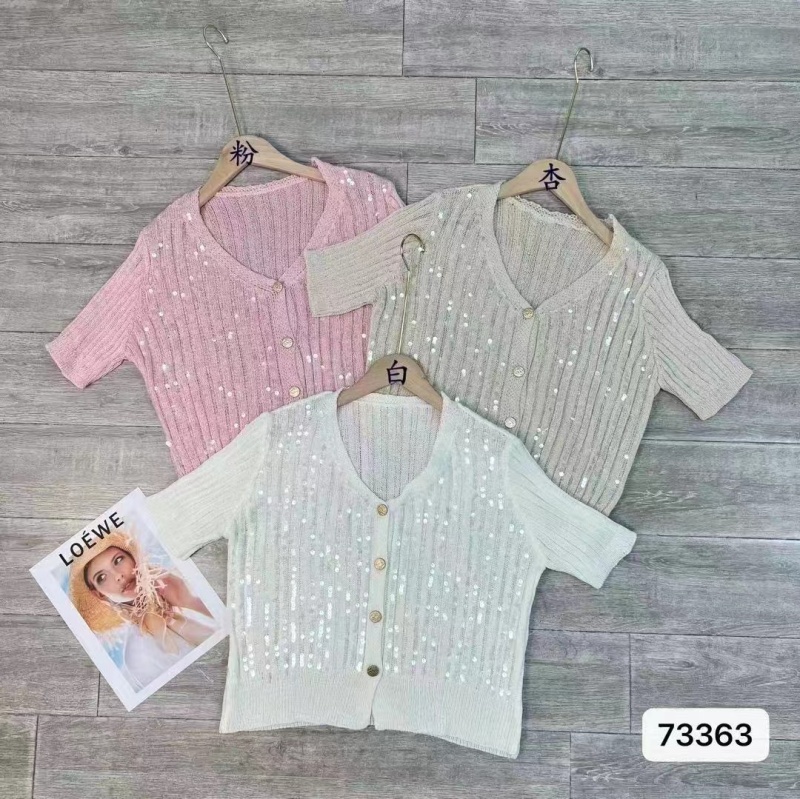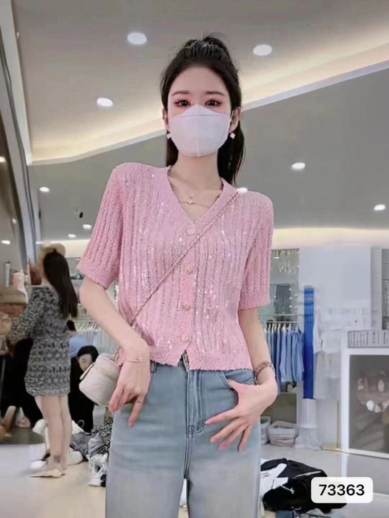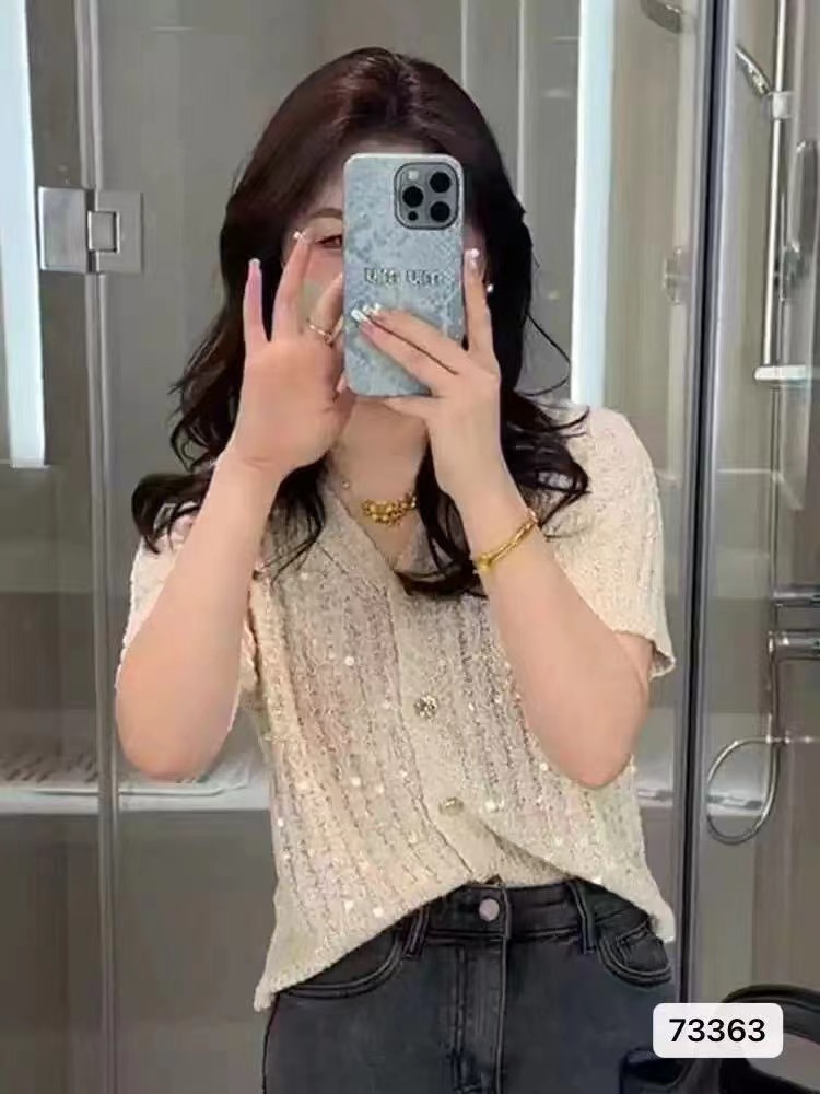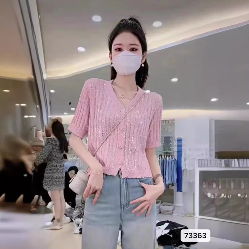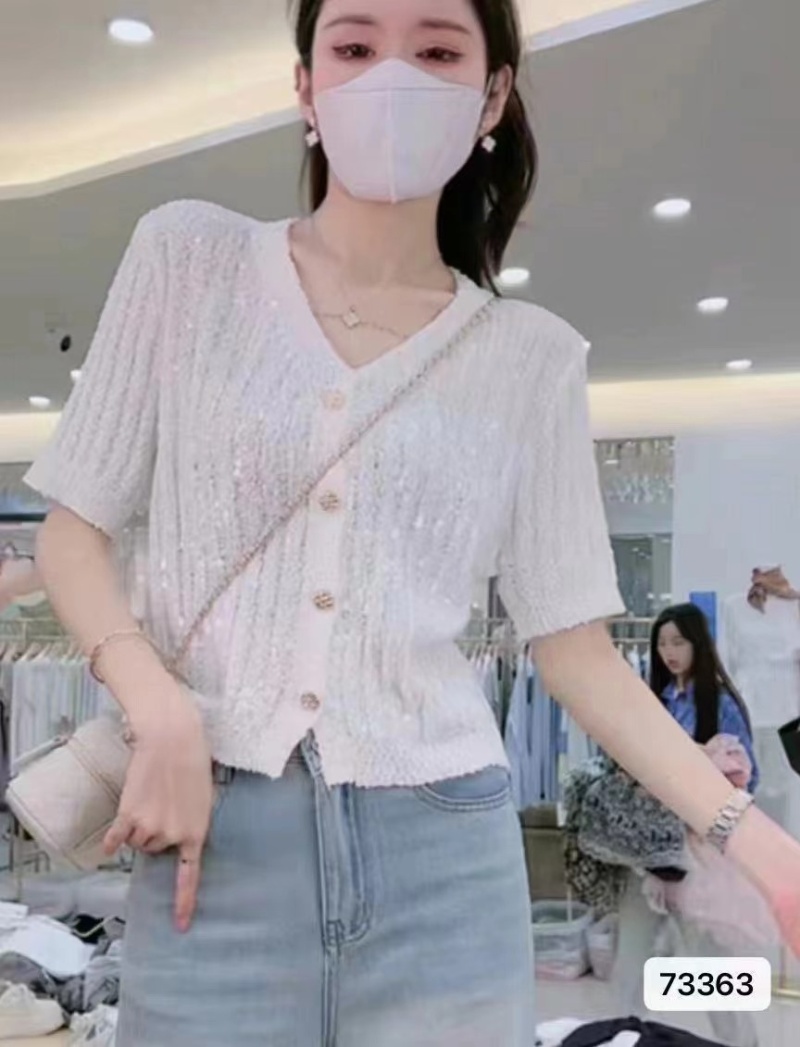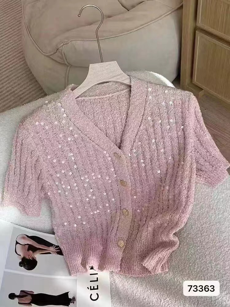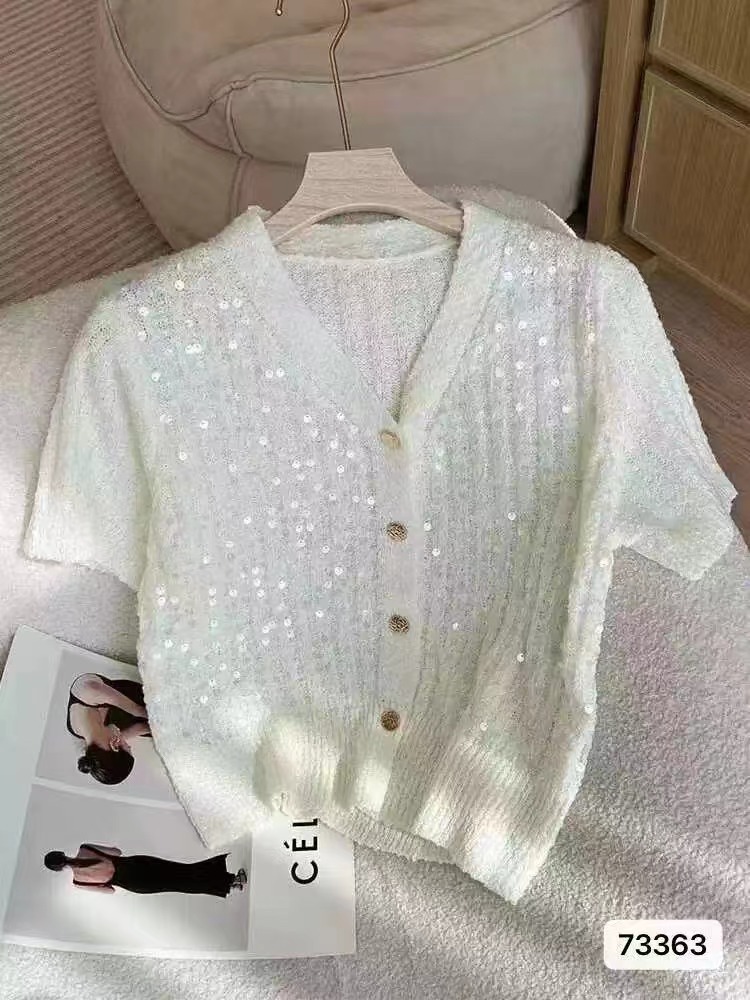 2024夏季新款气质显瘦百搭甜美清新小香风V领亮片短袖开衫上衣女