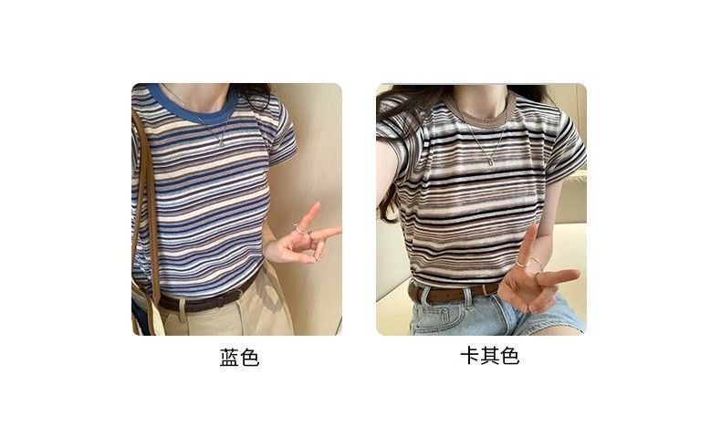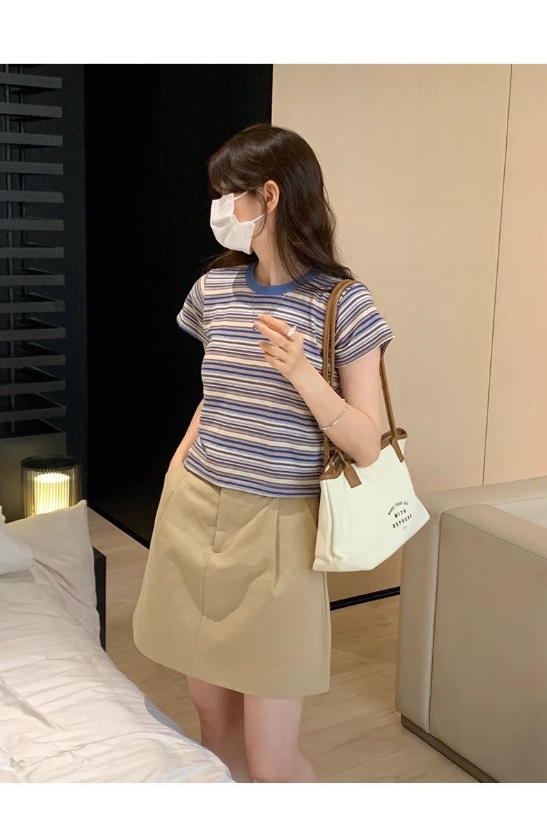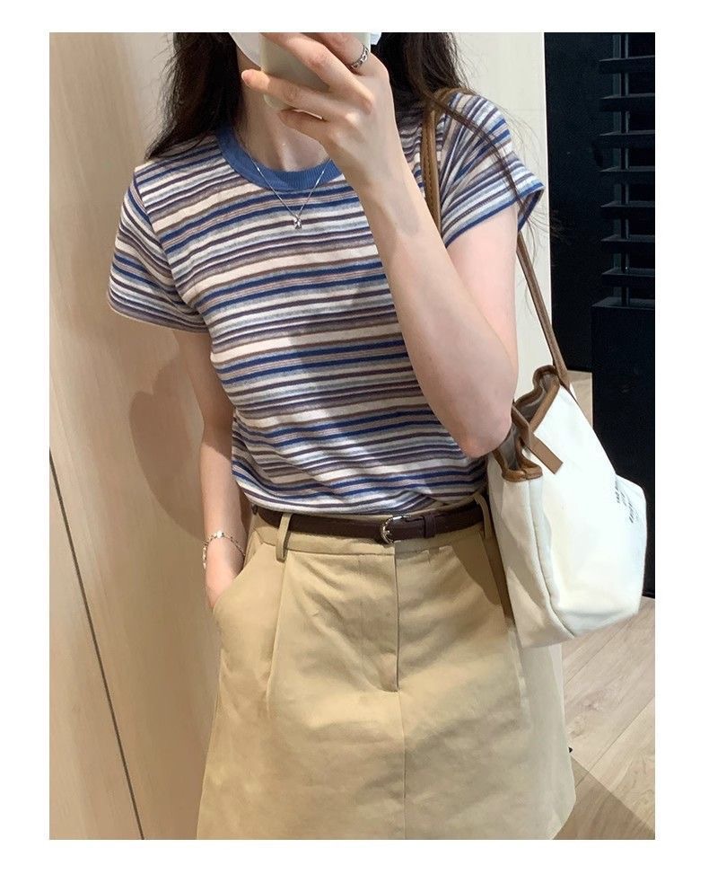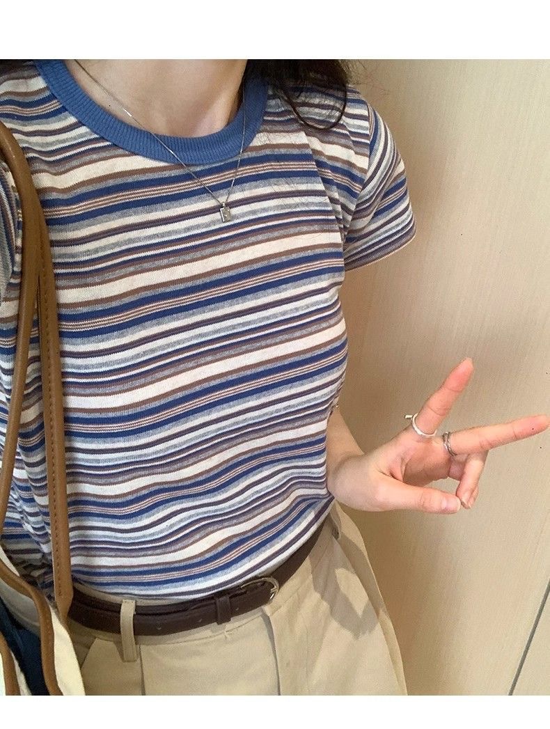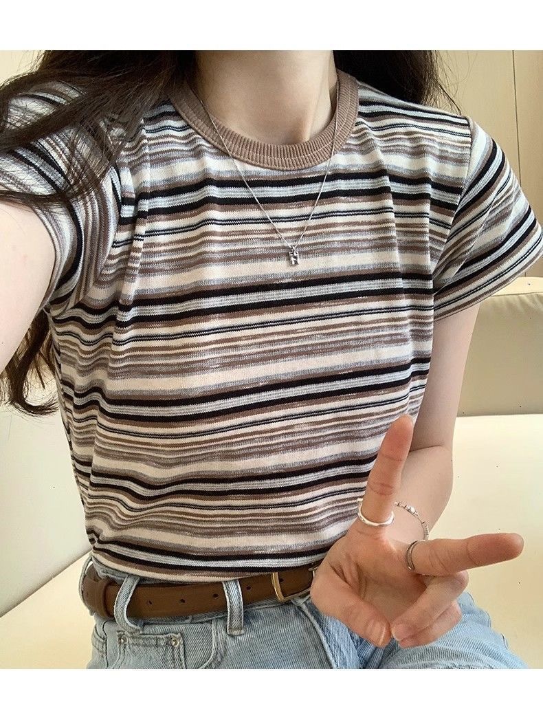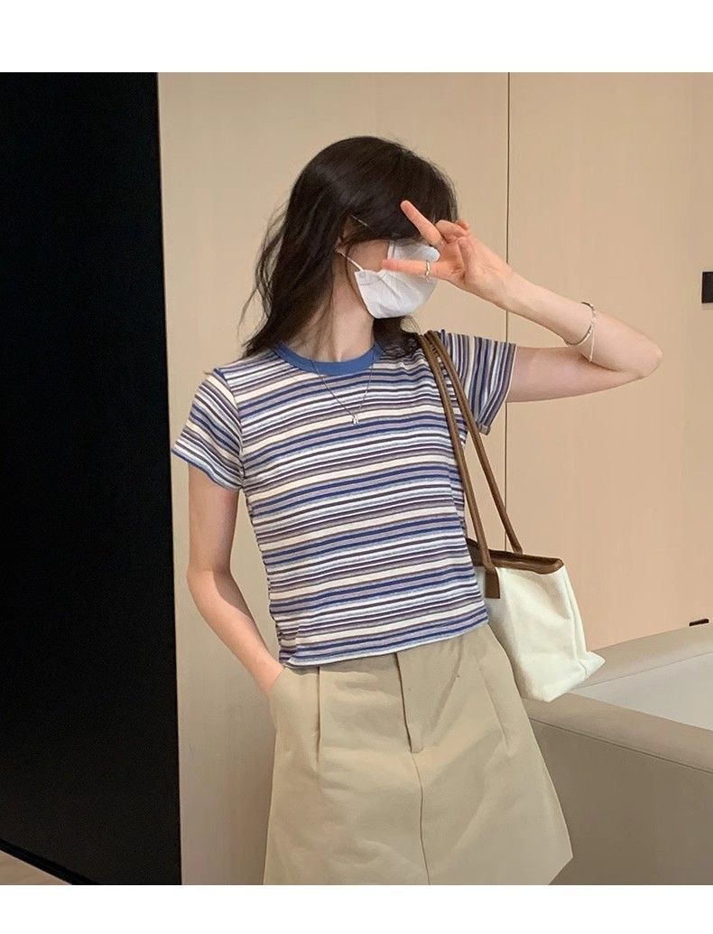 条纹正肩短袖t恤女夏夏季设计感小众小个子辣妹修身体恤短款上衣