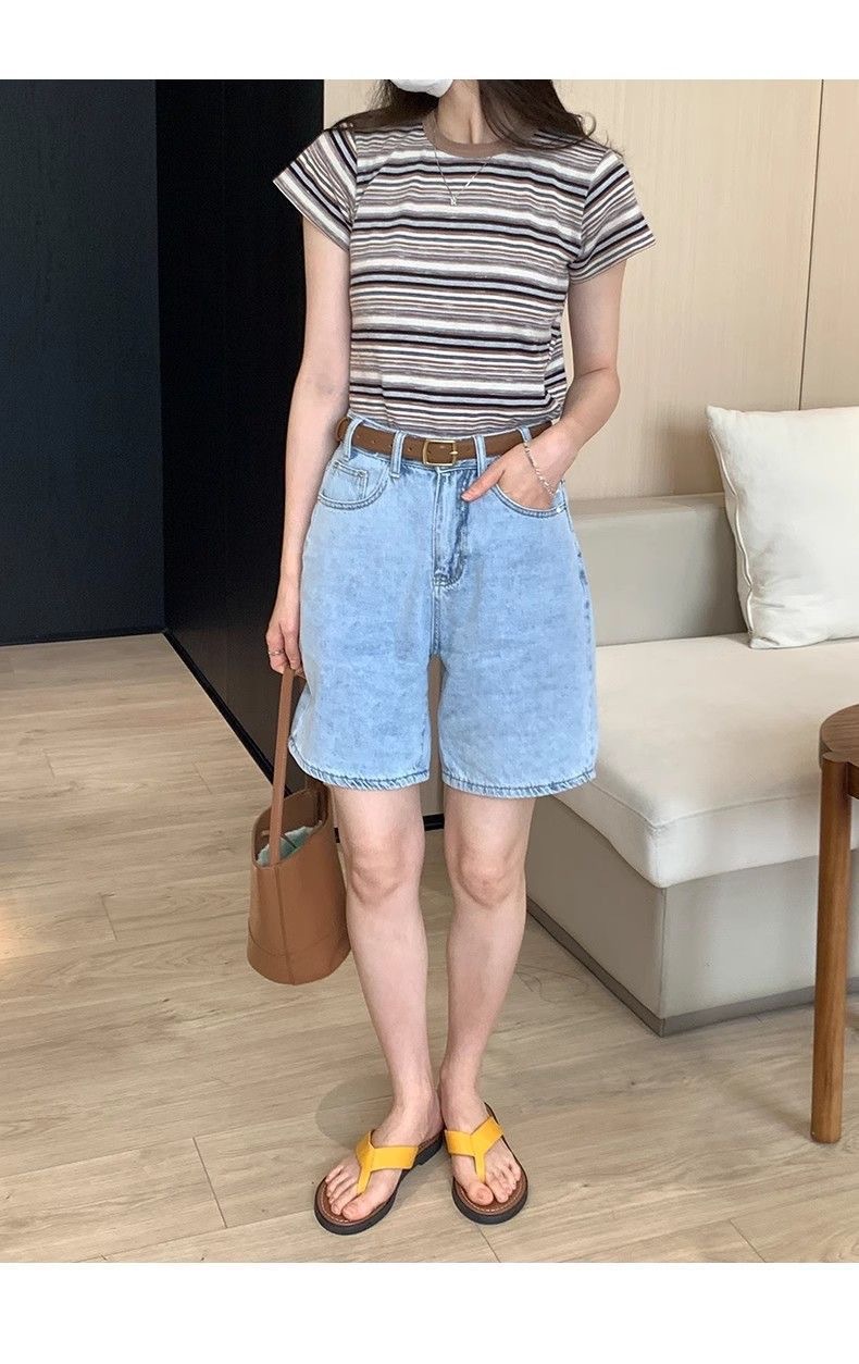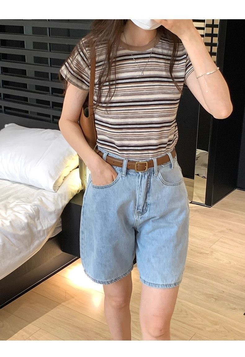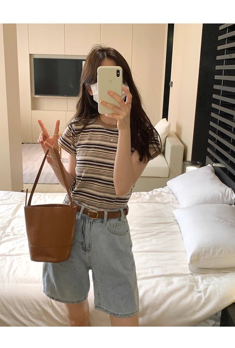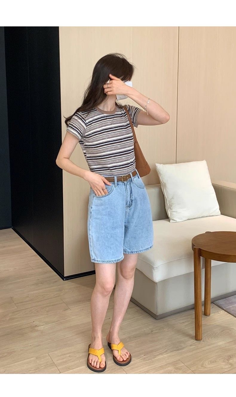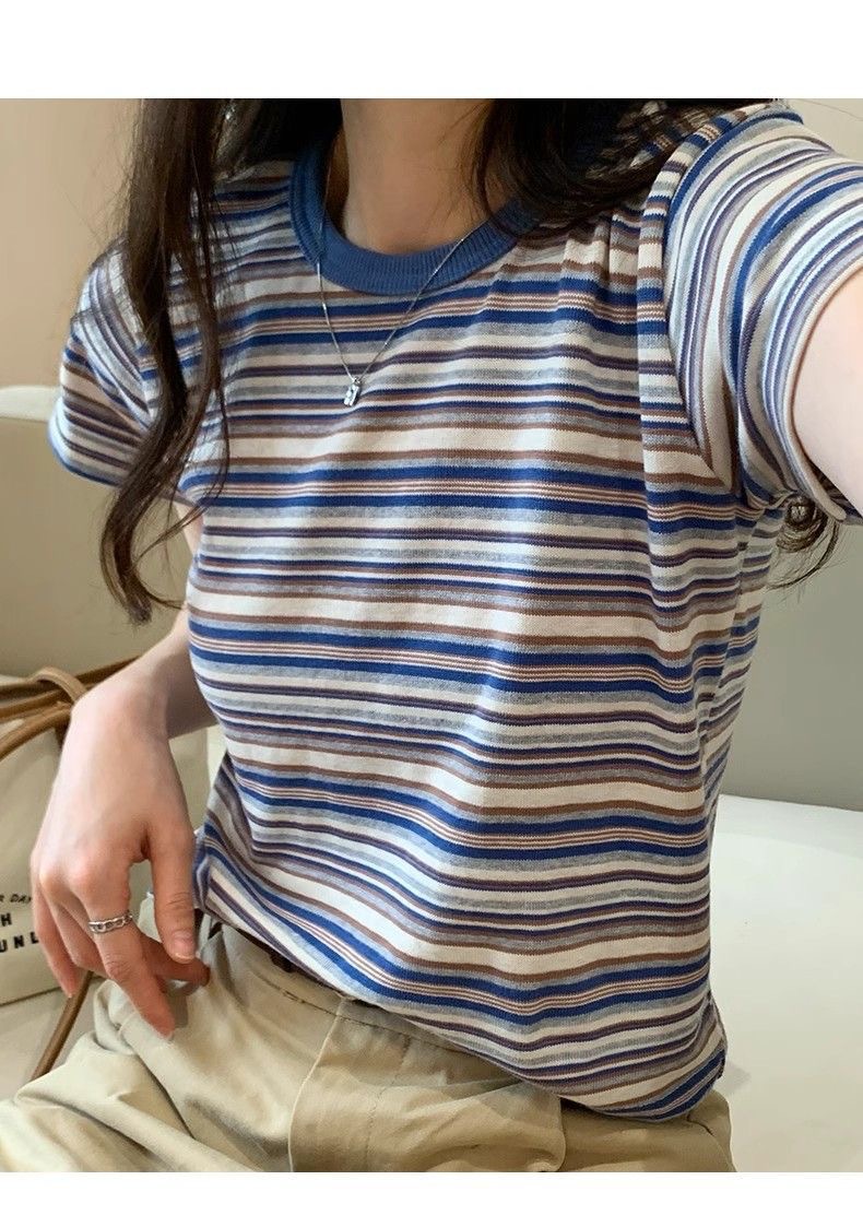 条纹正肩短袖t恤女夏夏季设计感小众小个子辣妹修身体恤短款上衣