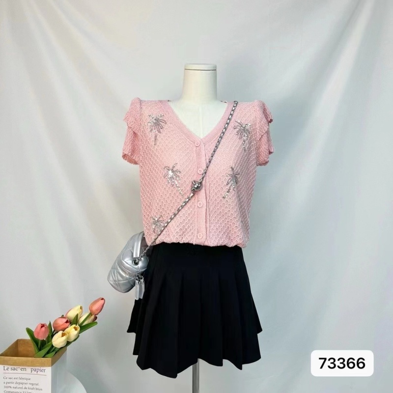 2024年夏季韩版高级感V领椰树亮片双层袖开衫百搭上衣好看