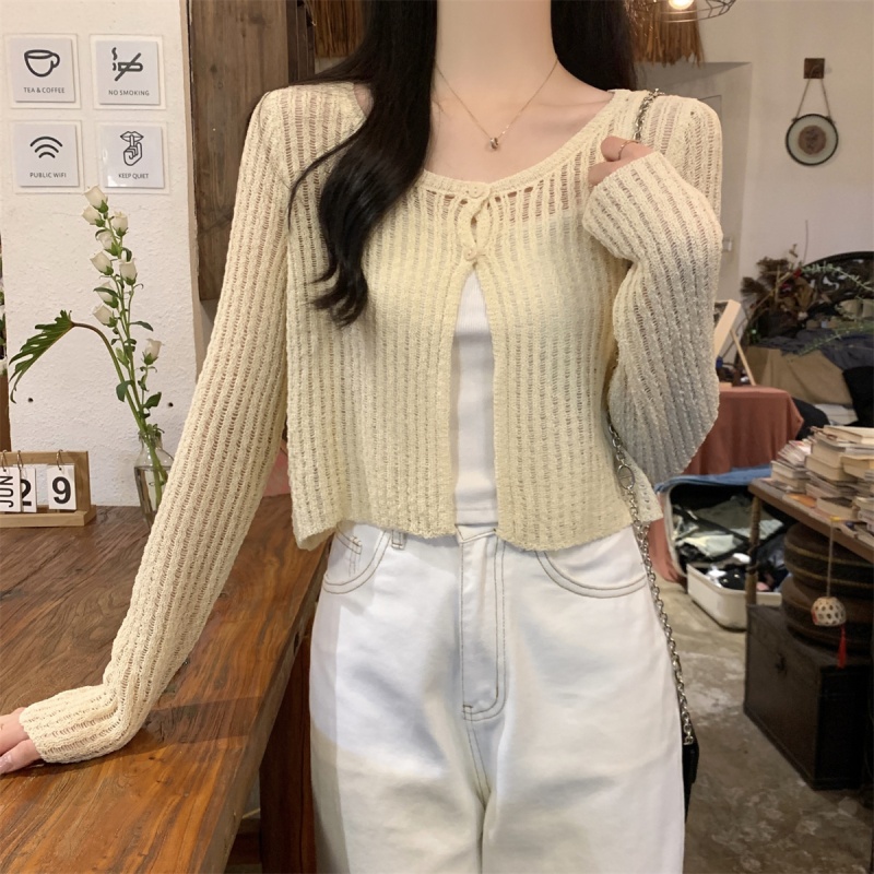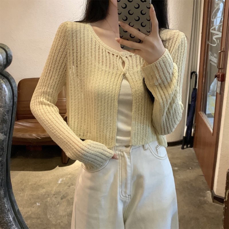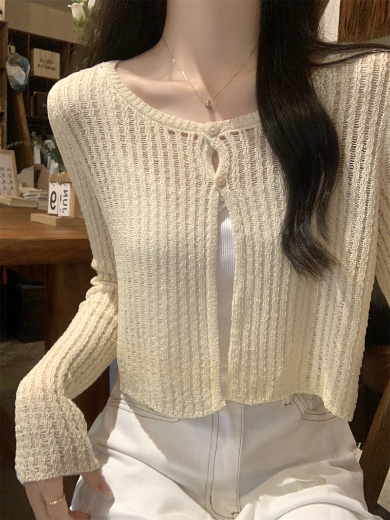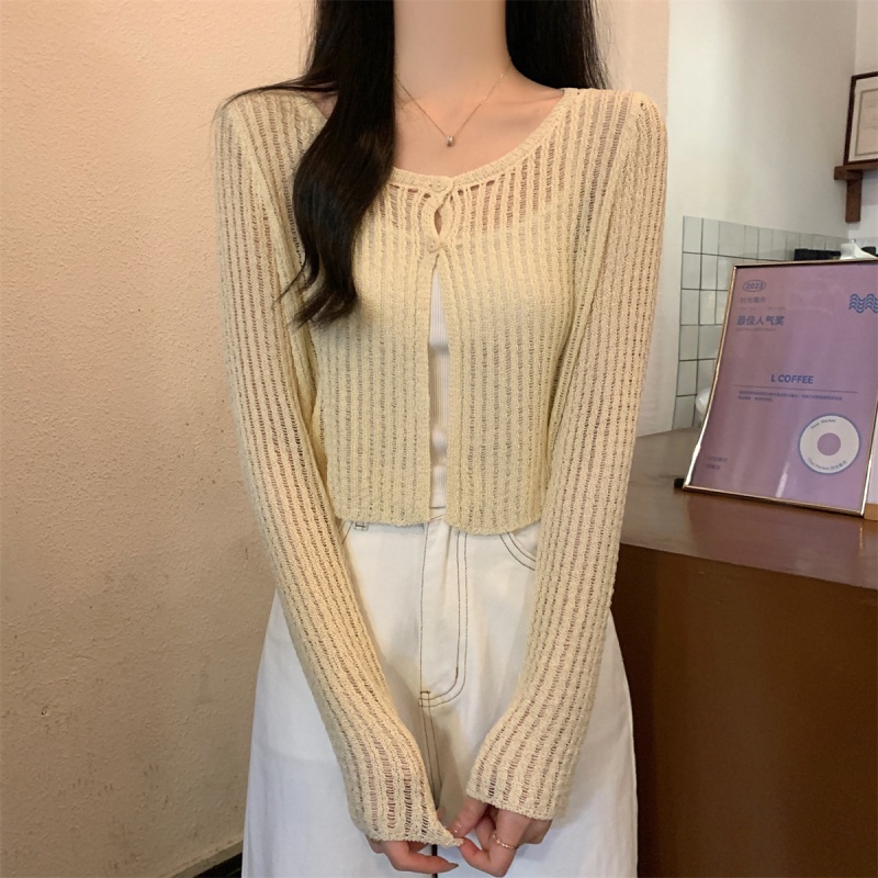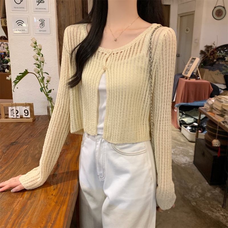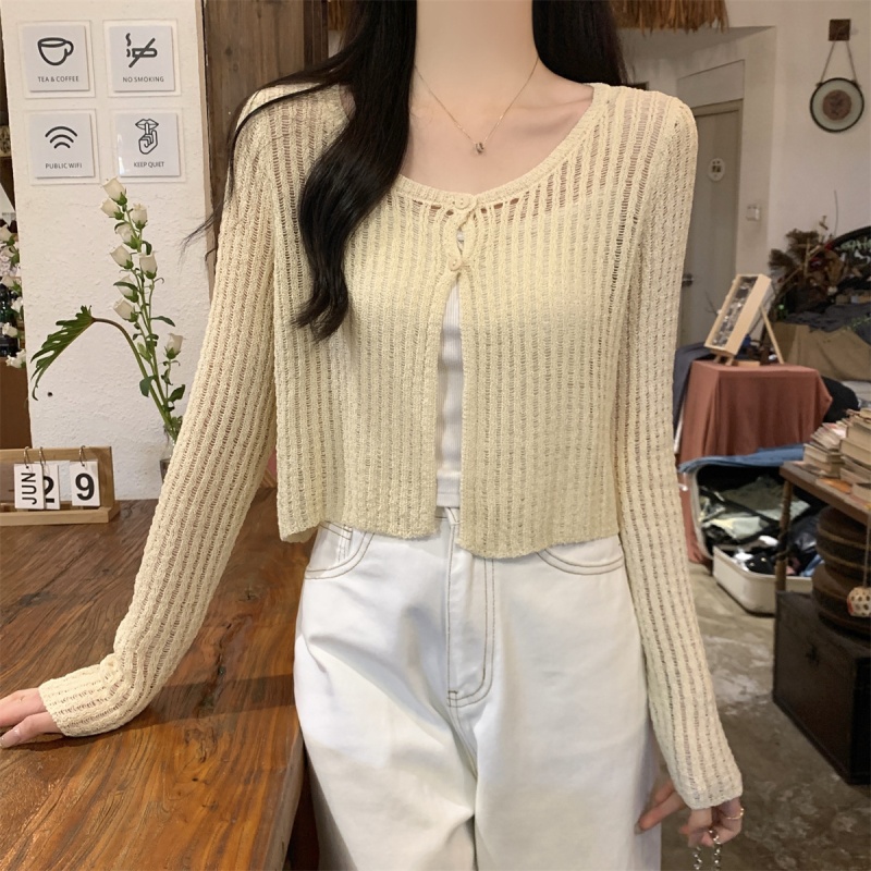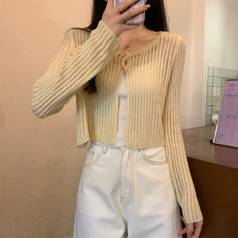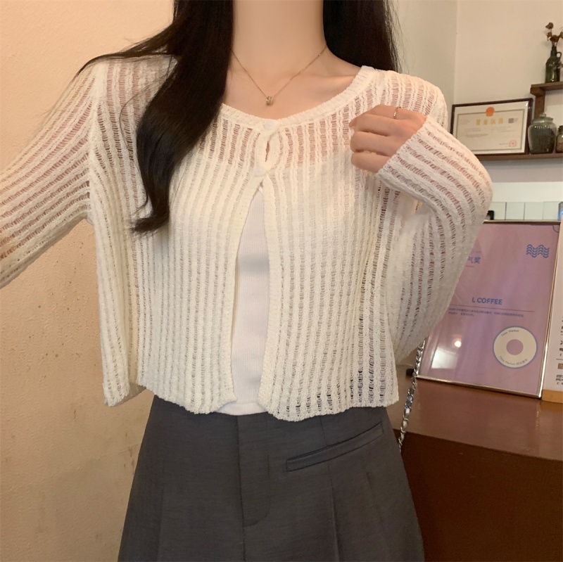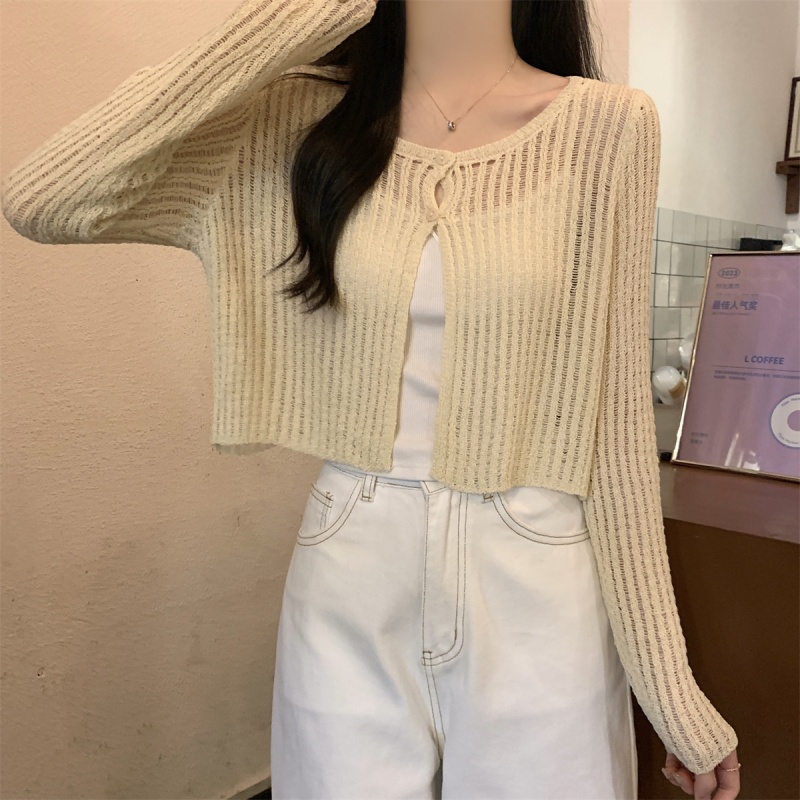 2024夏季韩版修身显瘦小众短款镂空长袖薄款防晒针织开衫外搭上衣