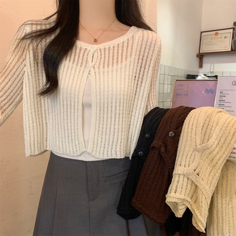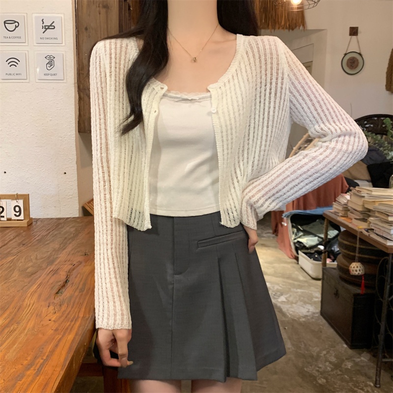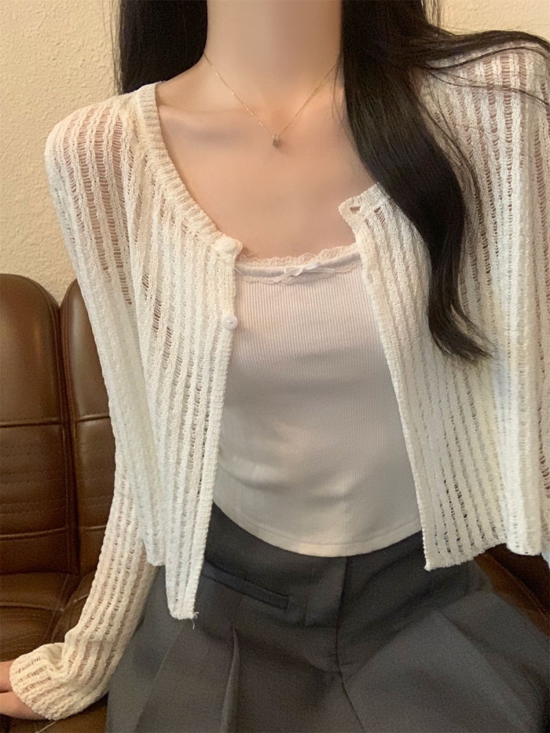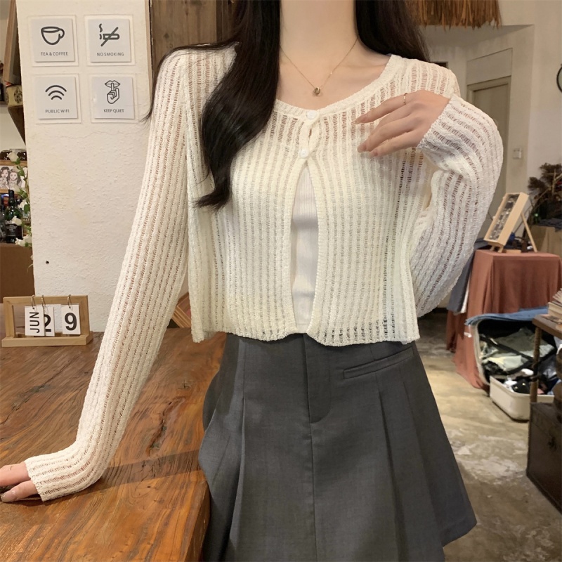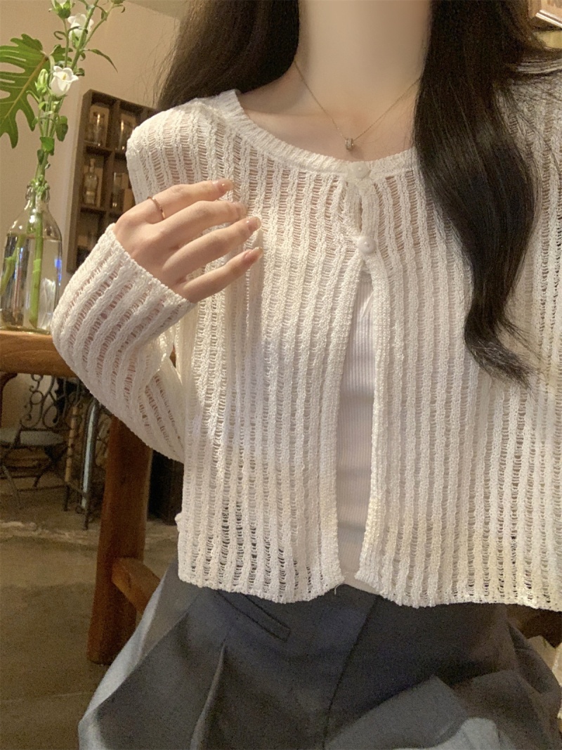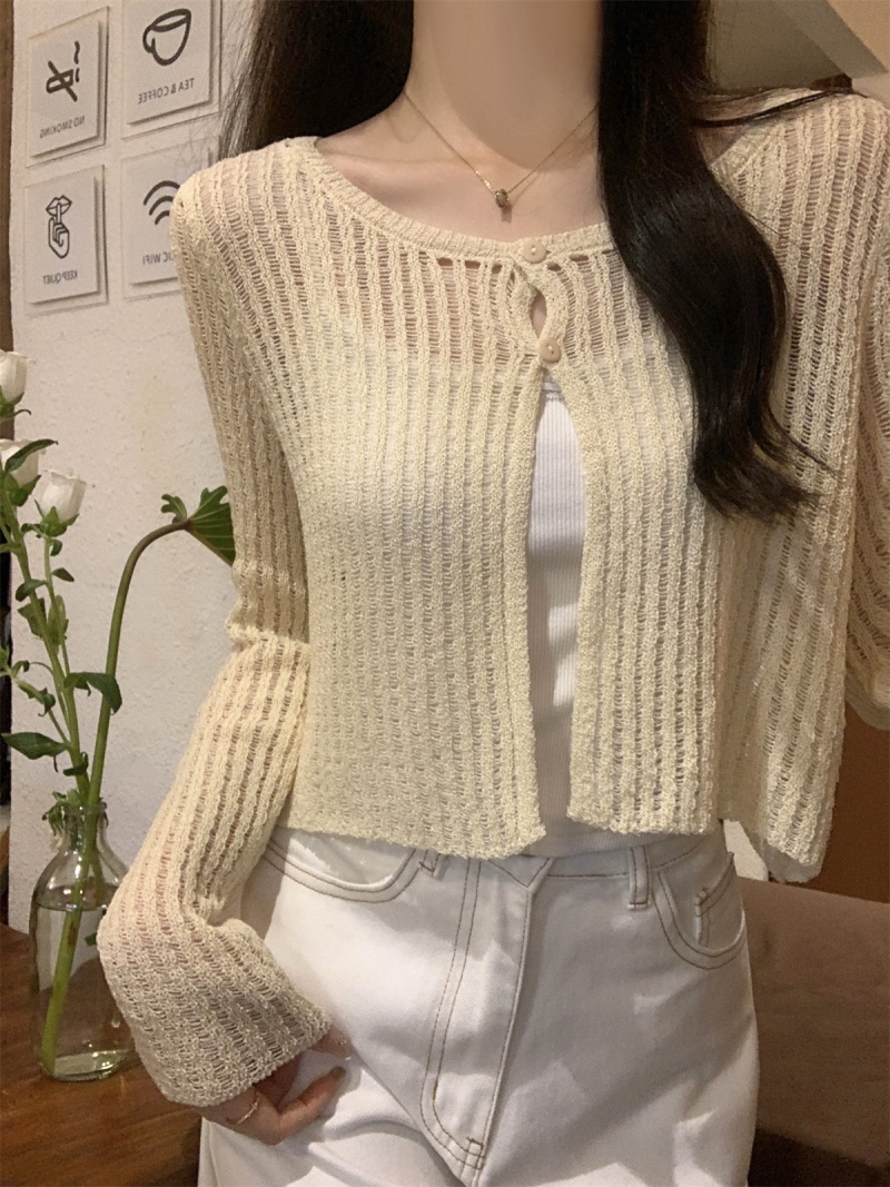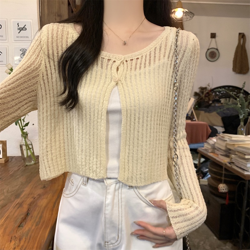 2024夏季韩版修身显瘦小众短款镂空长袖薄款防晒针织开衫外搭上衣