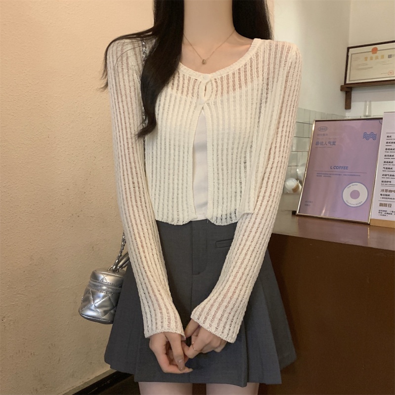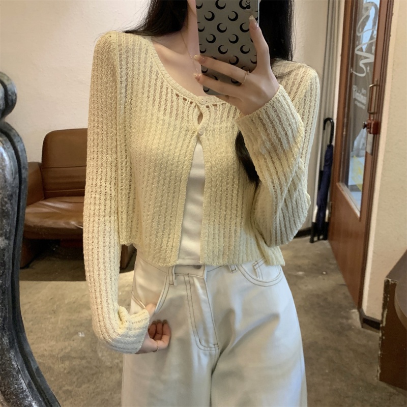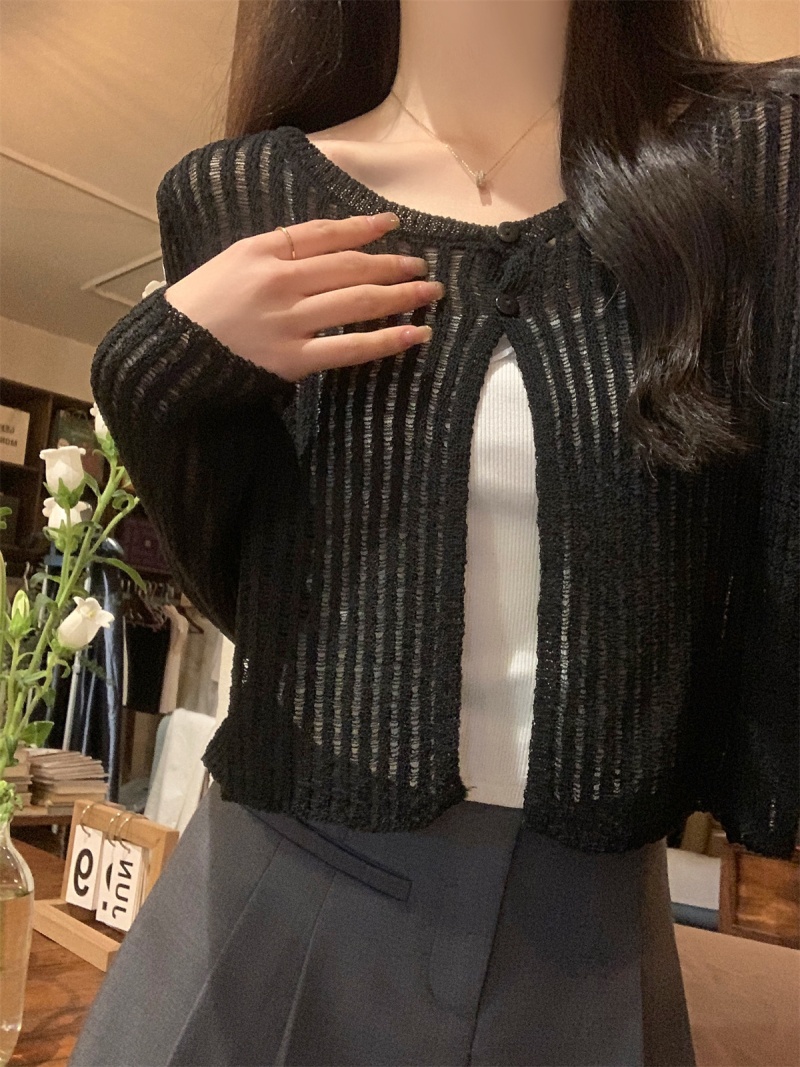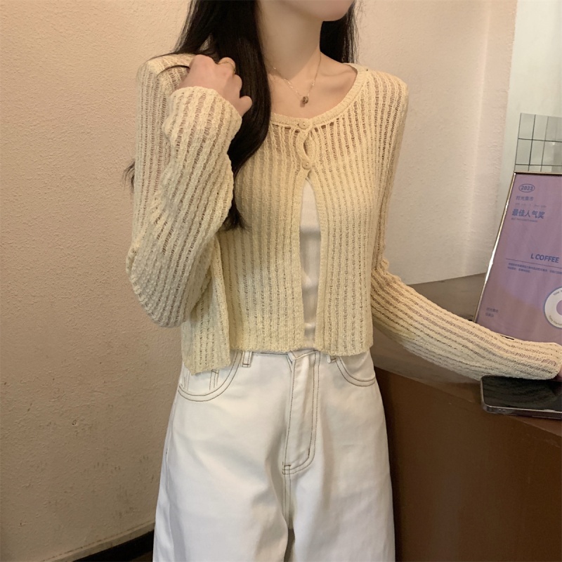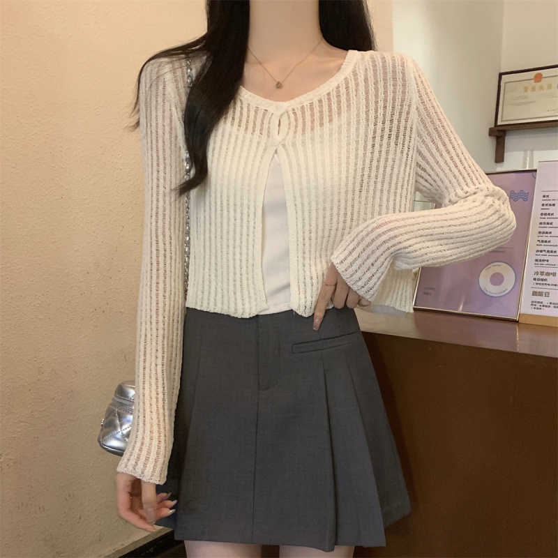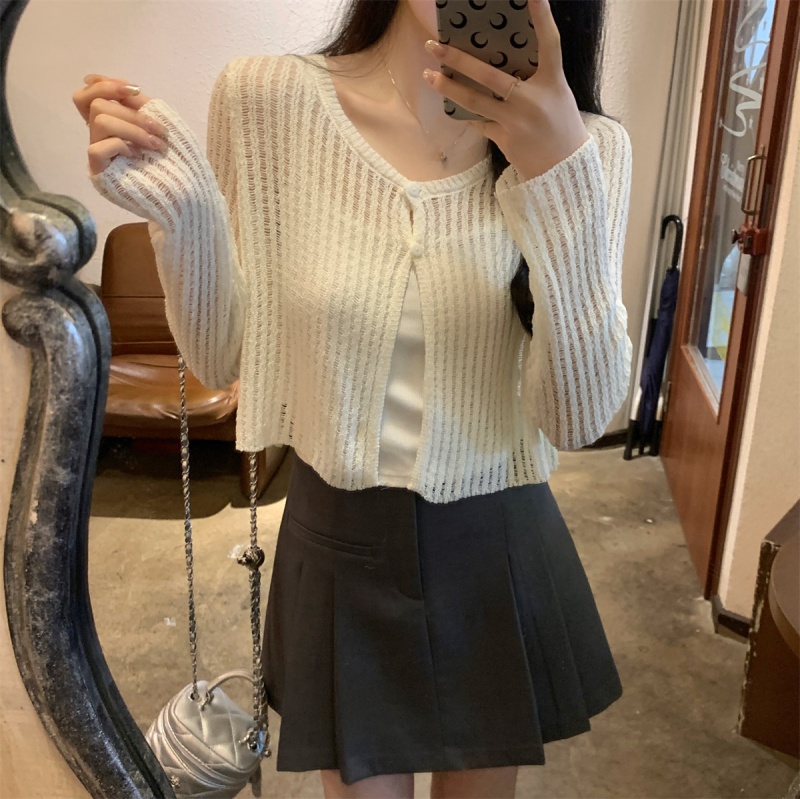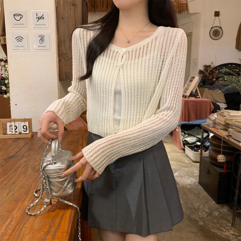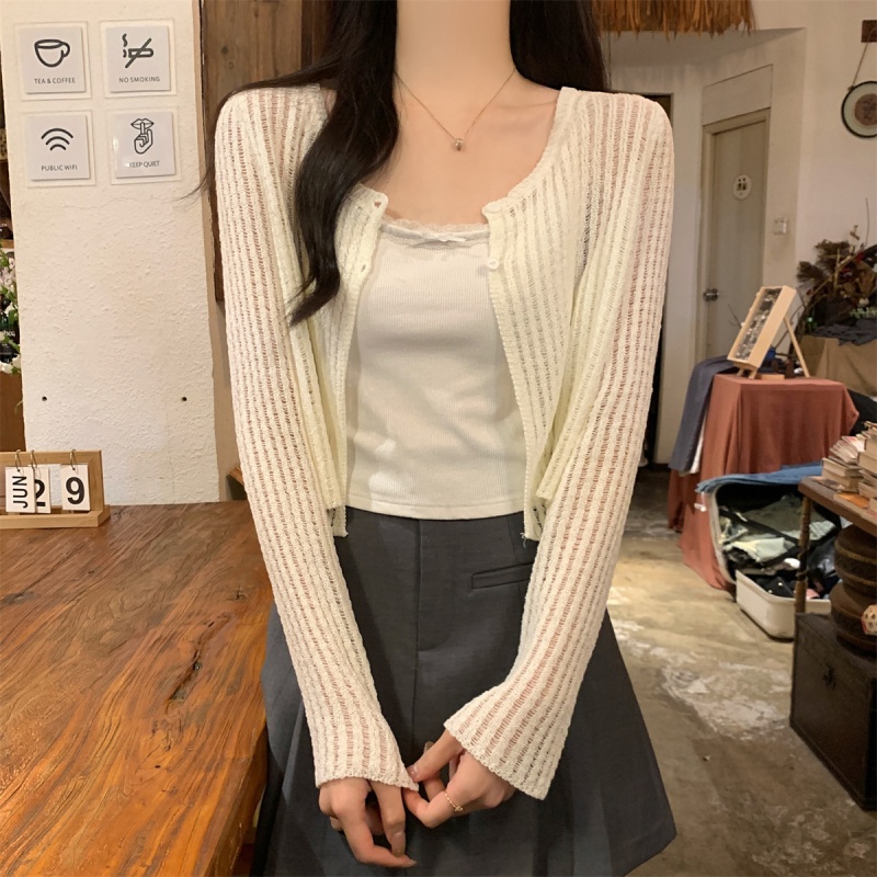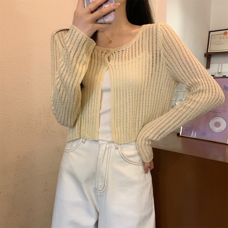 2024夏季韩版修身显瘦小众短款镂空长袖薄款防晒针织开衫外搭上衣