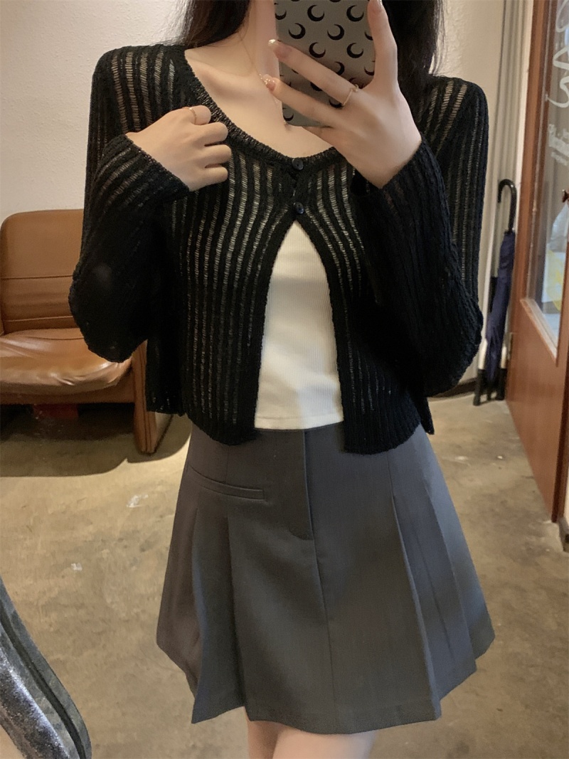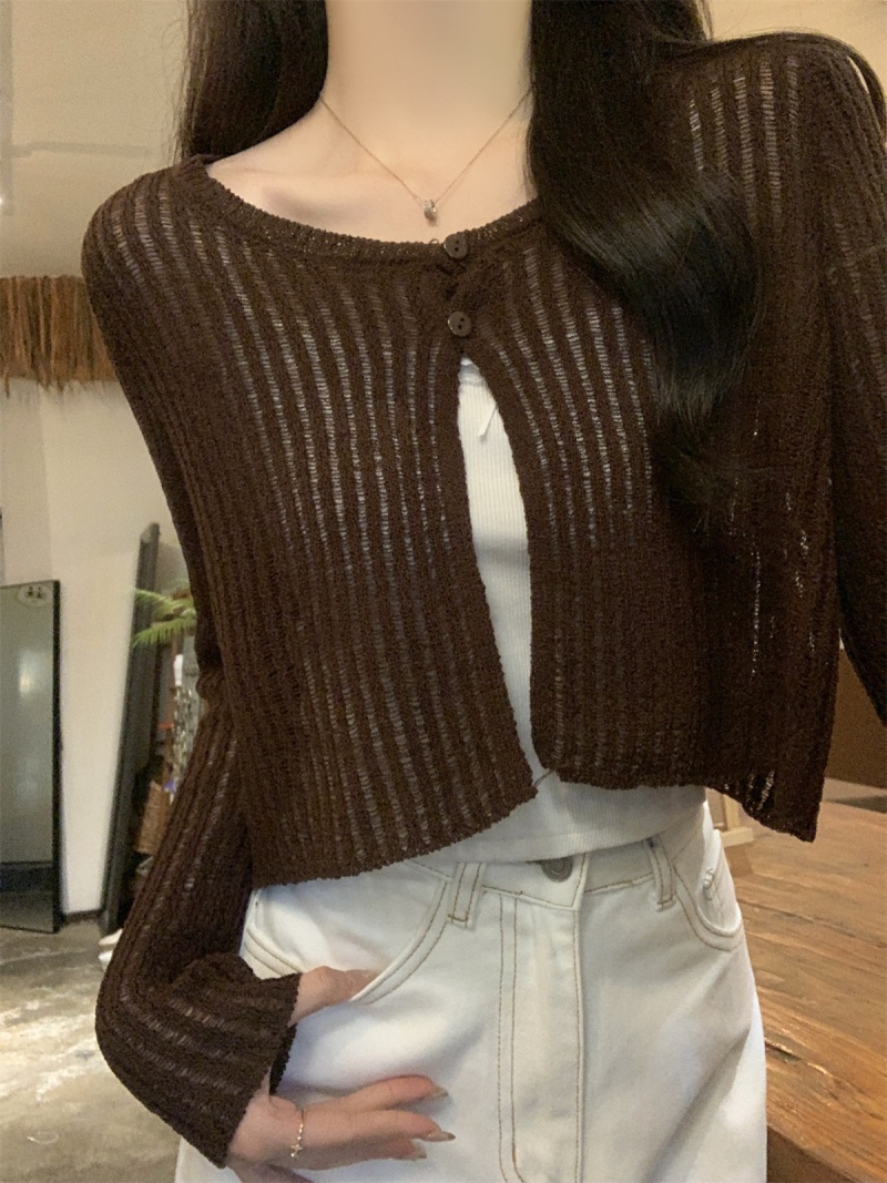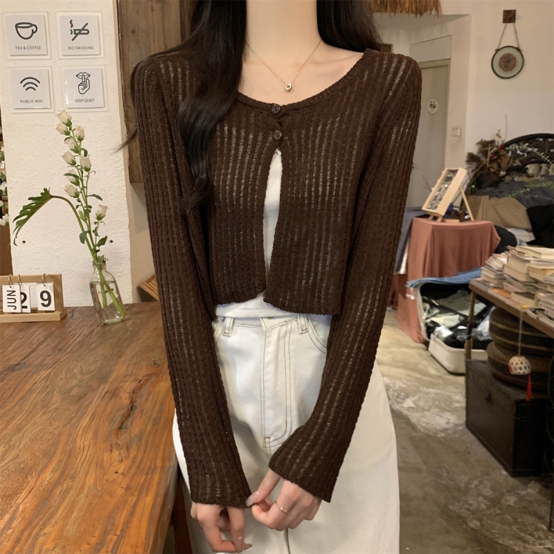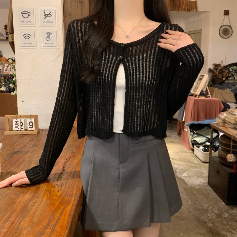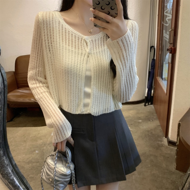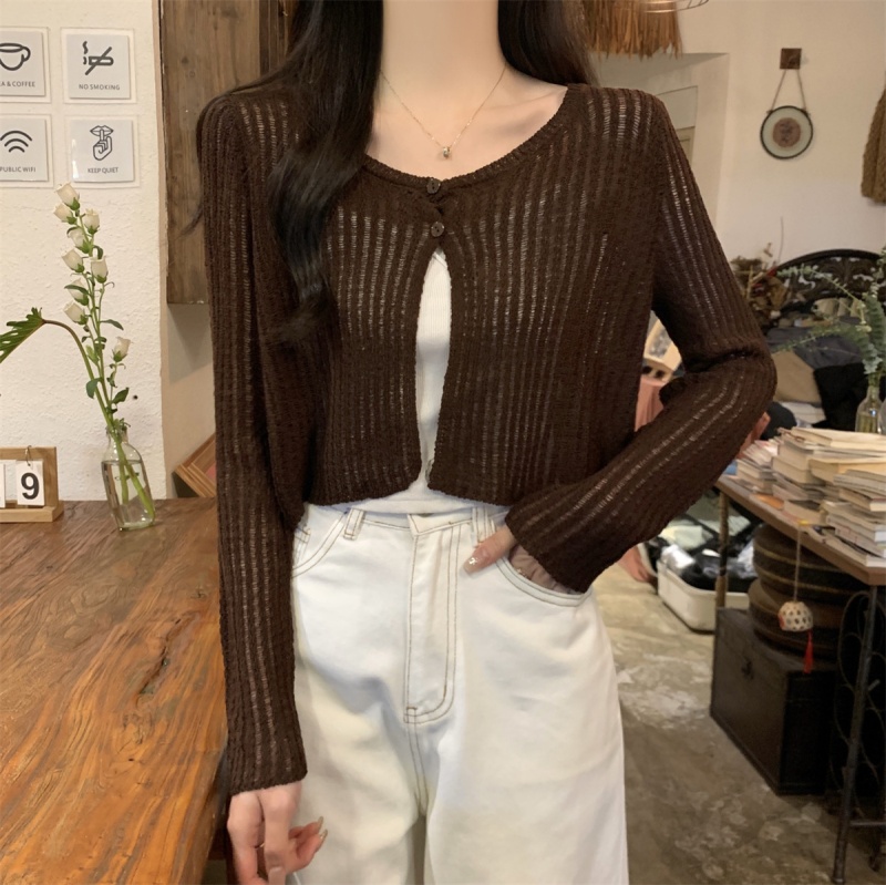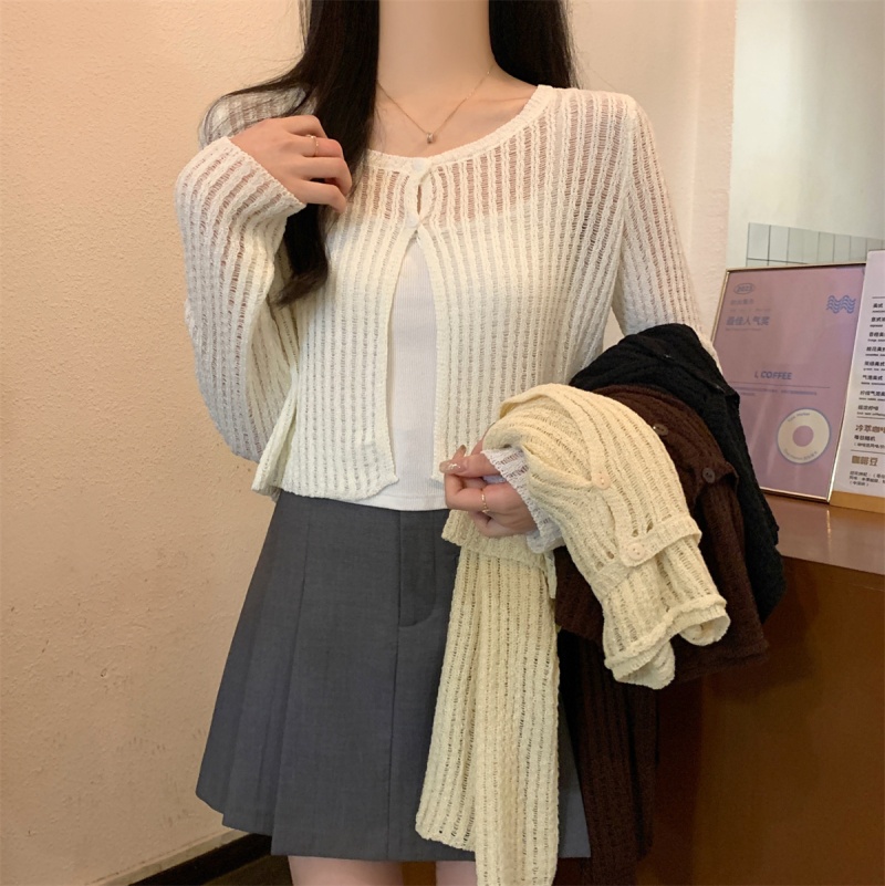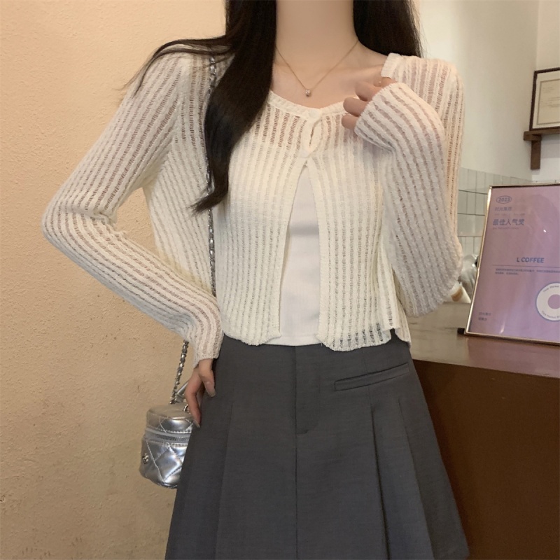 2024夏季韩版修身显瘦小众短款镂空长袖薄款防晒针织开衫外搭上衣