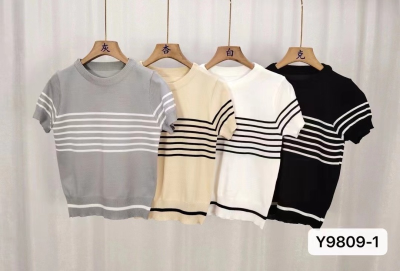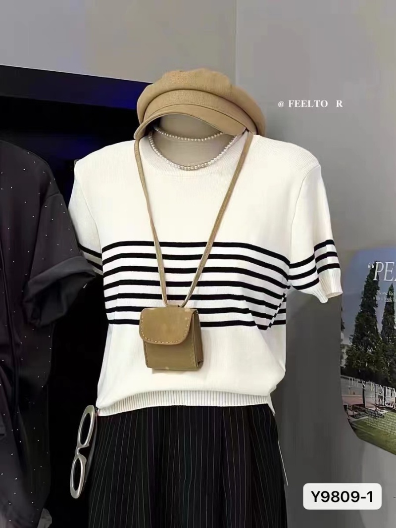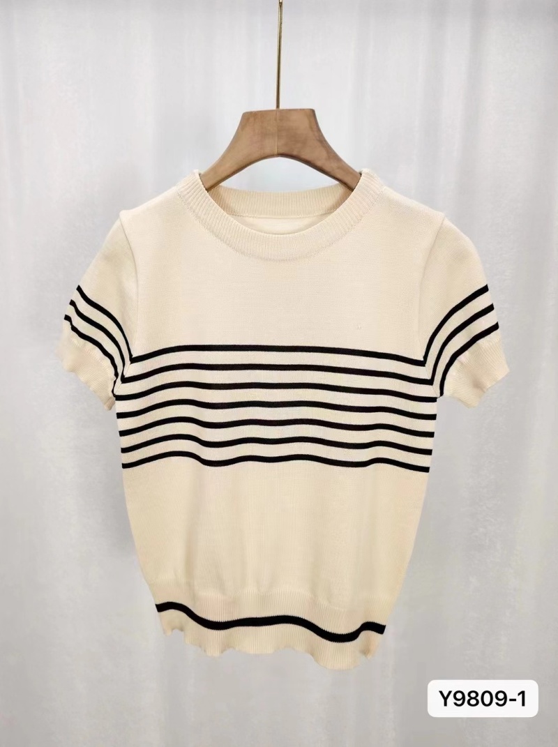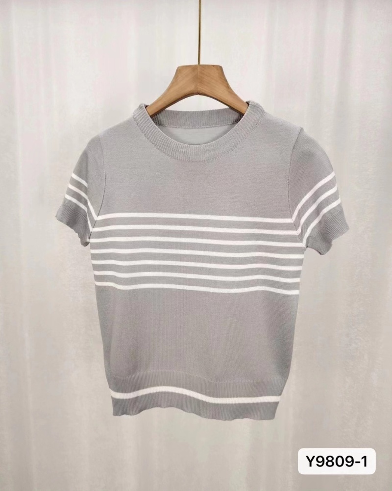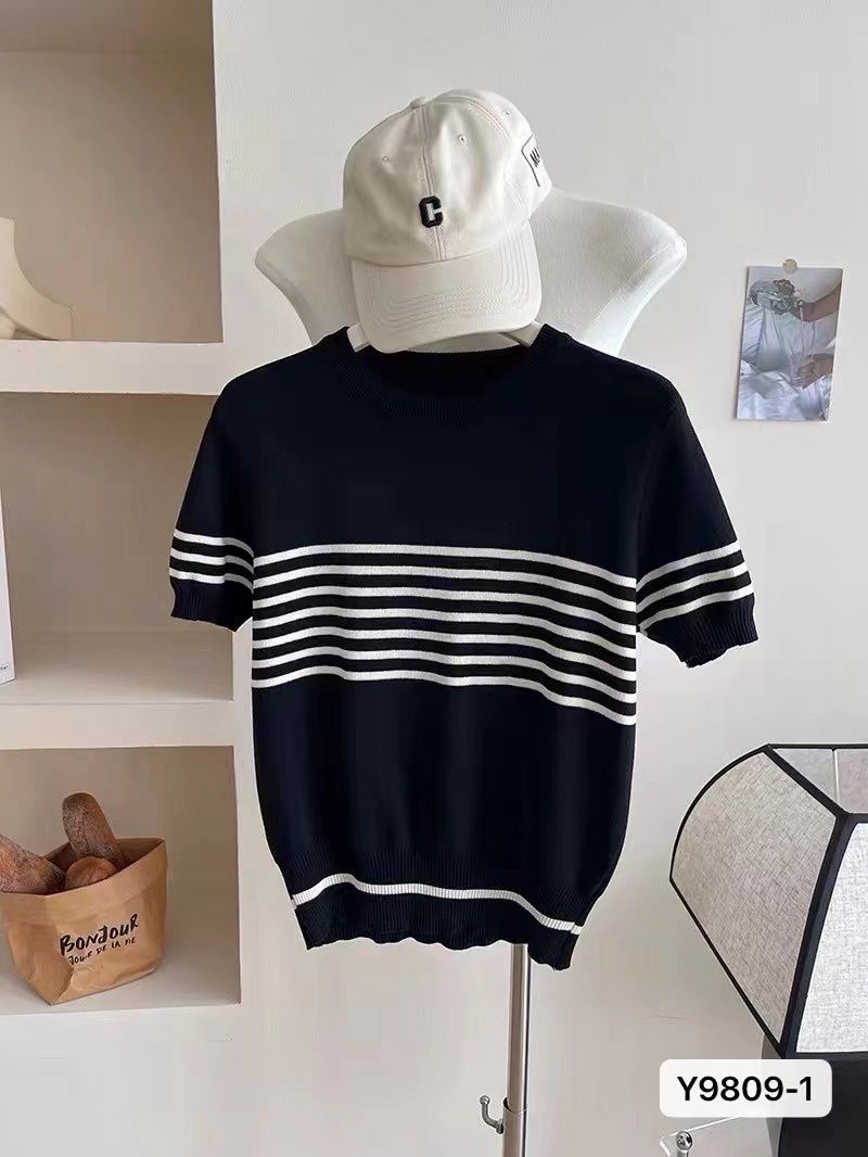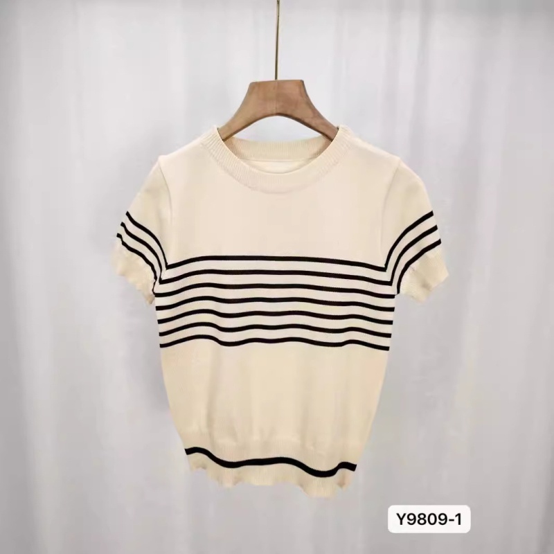 韩版复古百搭修身短袖条纹针织衫女2024年夏季宽松显瘦短款上衣潮