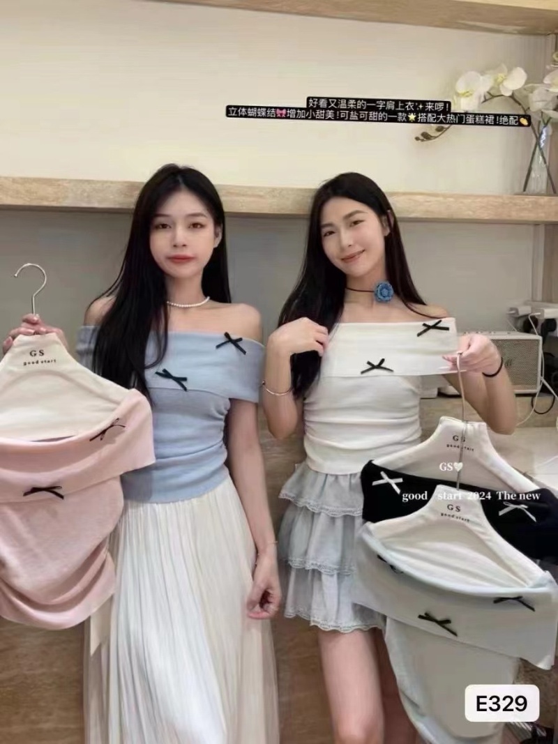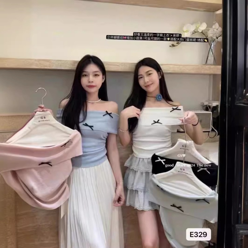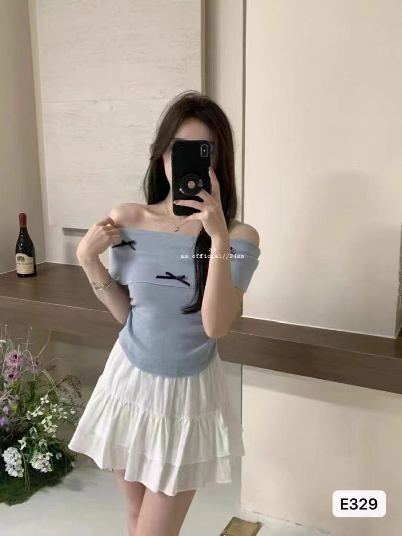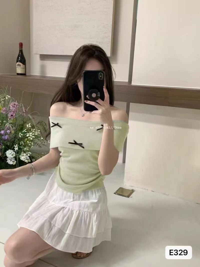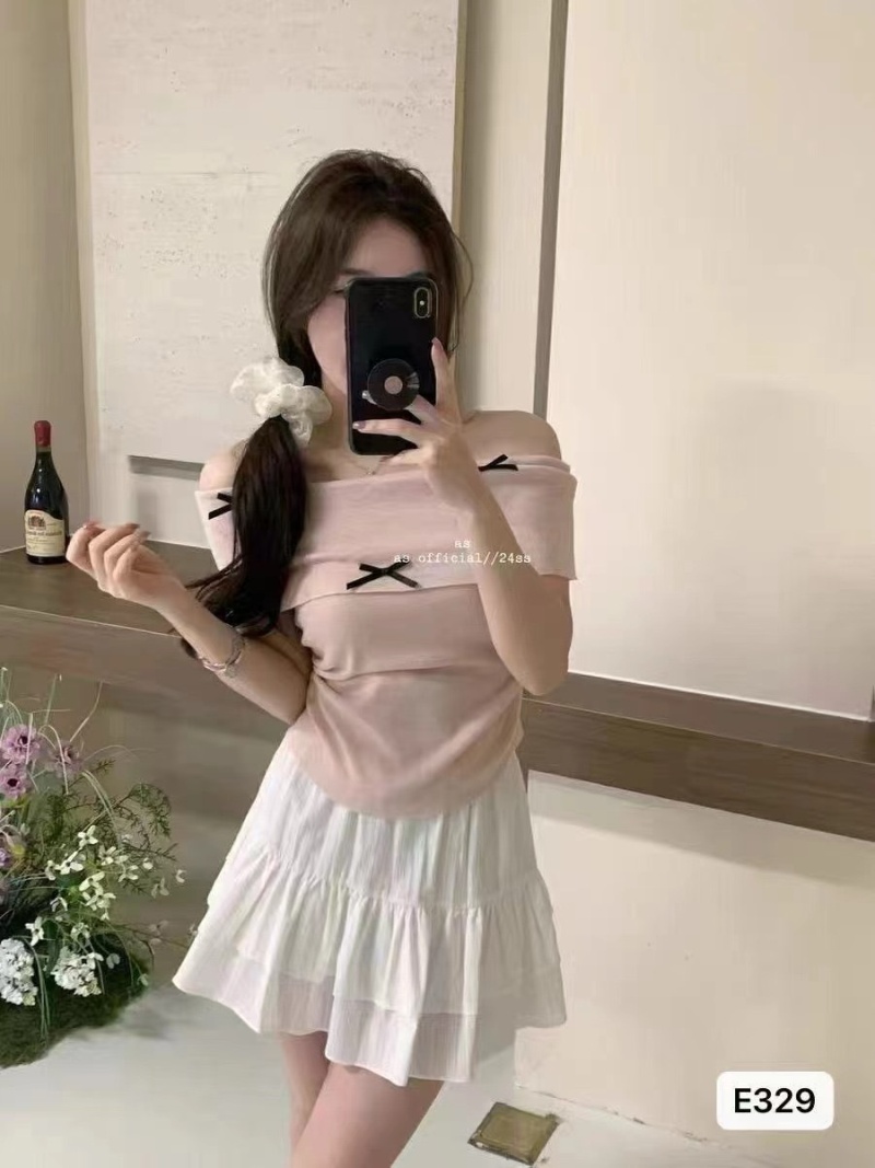 2024夏季新款纯欲温柔一字肩修身百搭时尚蝴蝶结收腰短袖上衣女