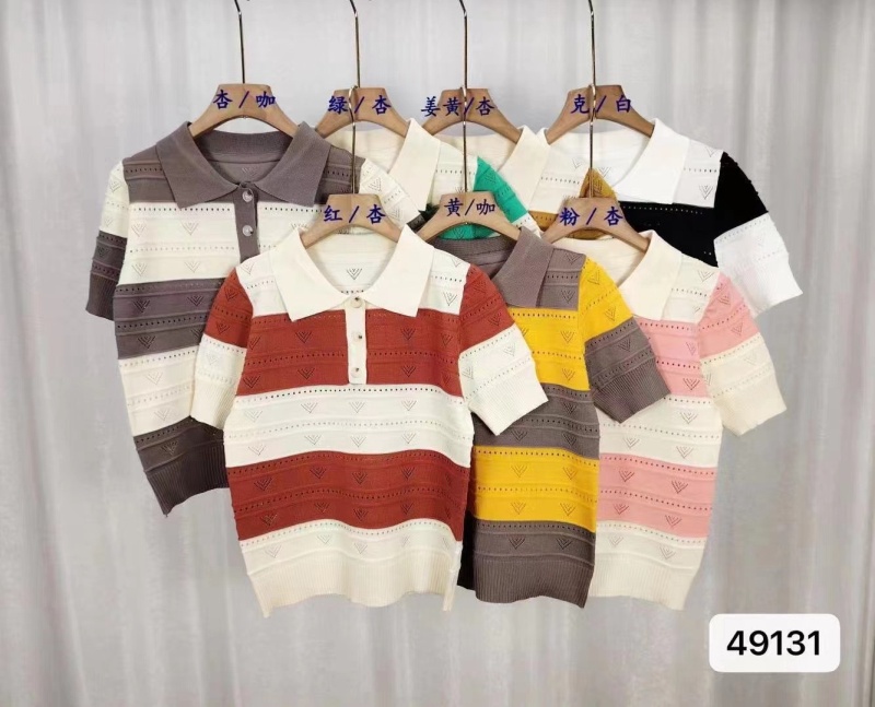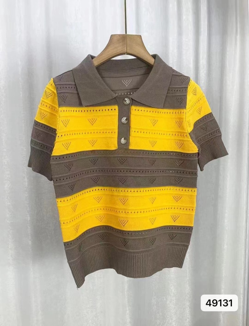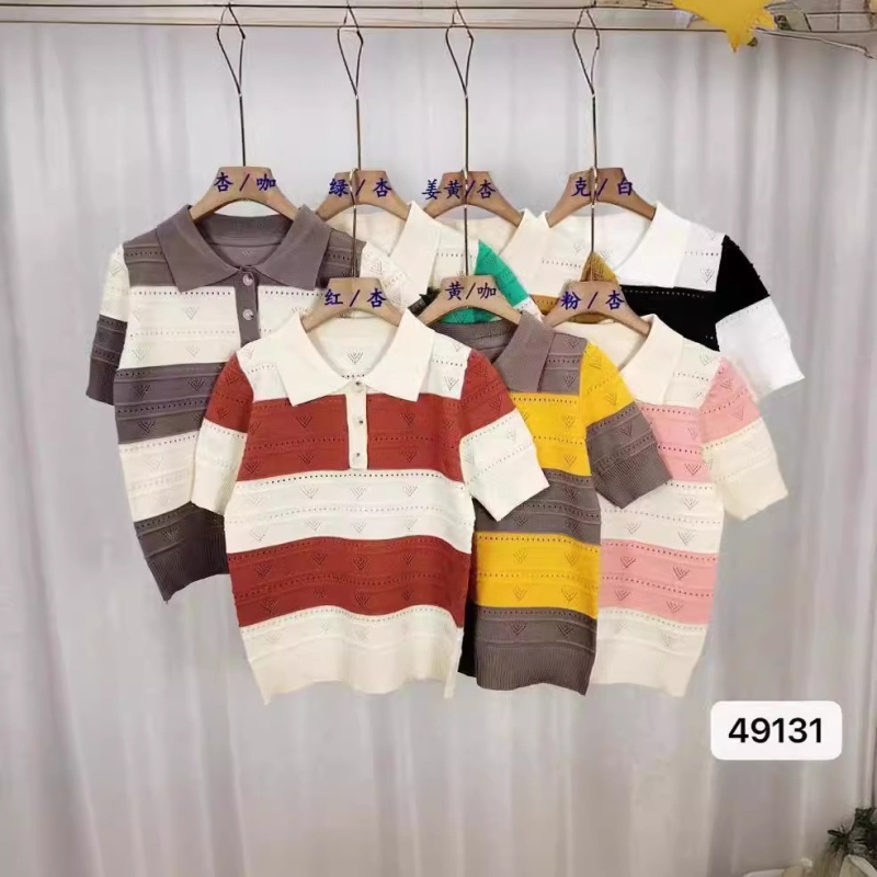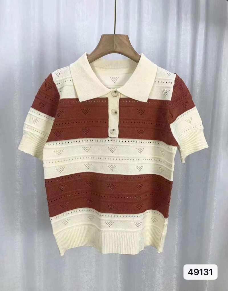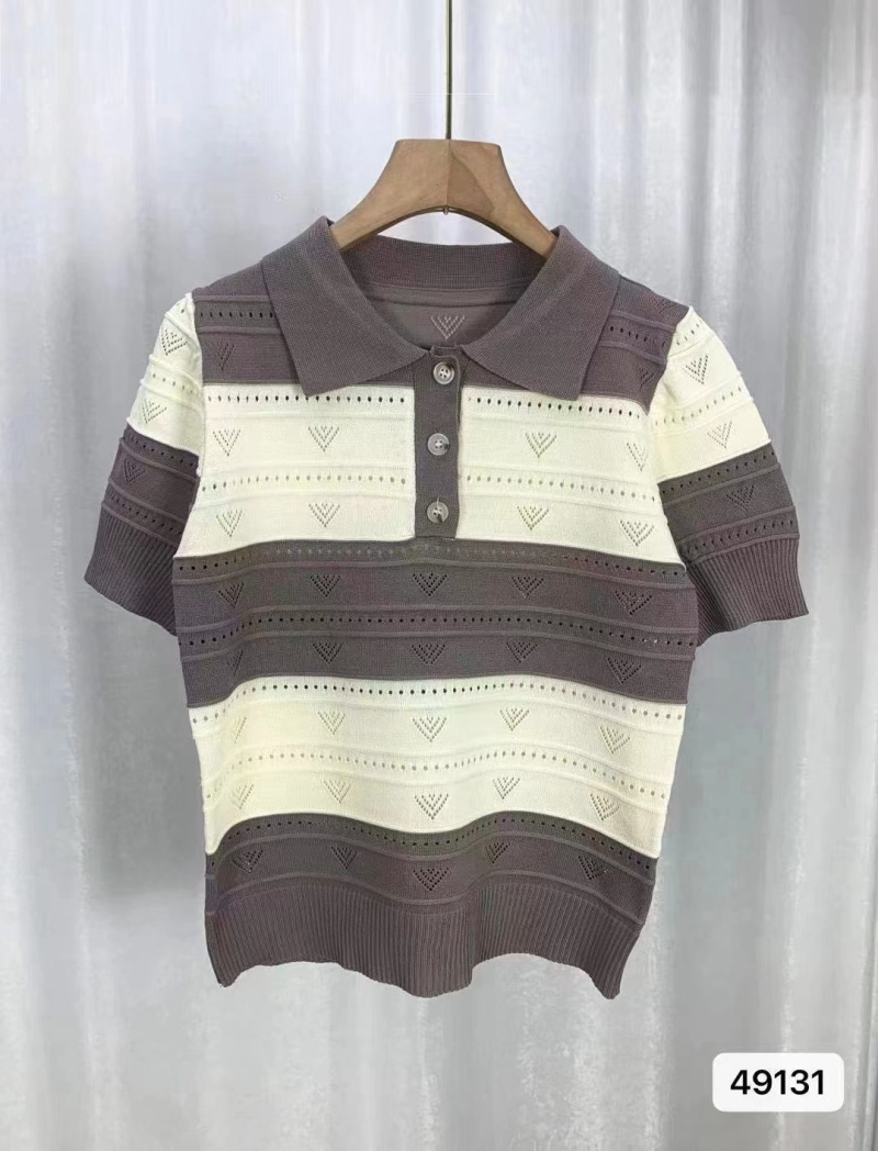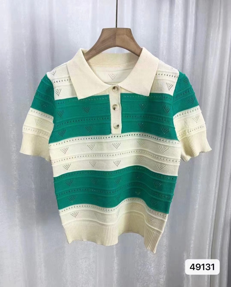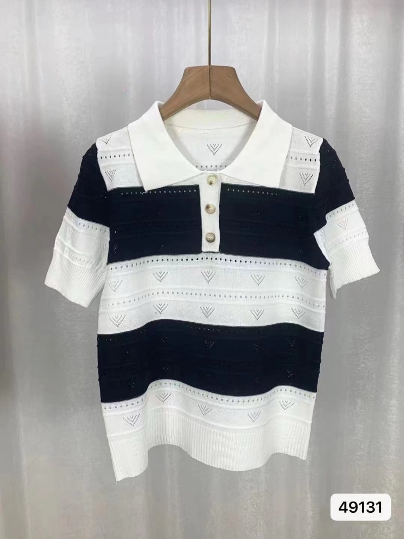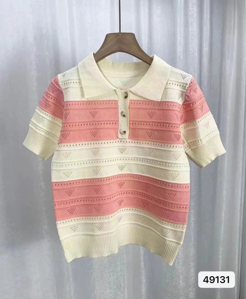 2024夏季新款韩版甜美清新时尚翻领撞色条纹镂空短袖短款上衣女潮