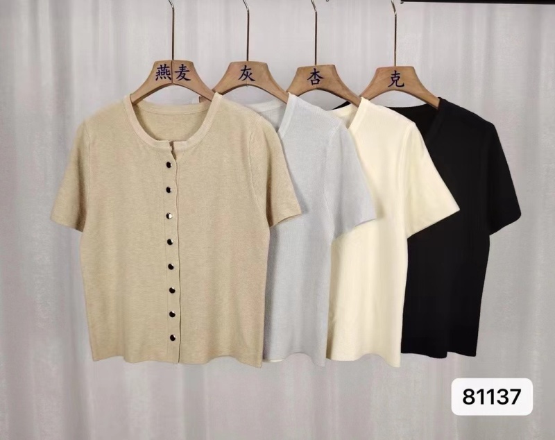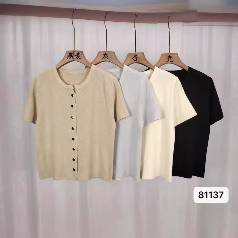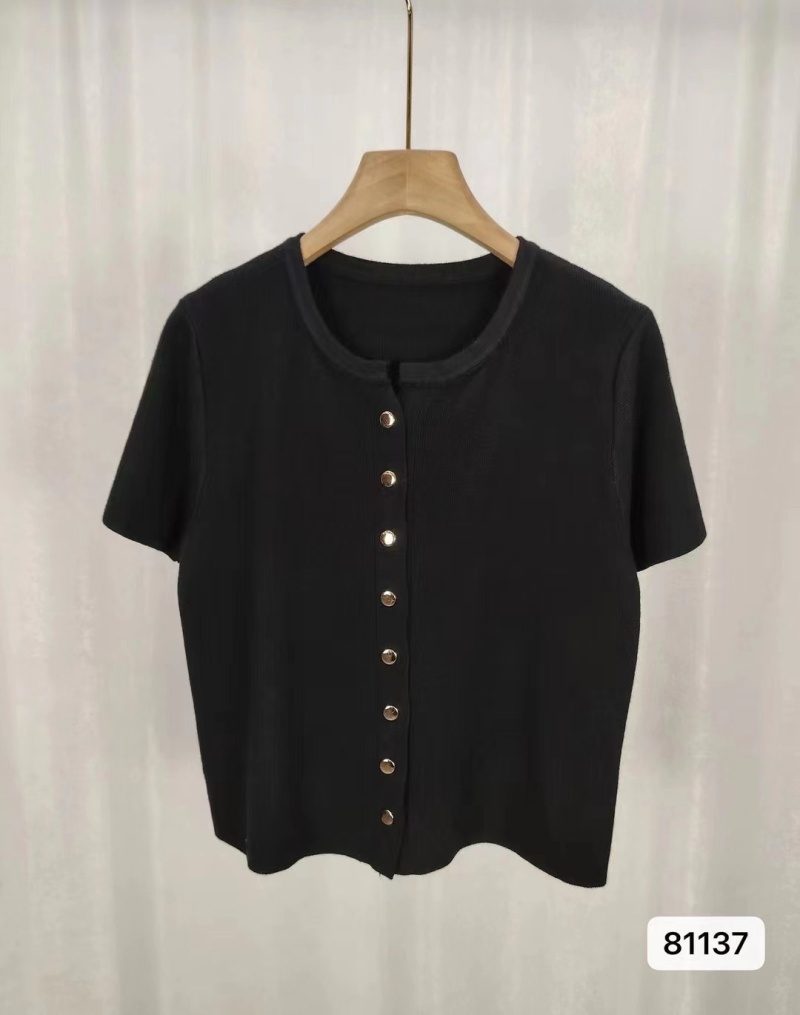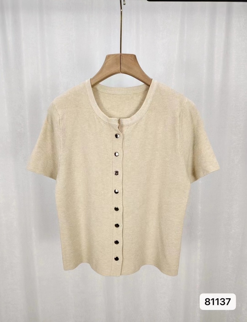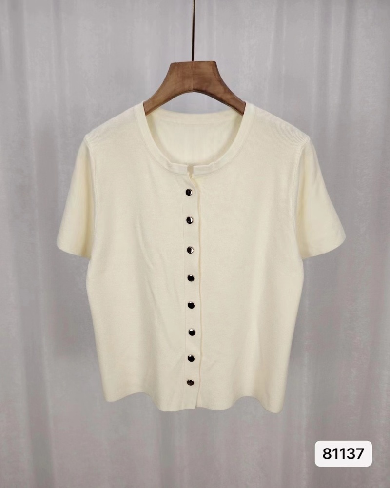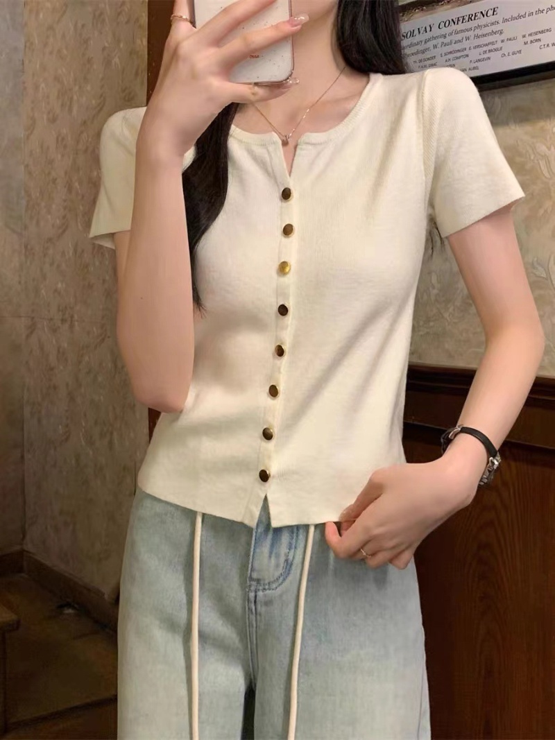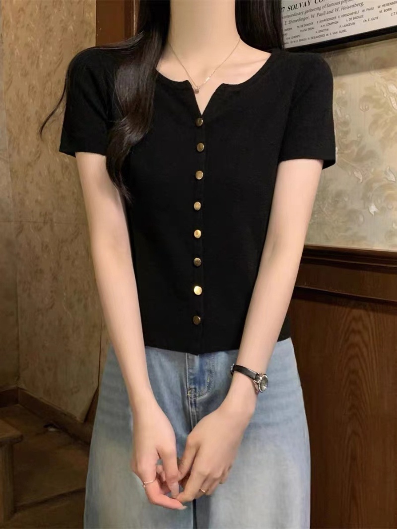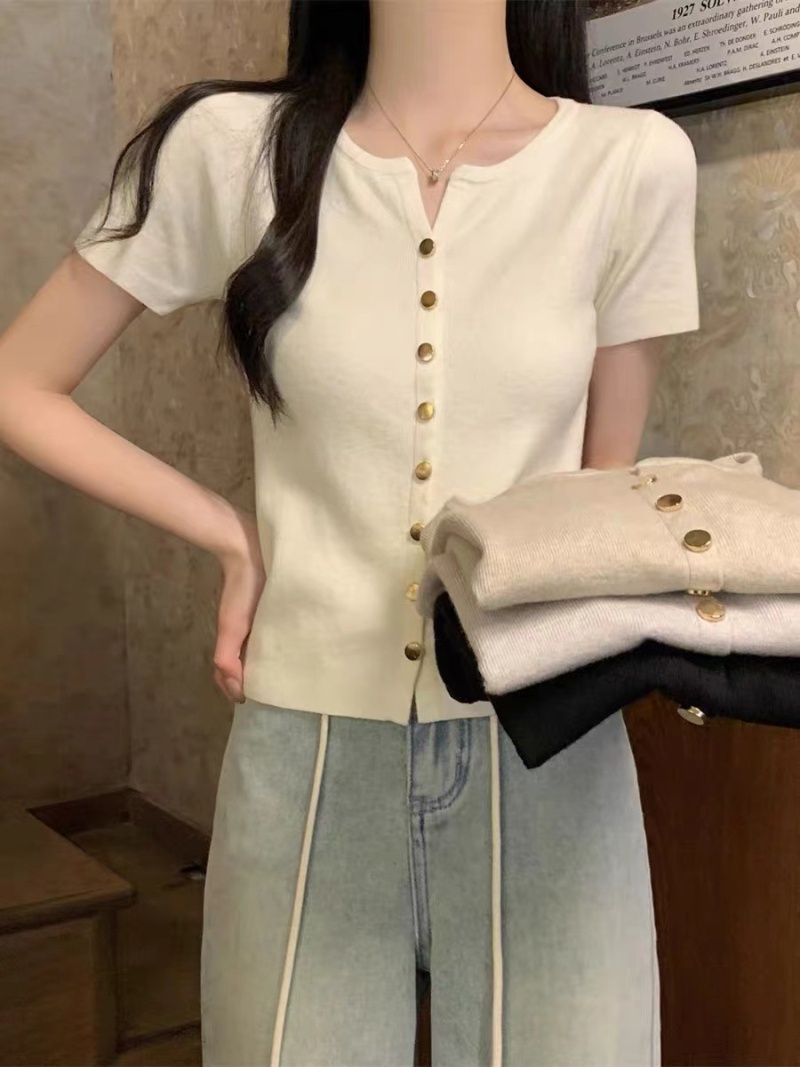 2024年夏季韩版百搭简约软糯单排扣纯色针织短袖金属扣开衫女上衣