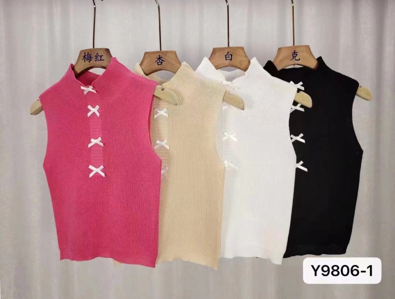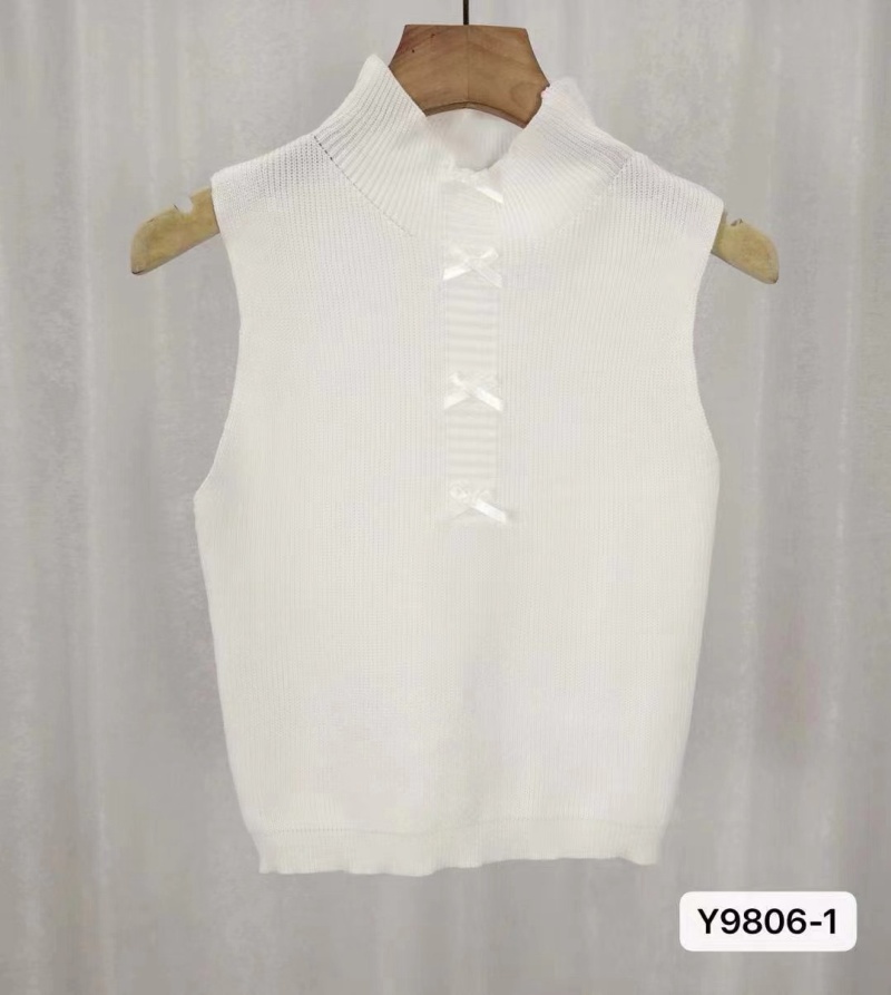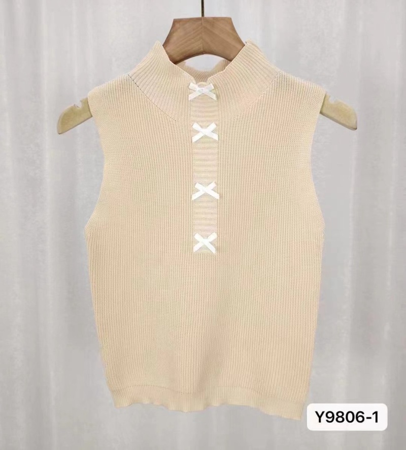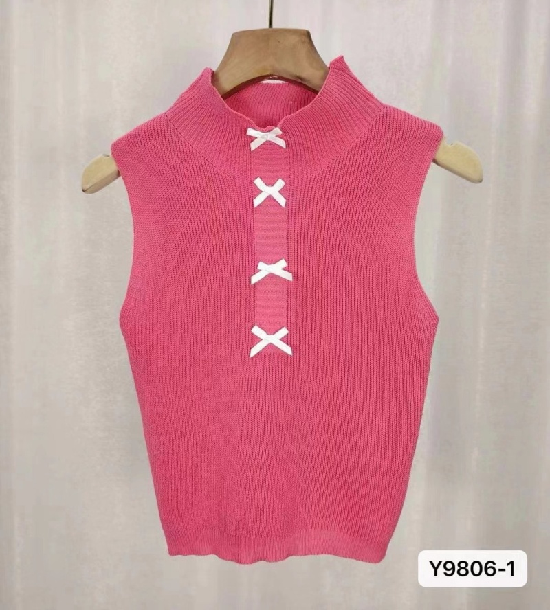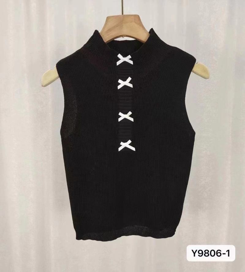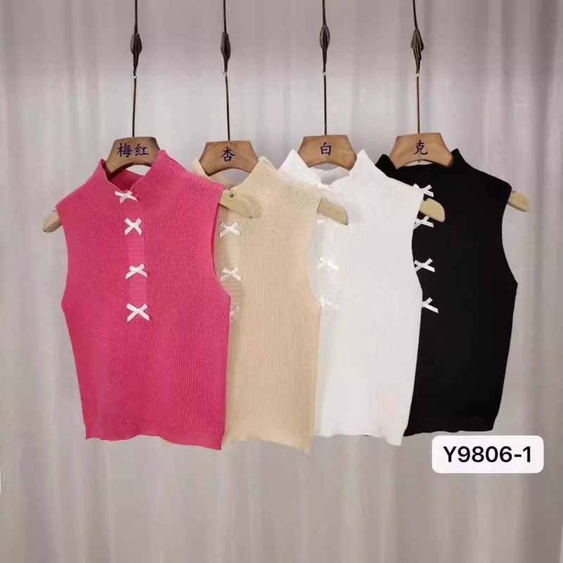 2024夏季新款气质御姐甜美清新修身半高领蝴蝶结排扣显瘦短款背心