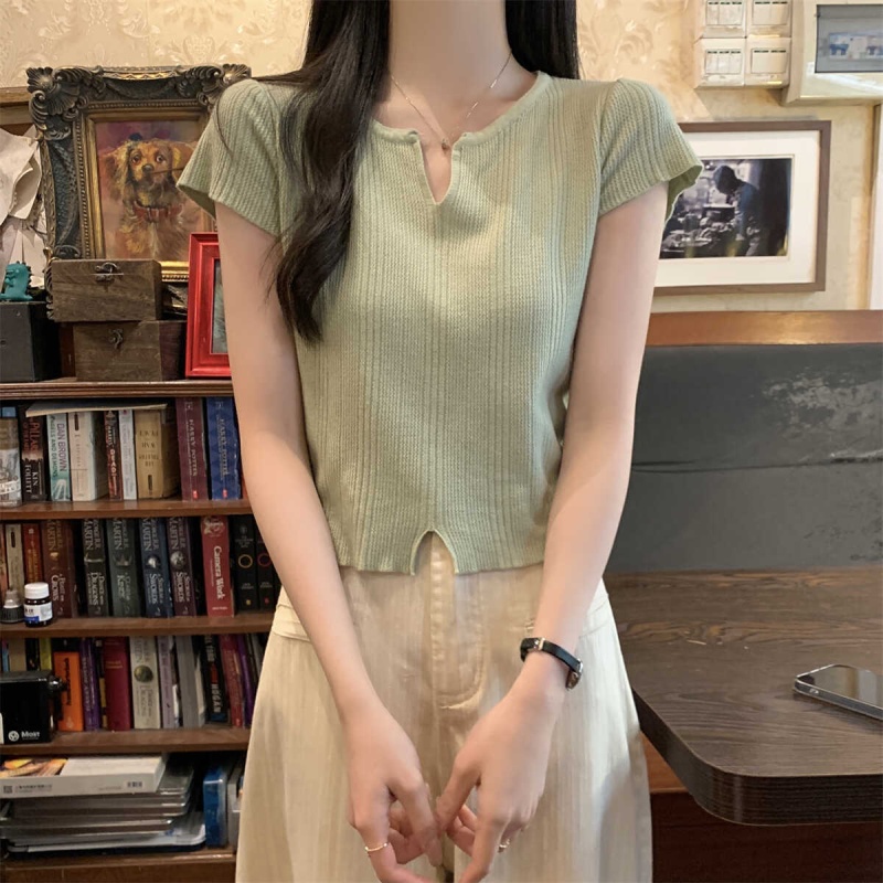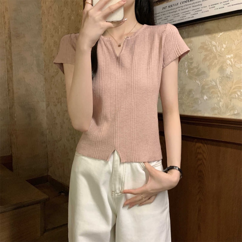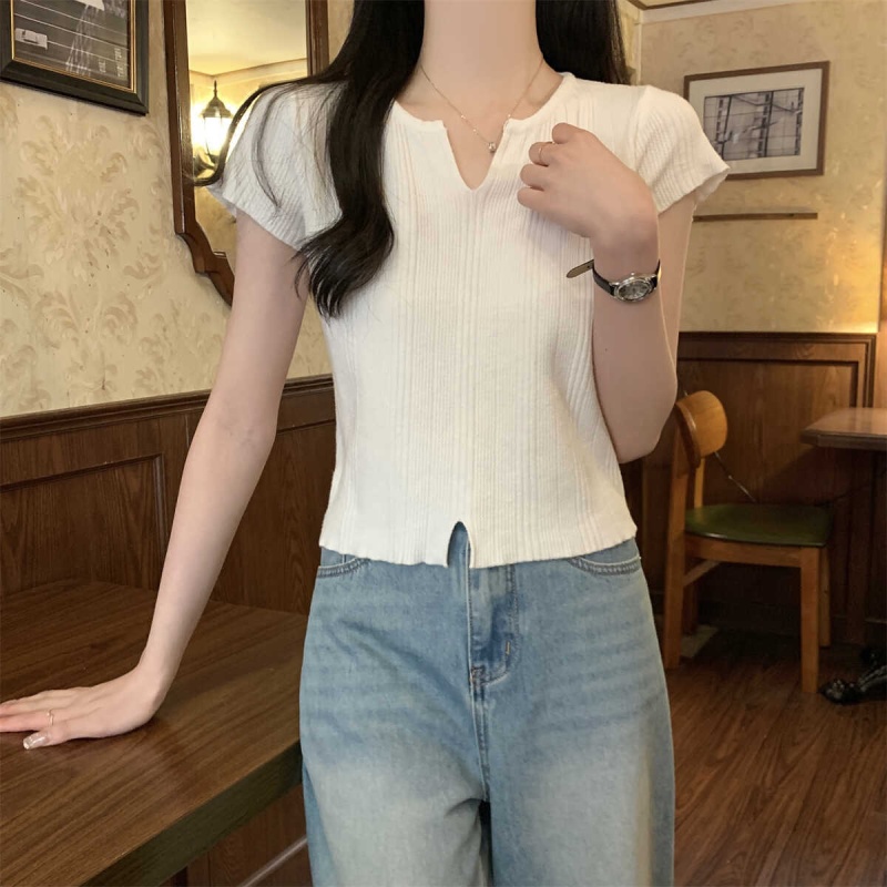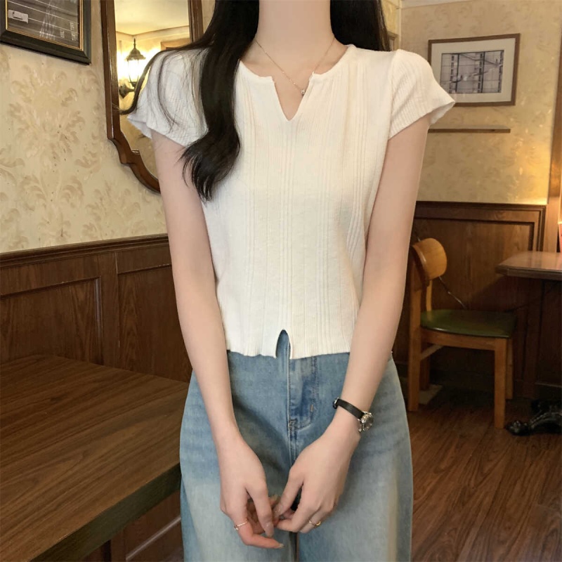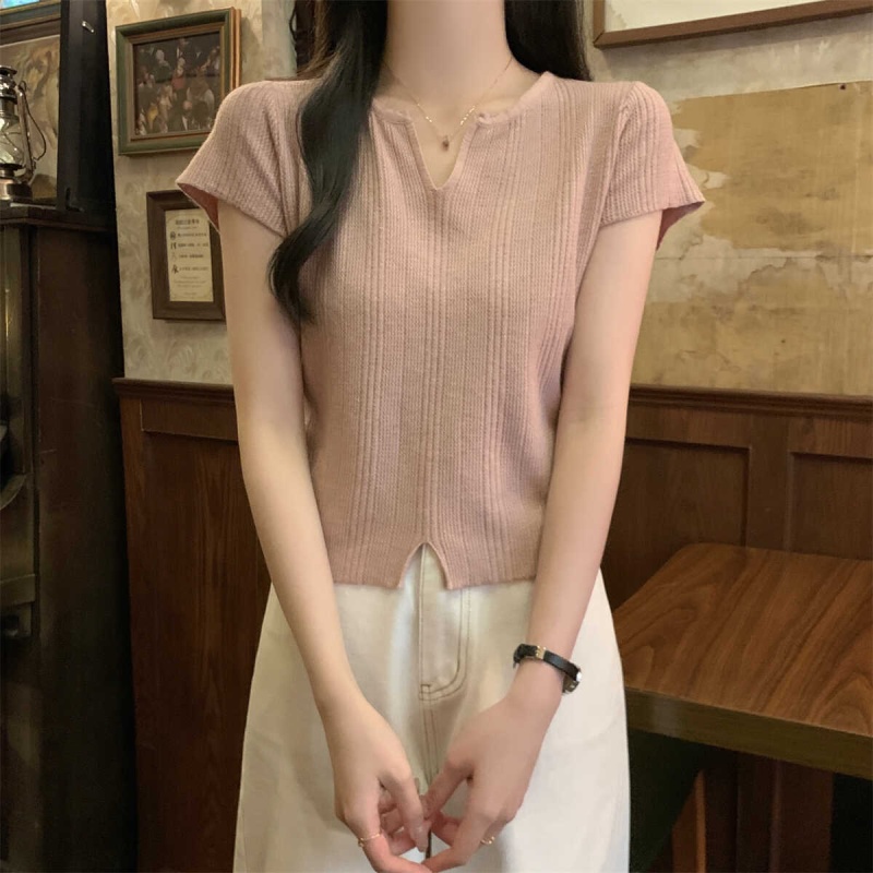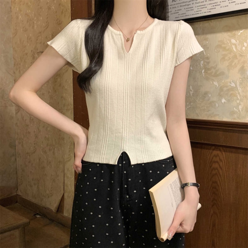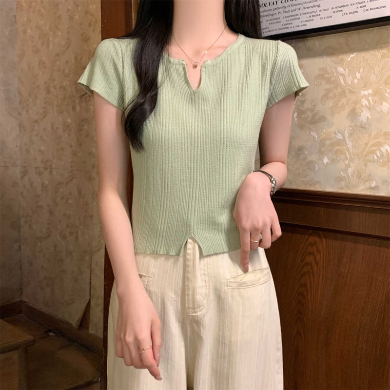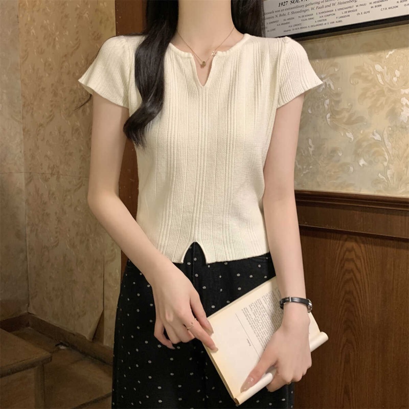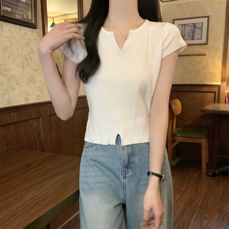 2024夏季新款上下开叉温柔风V领短袖t恤针织衫女短款小个子上衣女