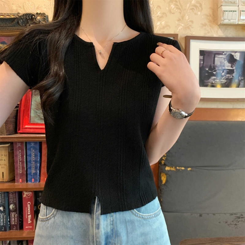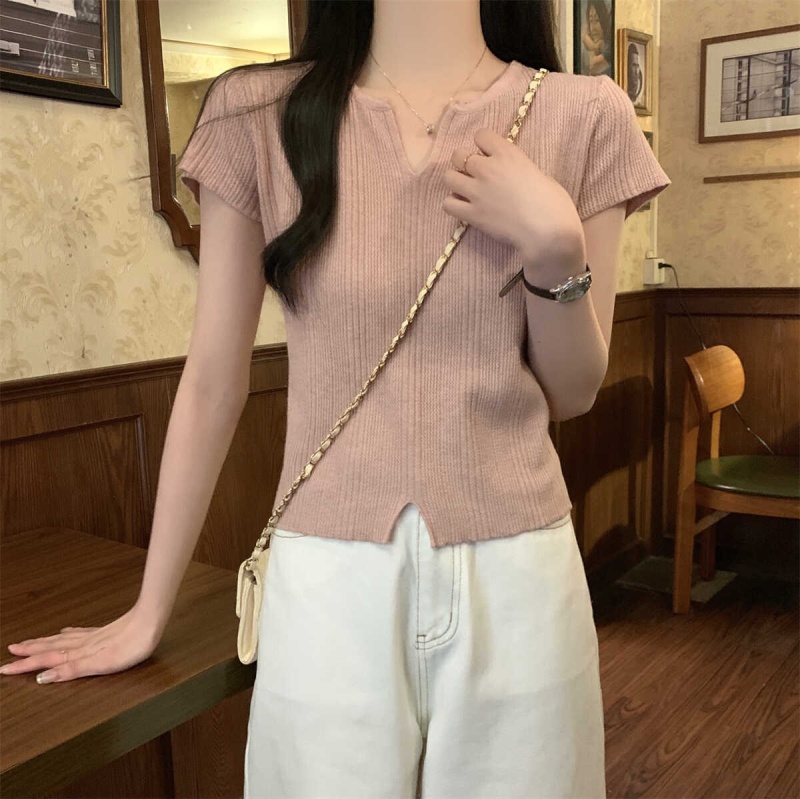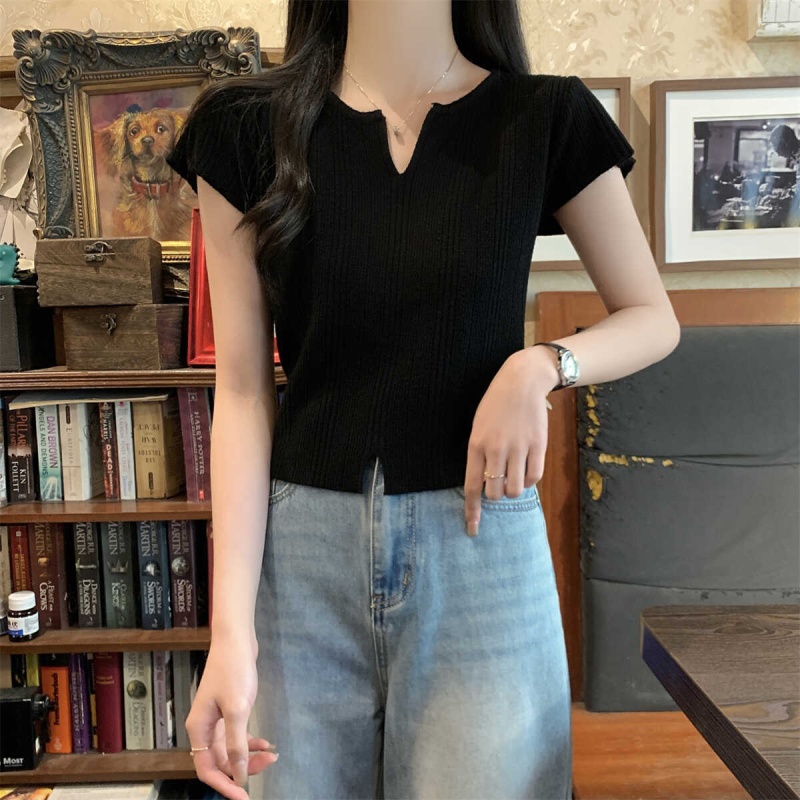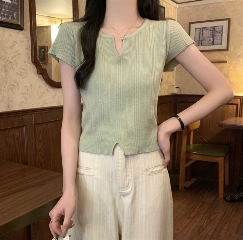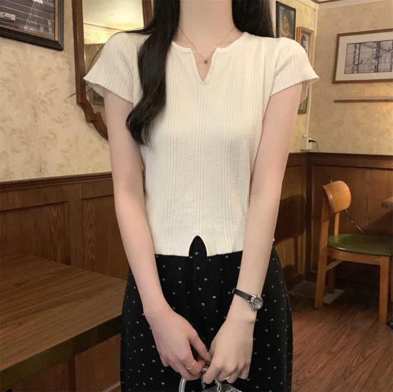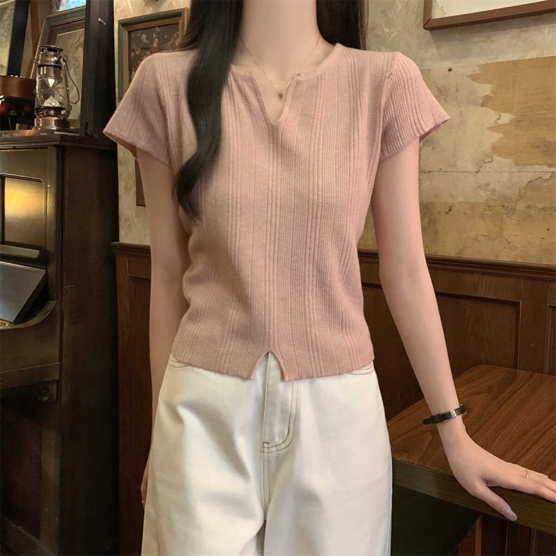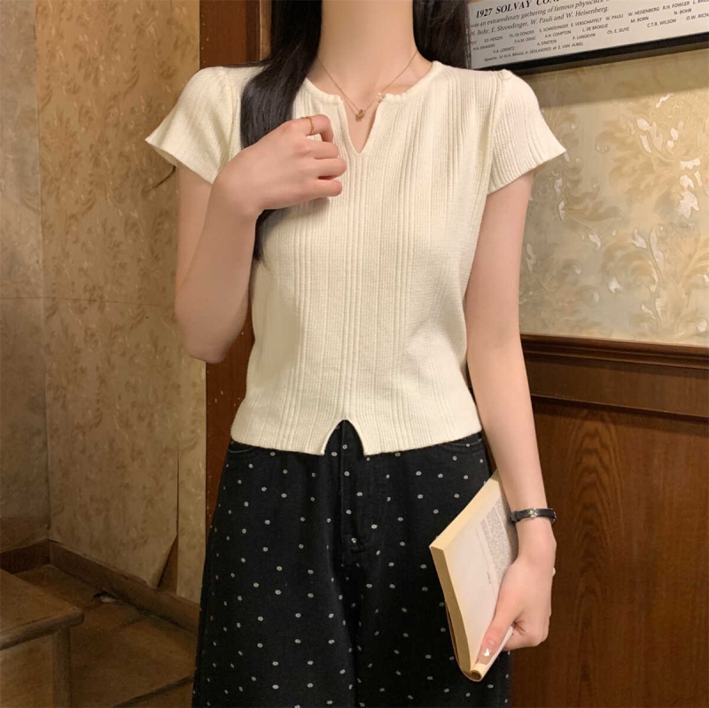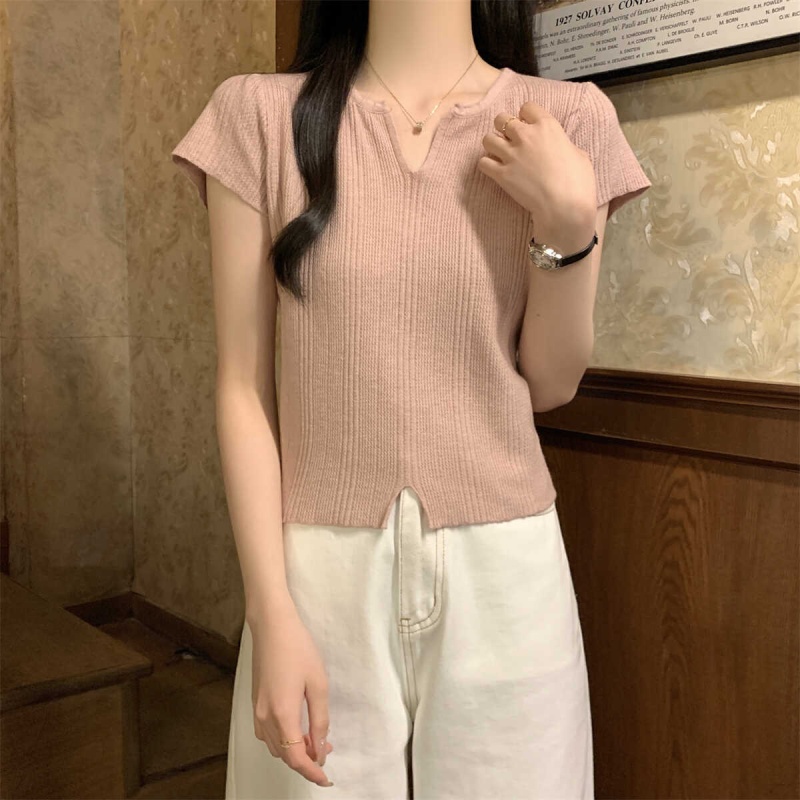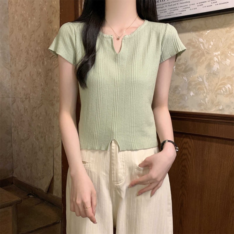 2024夏季新款上下开叉温柔风V领短袖t恤针织衫女短款小个子上衣女