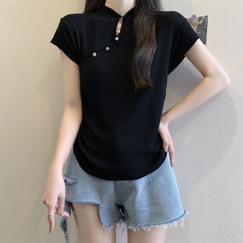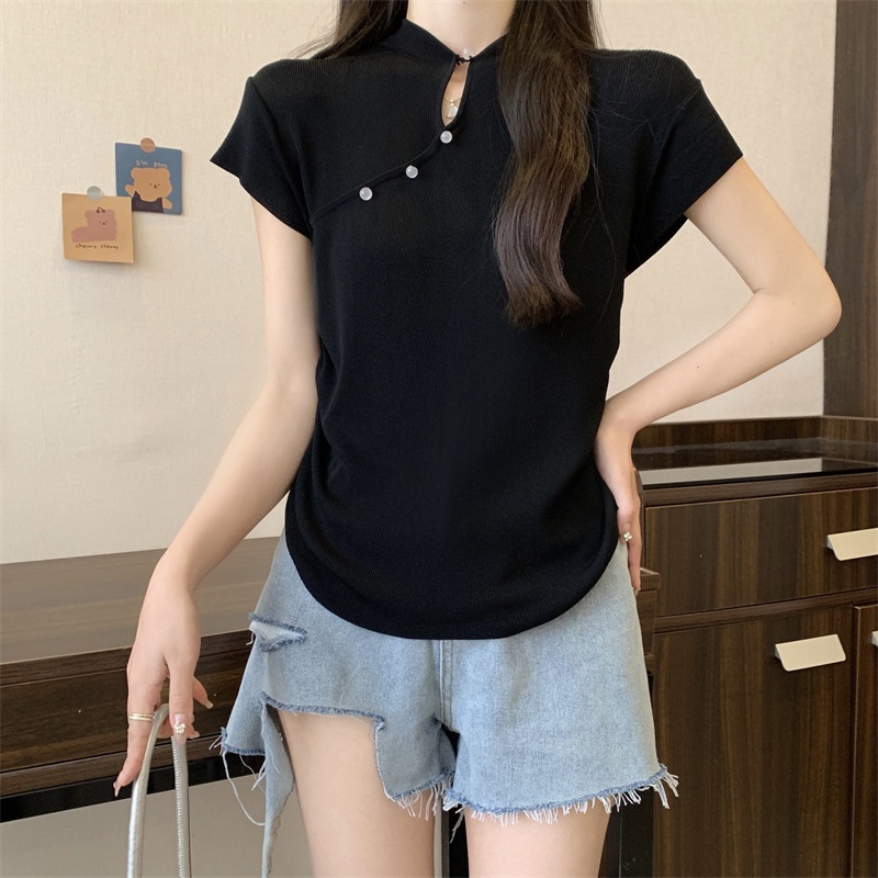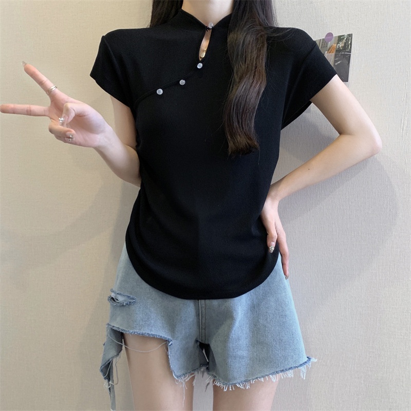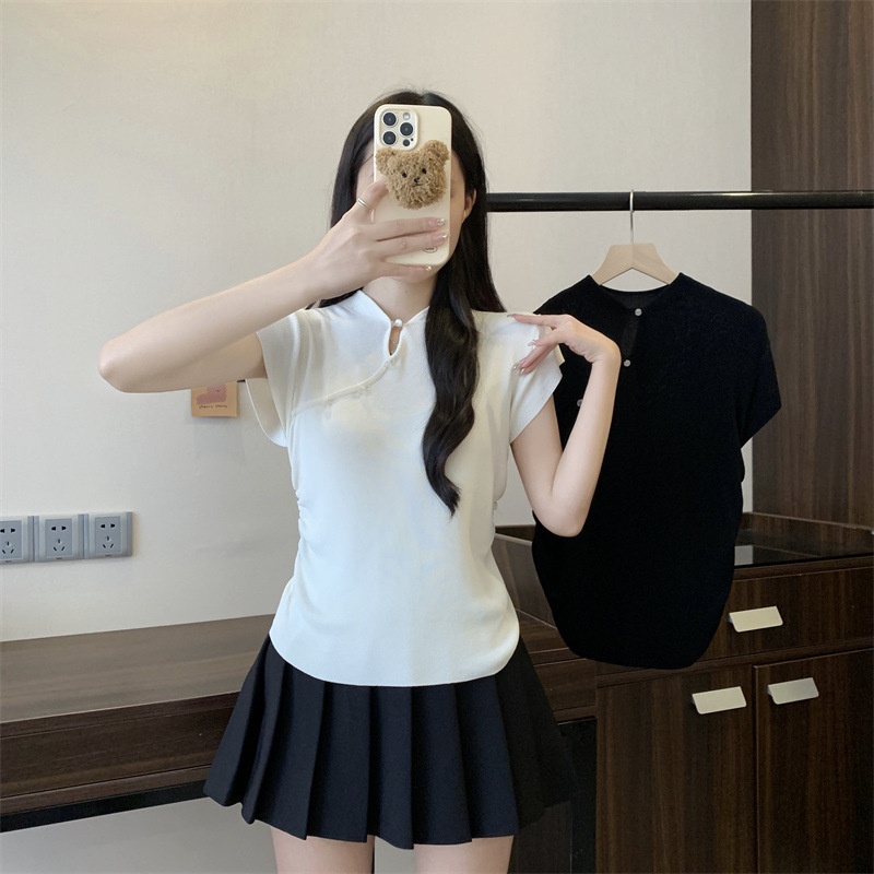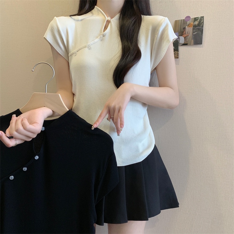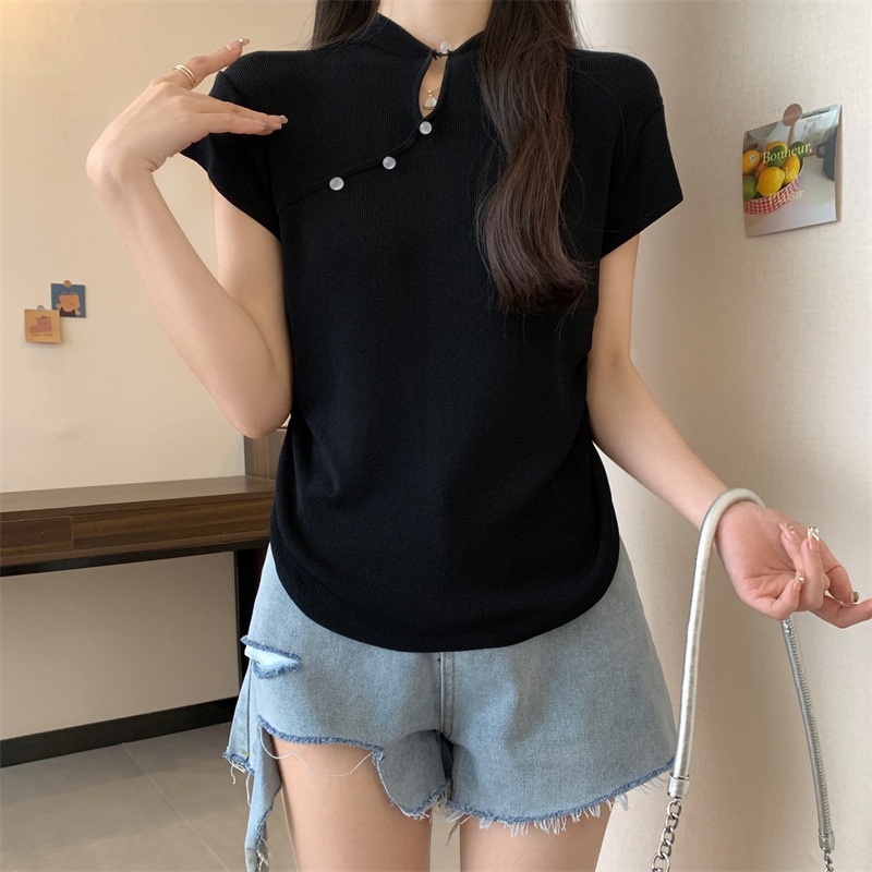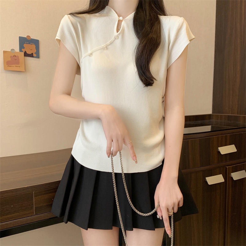 2024夏季新款复古中式小众气质立领斜盘扣螺纹褶皱冰丝针织小衫女