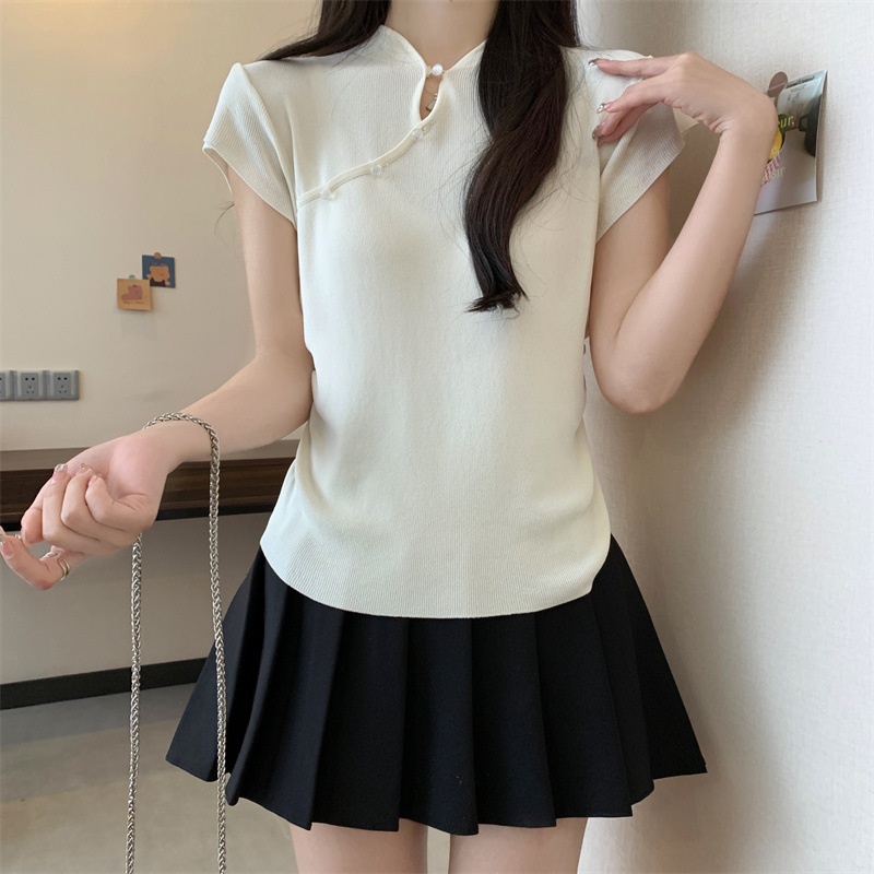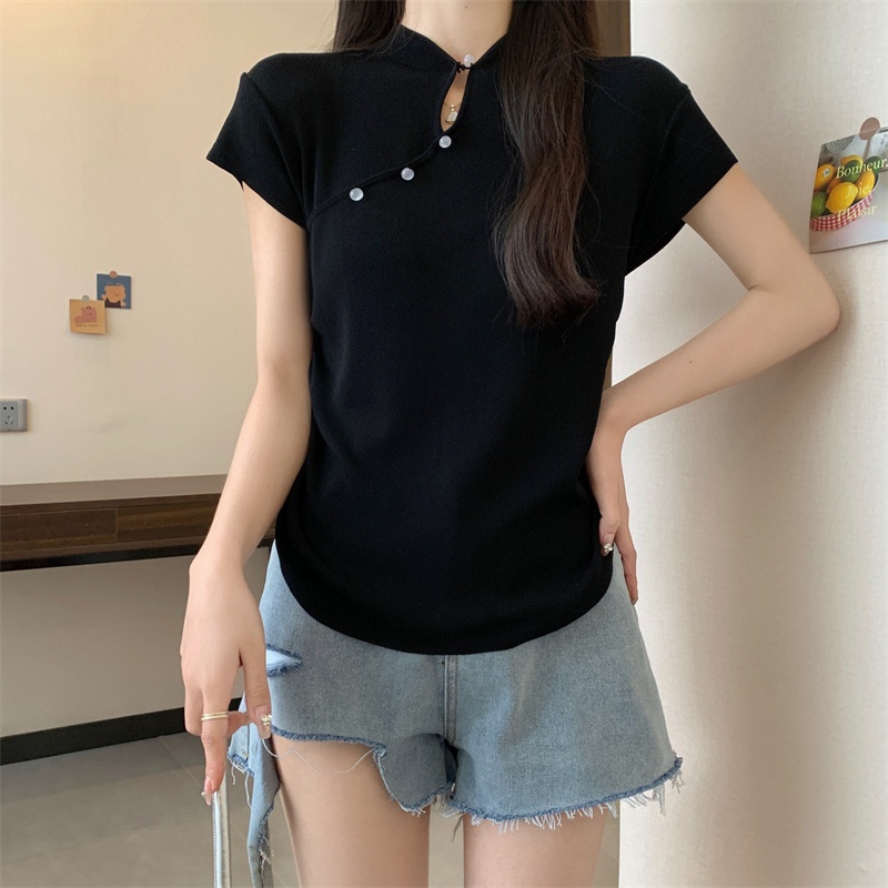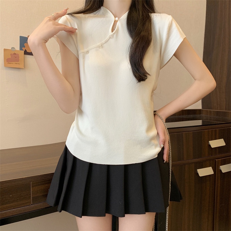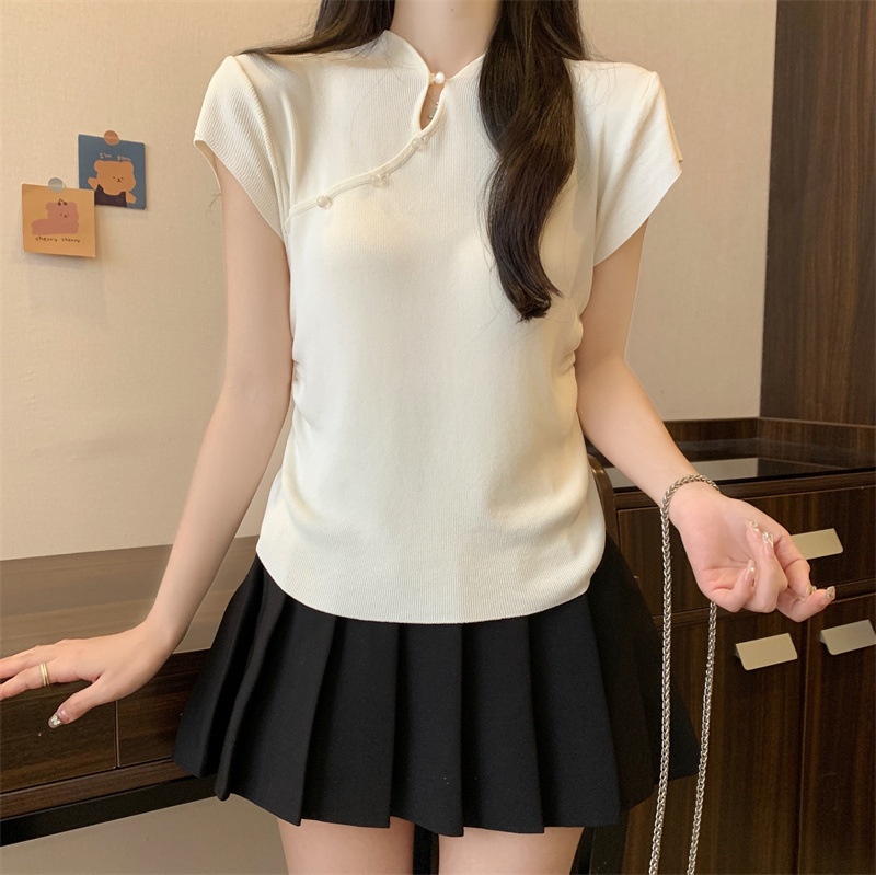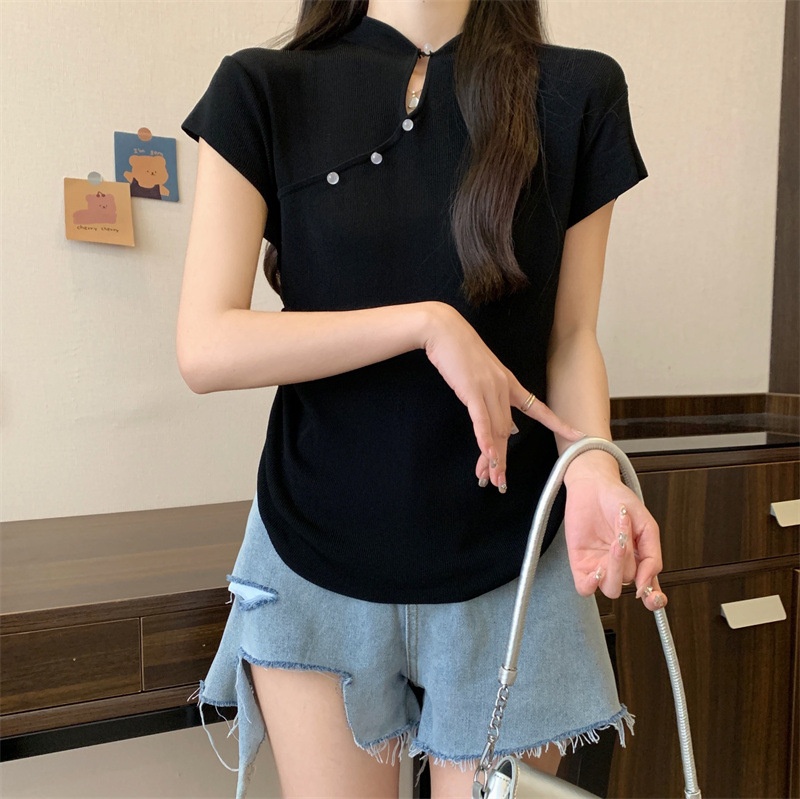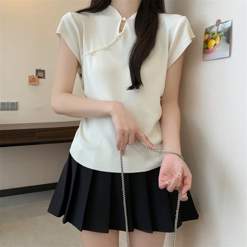 2024夏季新款复古中式小众气质立领斜盘扣螺纹褶皱冰丝针织小衫女