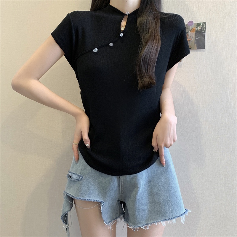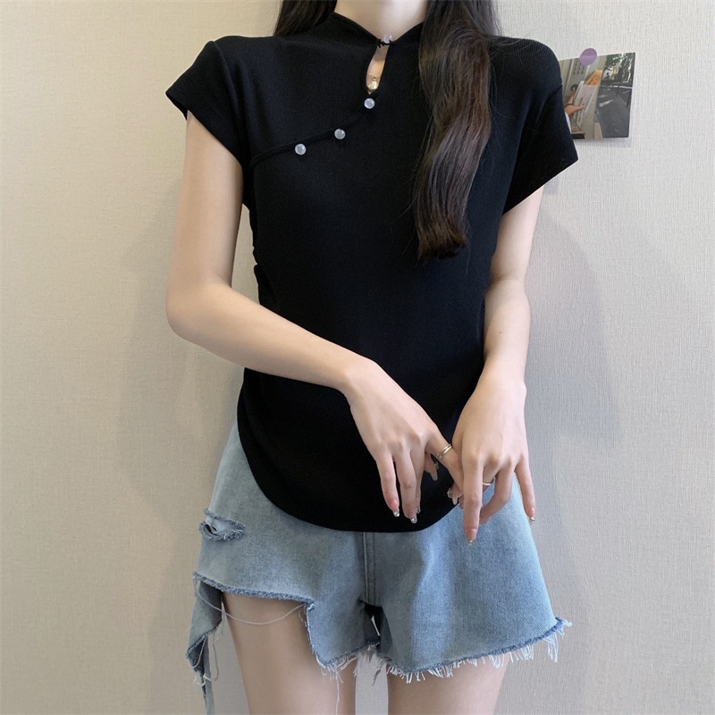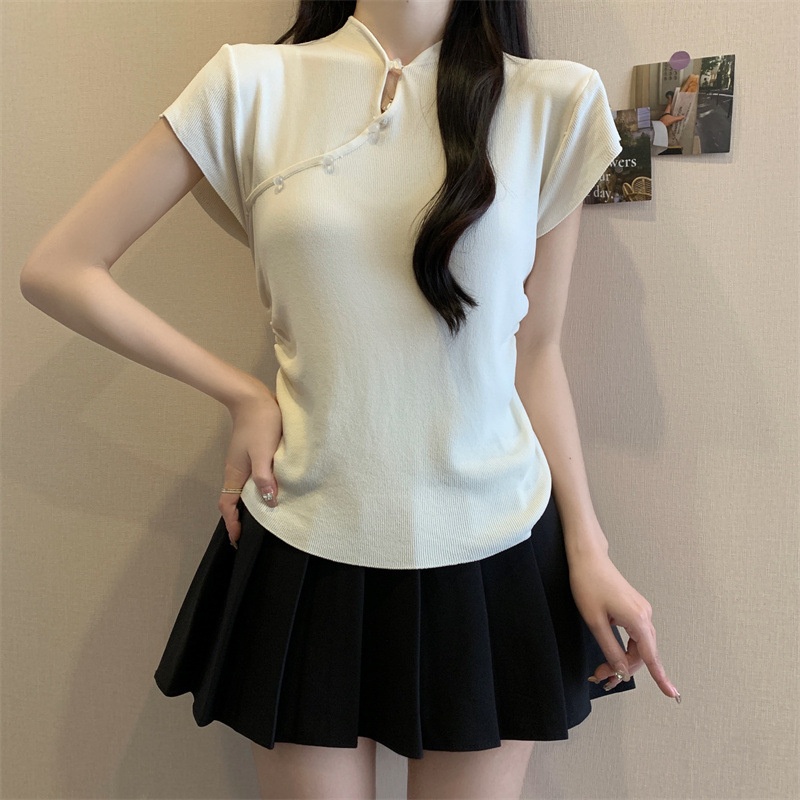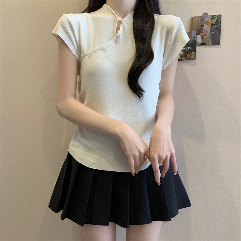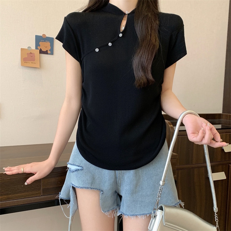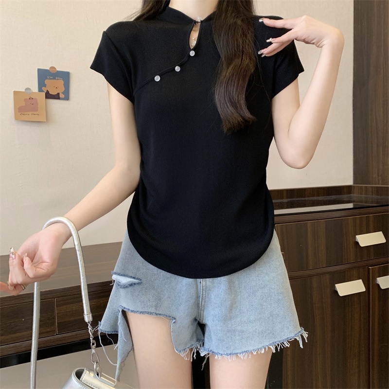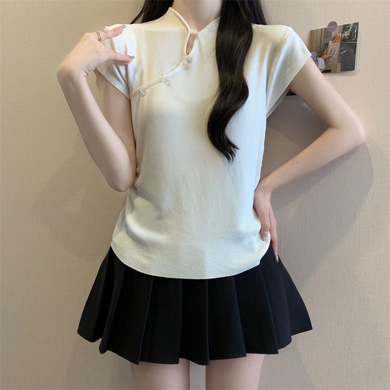 2024夏季新款复古中式小众气质立领斜盘扣螺纹褶皱冰丝针织小衫女