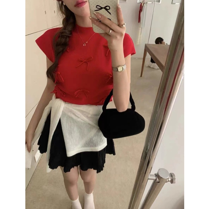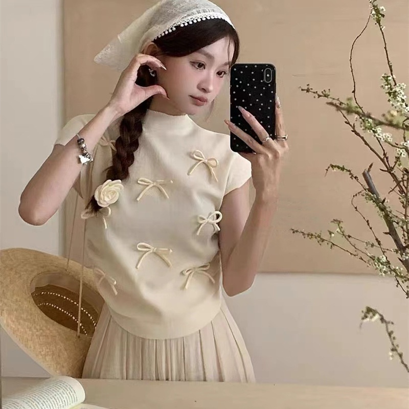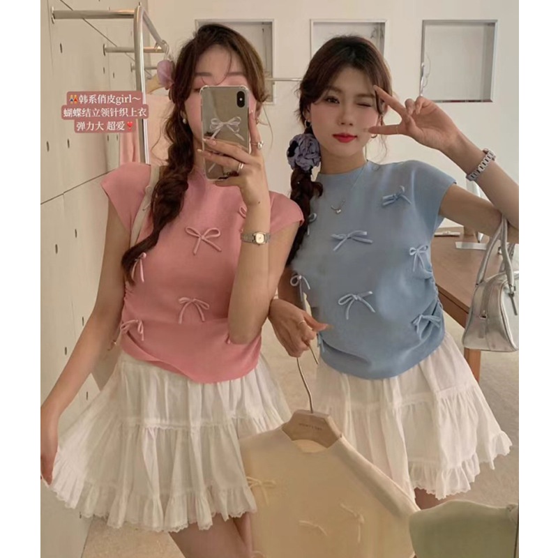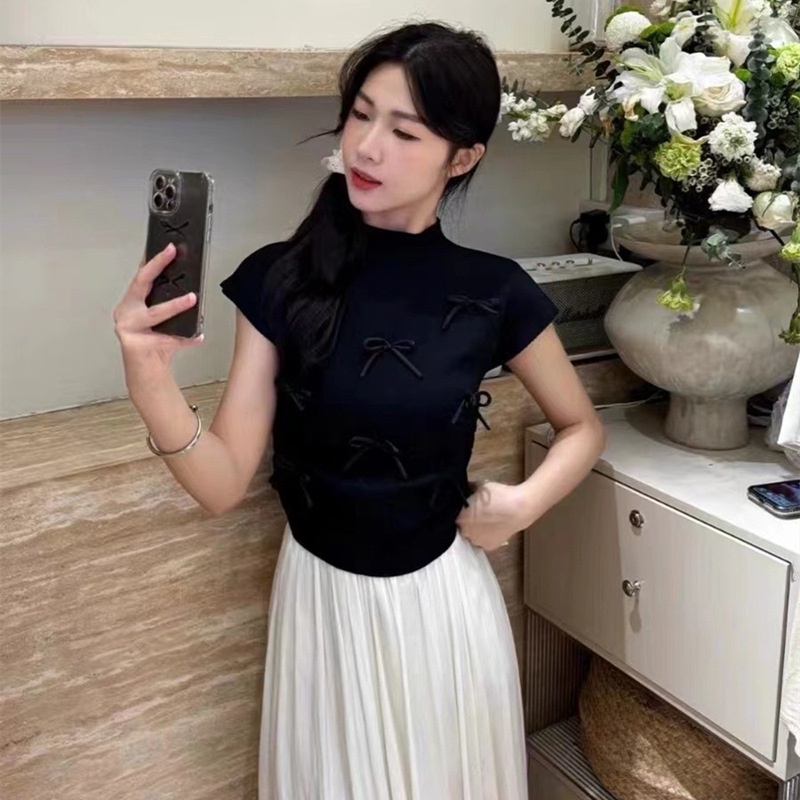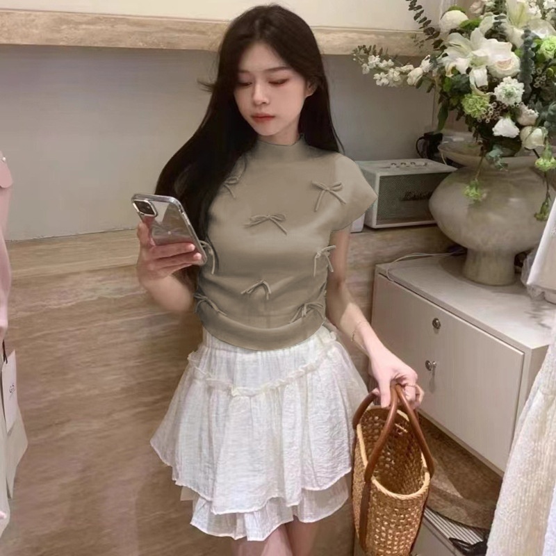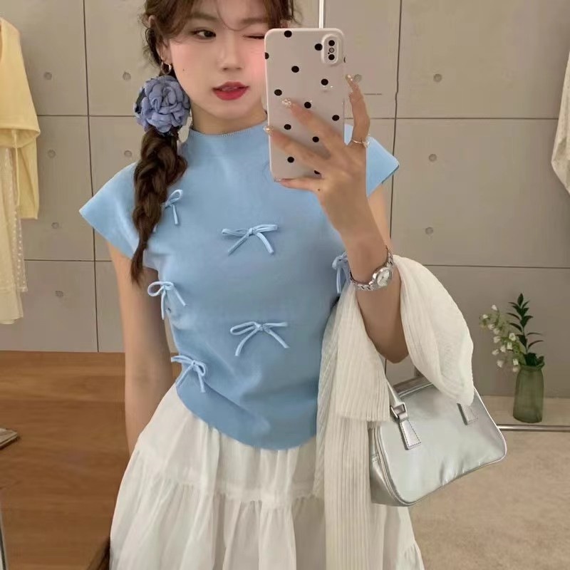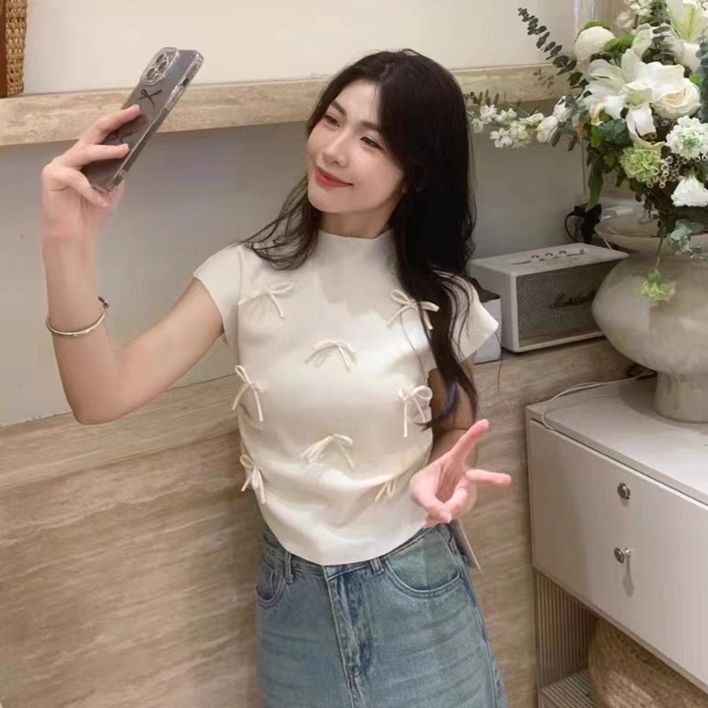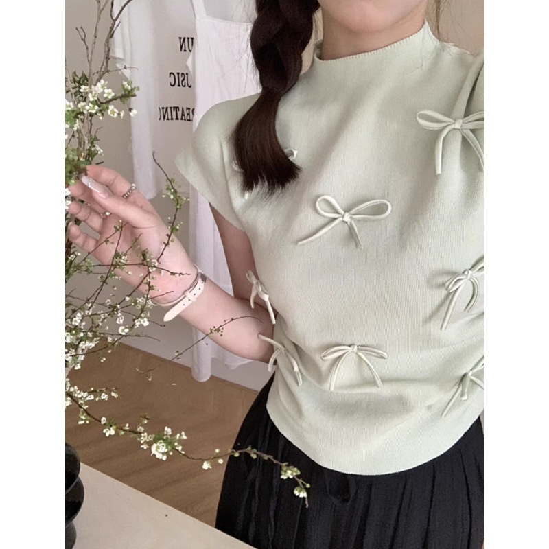 韩系温柔气质立体蝴蝶结半高领飞飞袖针织衫女夏百搭显瘦短袖T恤