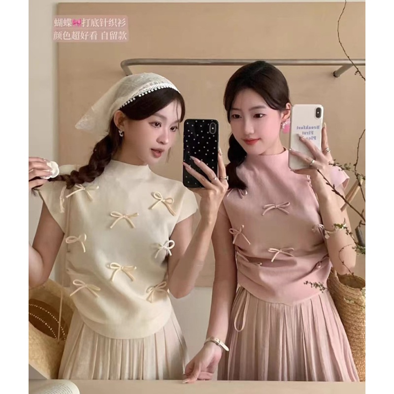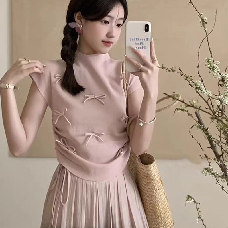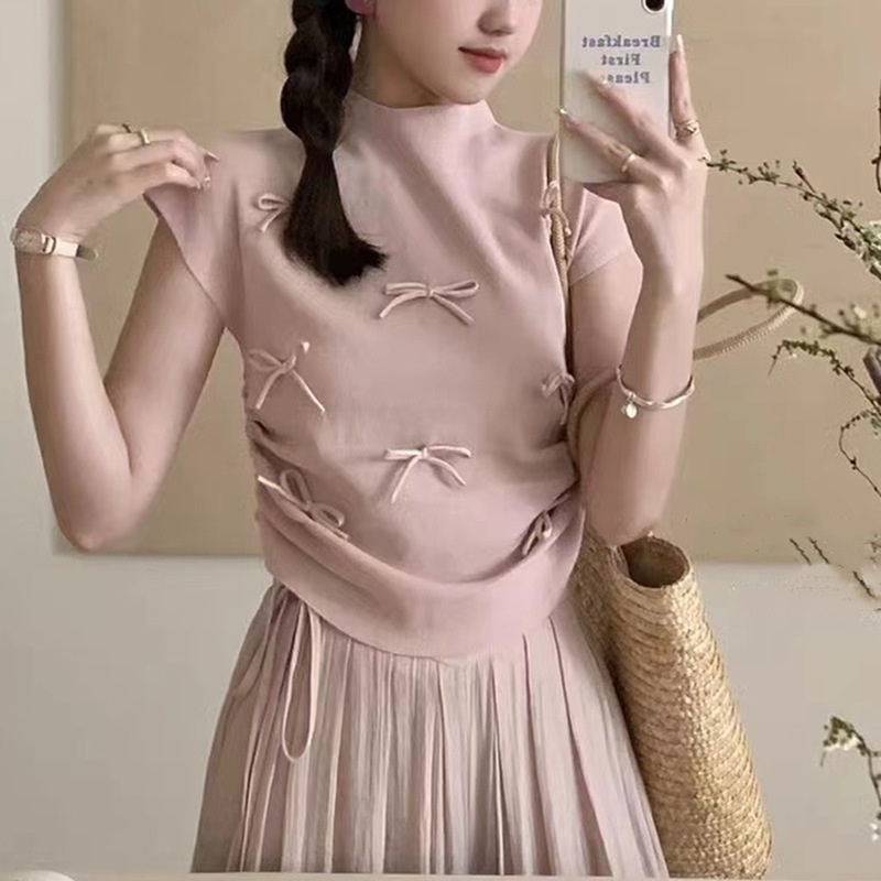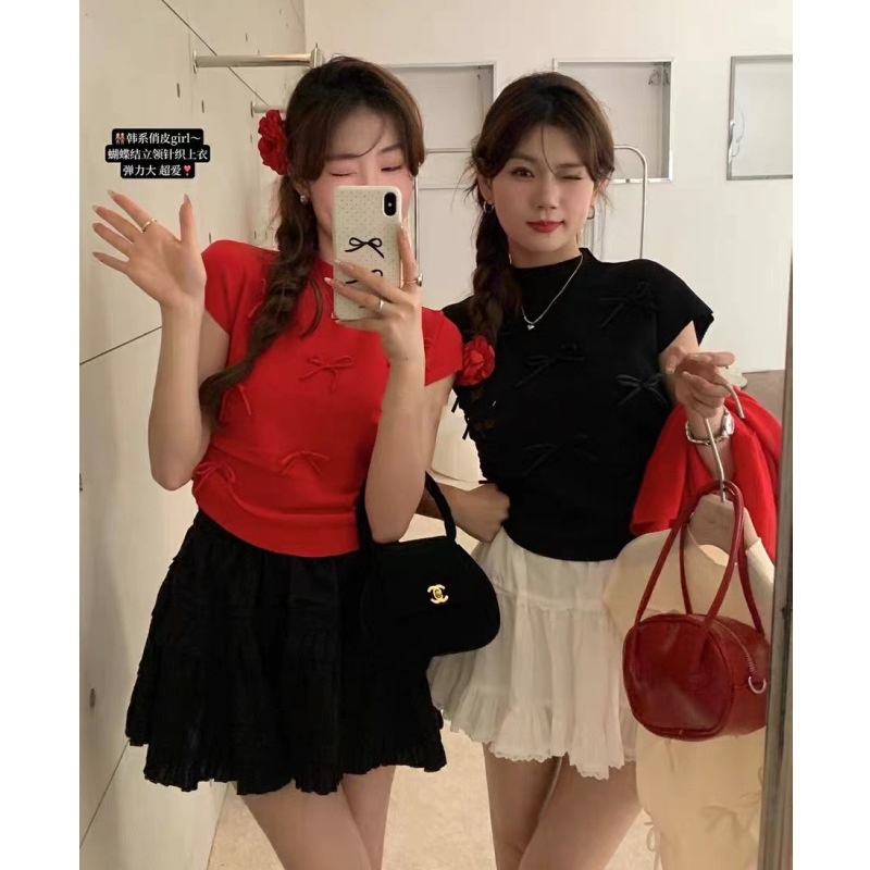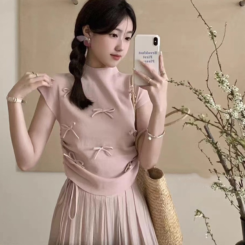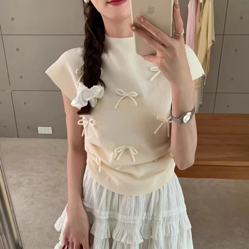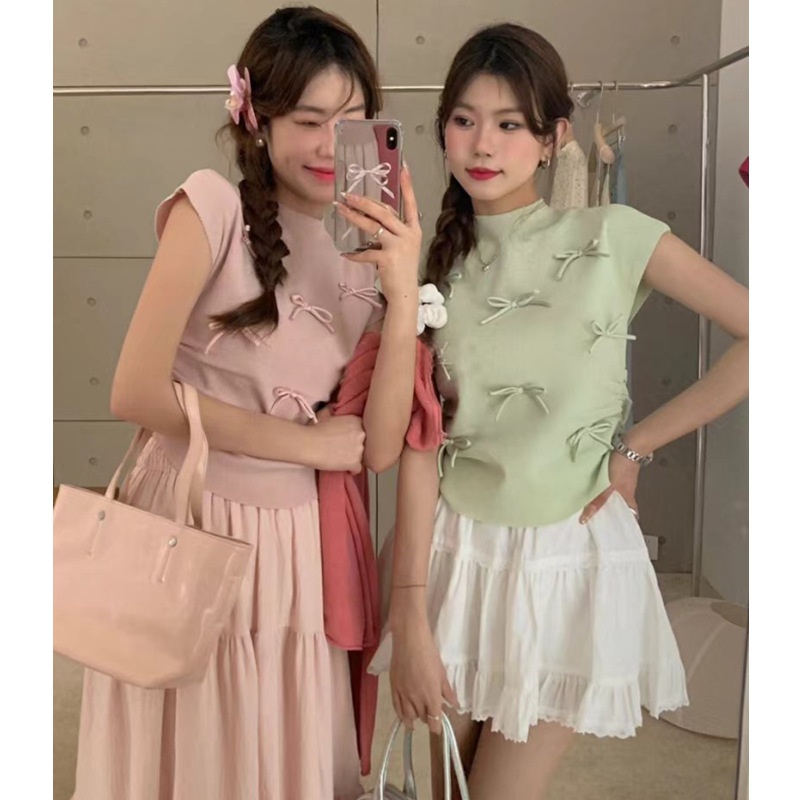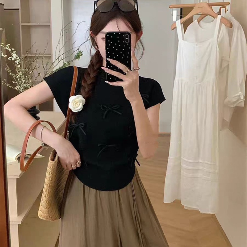 韩系温柔气质立体蝴蝶结半高领飞飞袖针织衫女夏百搭显瘦短袖T恤