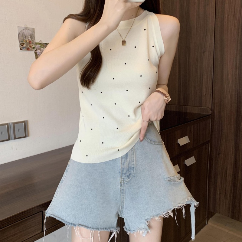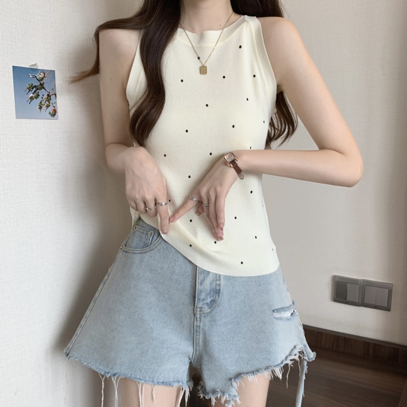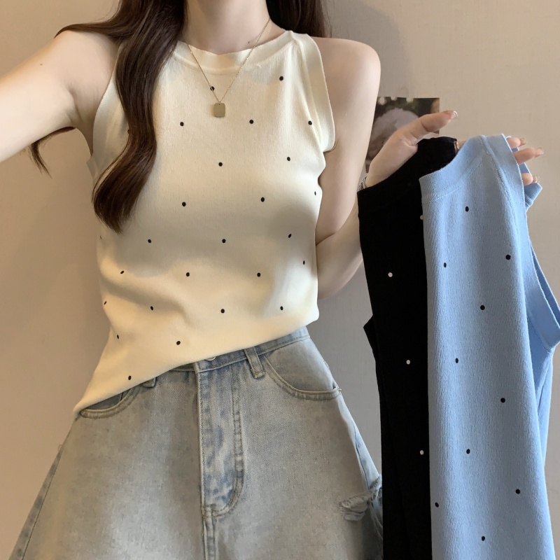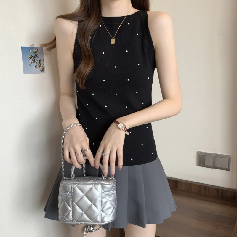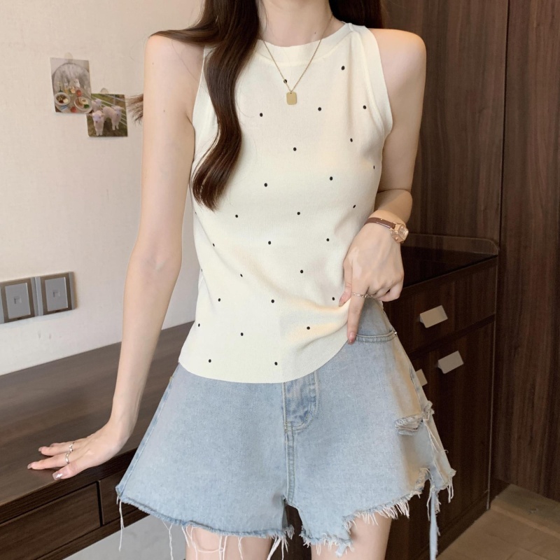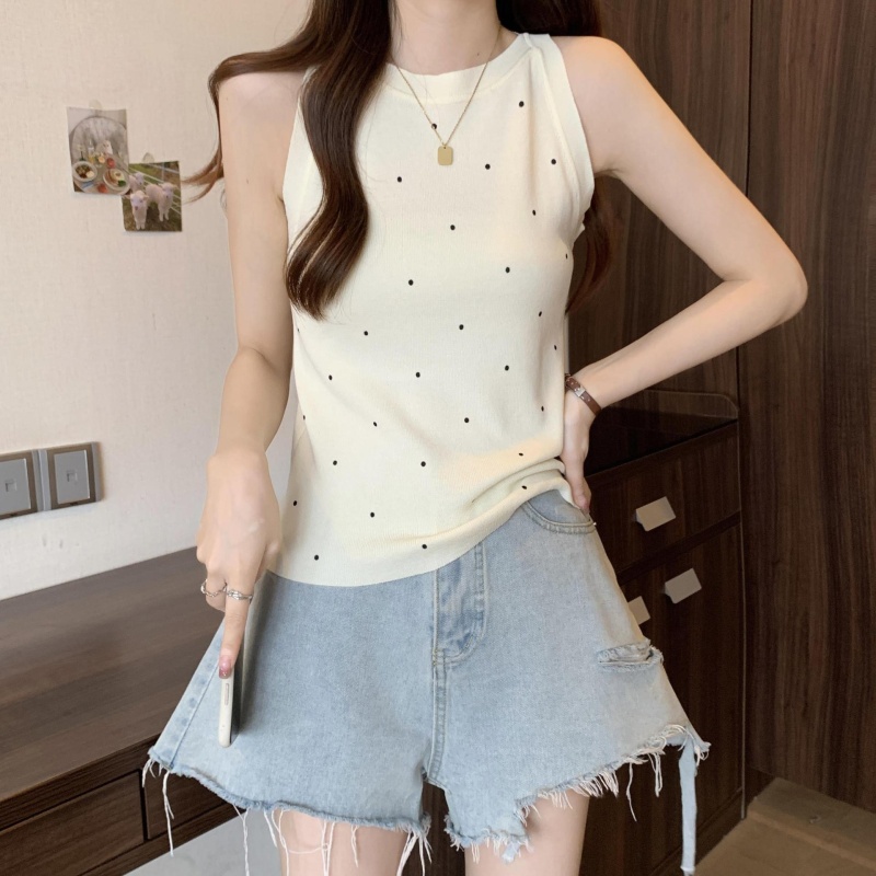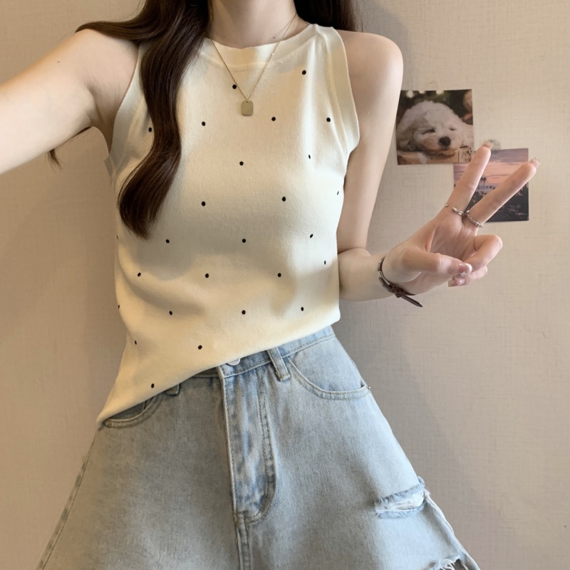 2024夏季复古风圆领套头无袖显瘦波点杏色休闲针织衫背心上衣女潮