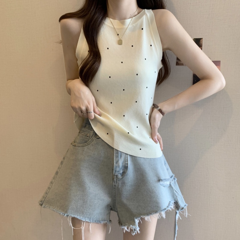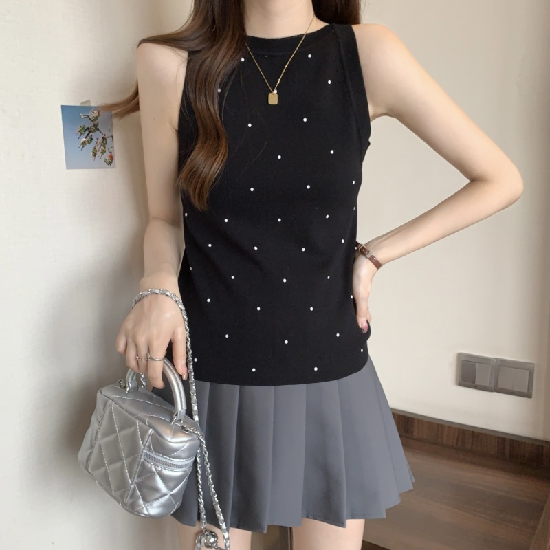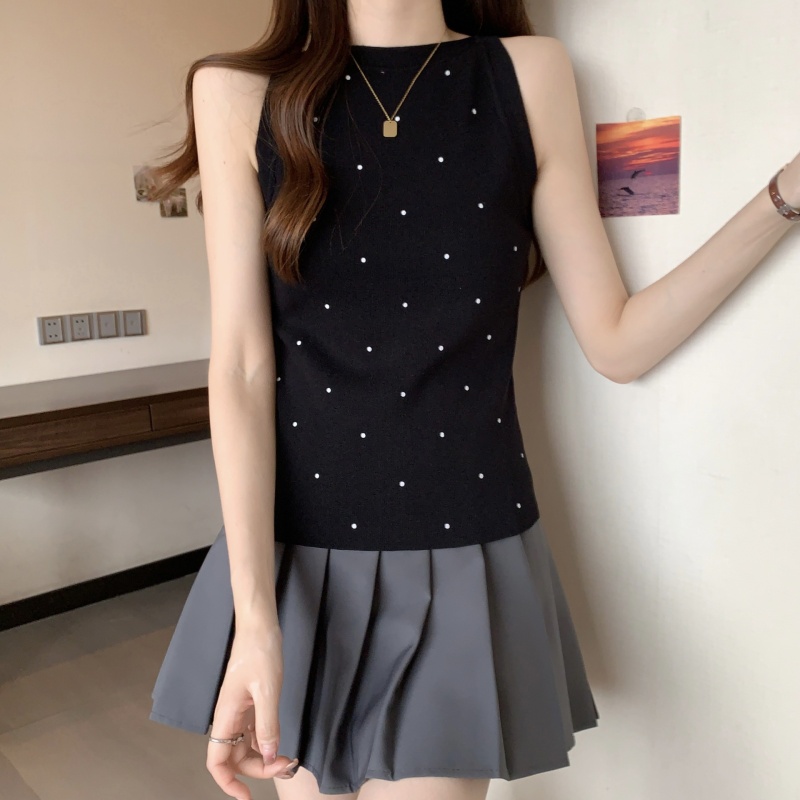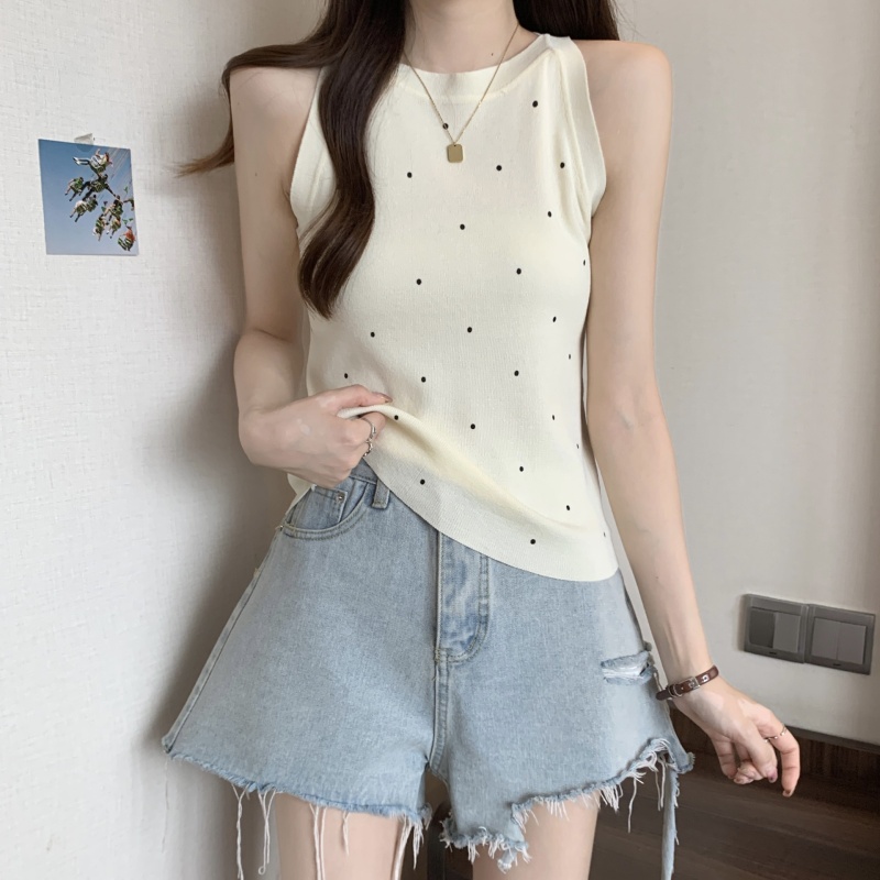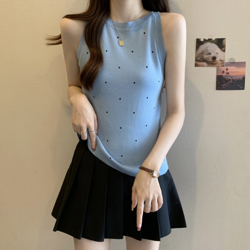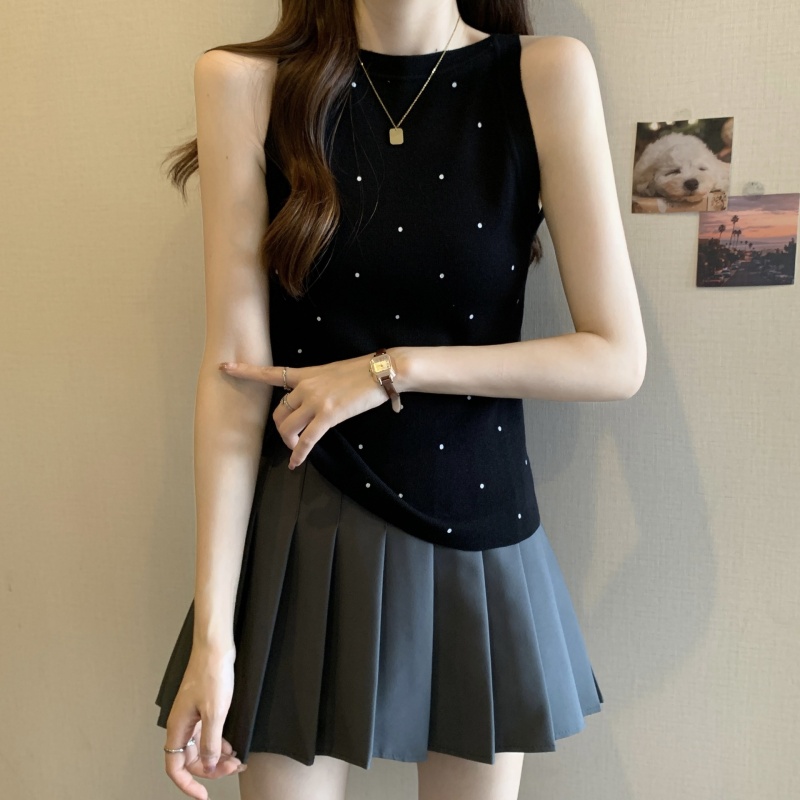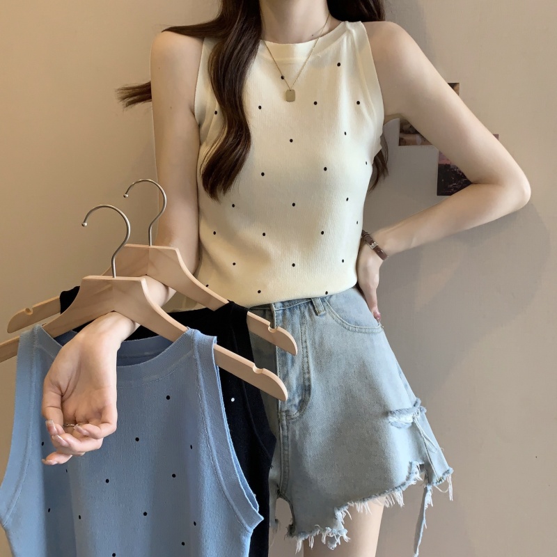 2024夏季复古风圆领套头无袖显瘦波点杏色休闲针织衫背心上衣女潮